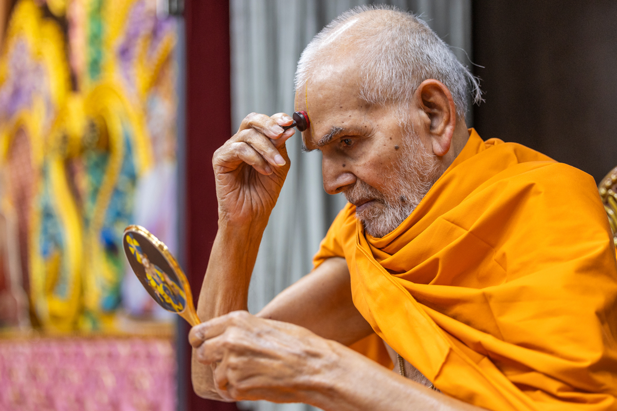 Swamishri applies a tilak on his forehead