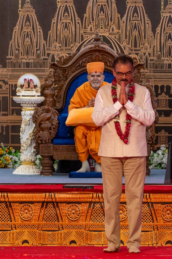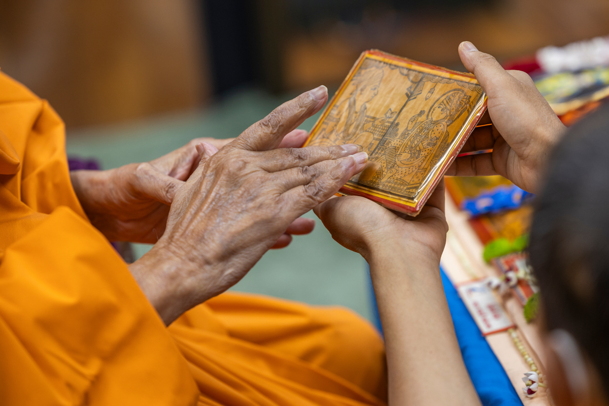 A devotee presents before Swamishri