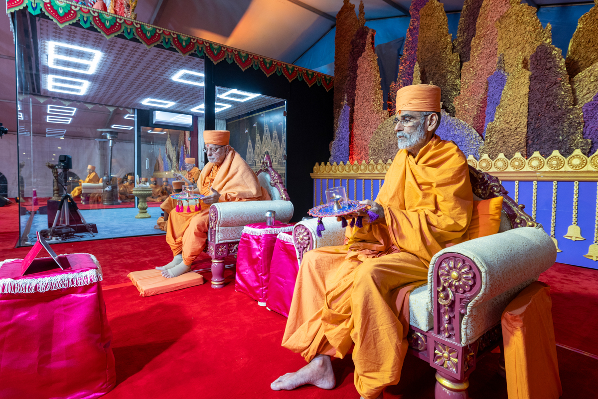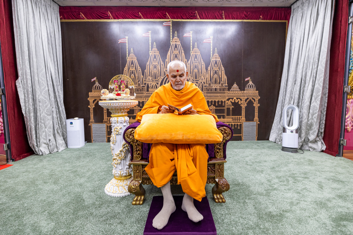 Swamishri listens to the sadhana mantra and daily prayer
