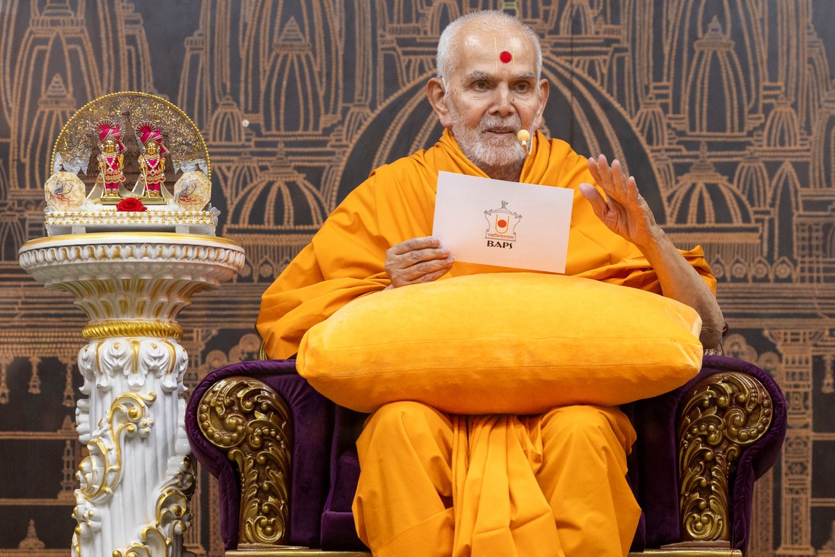 Swamishri displays a message for Dhanurmas
