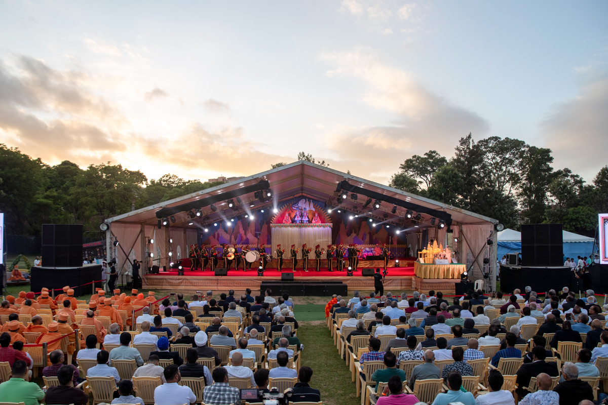 Aerial view of the Nairobi Mandir Silver Jubilee celebration assembly in the evening