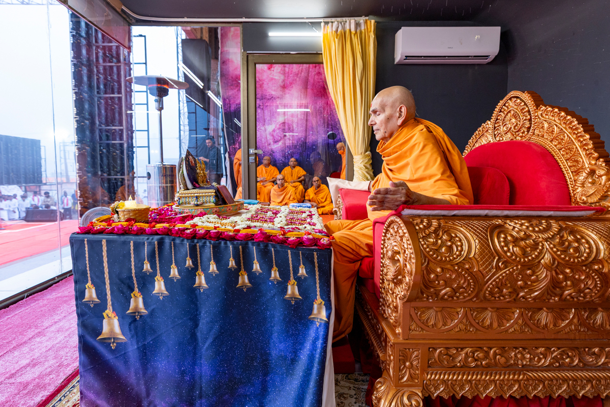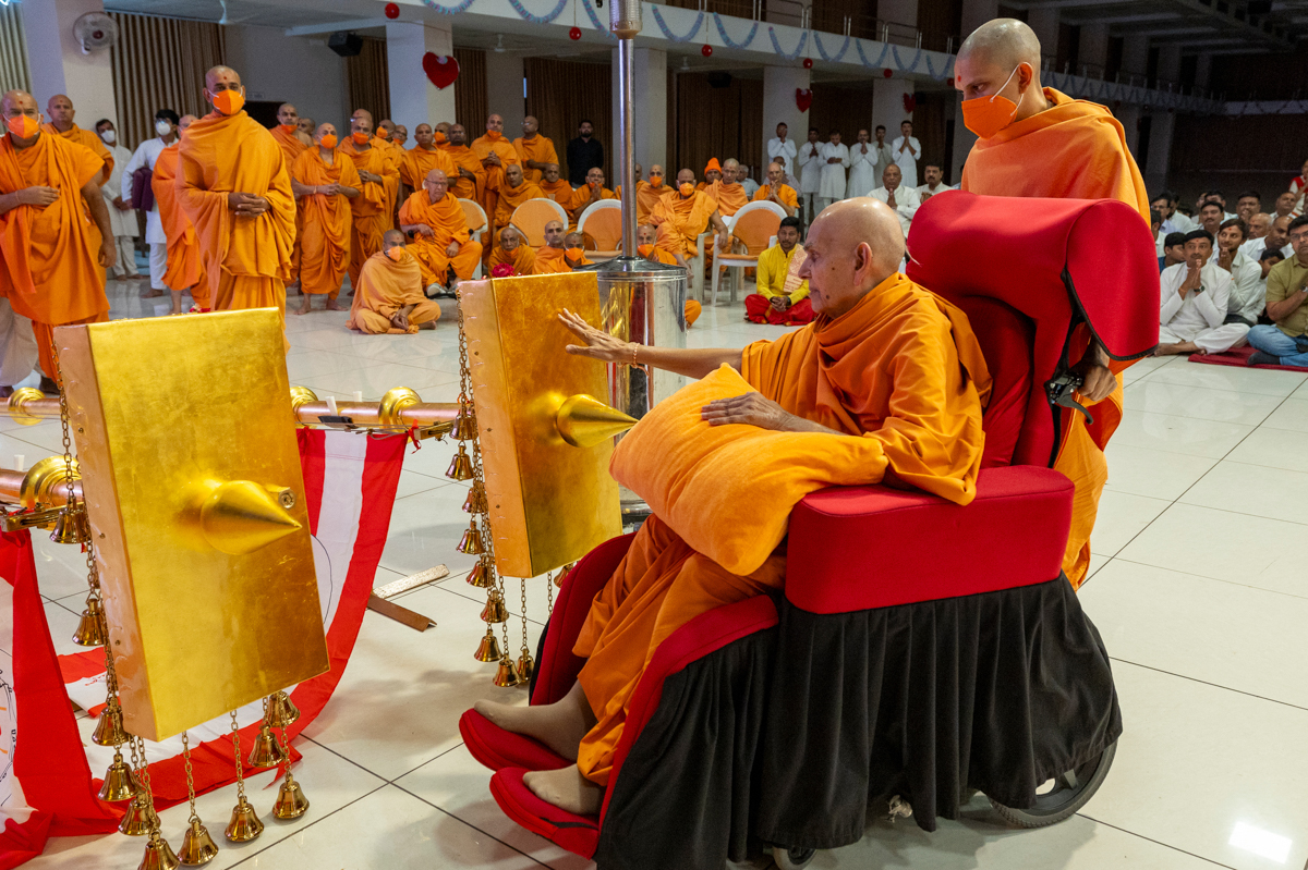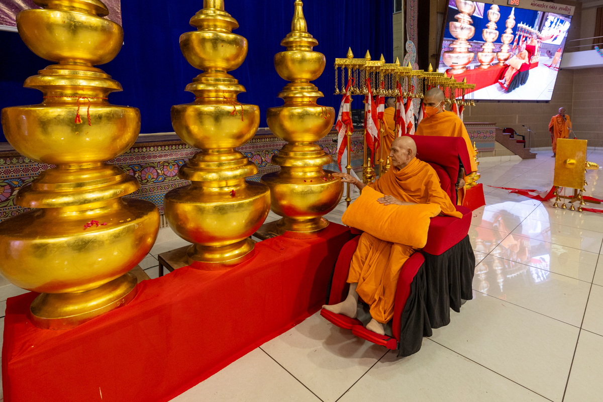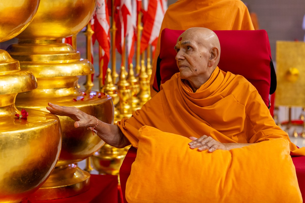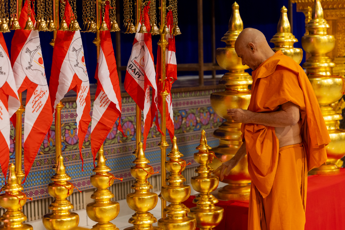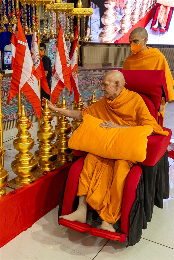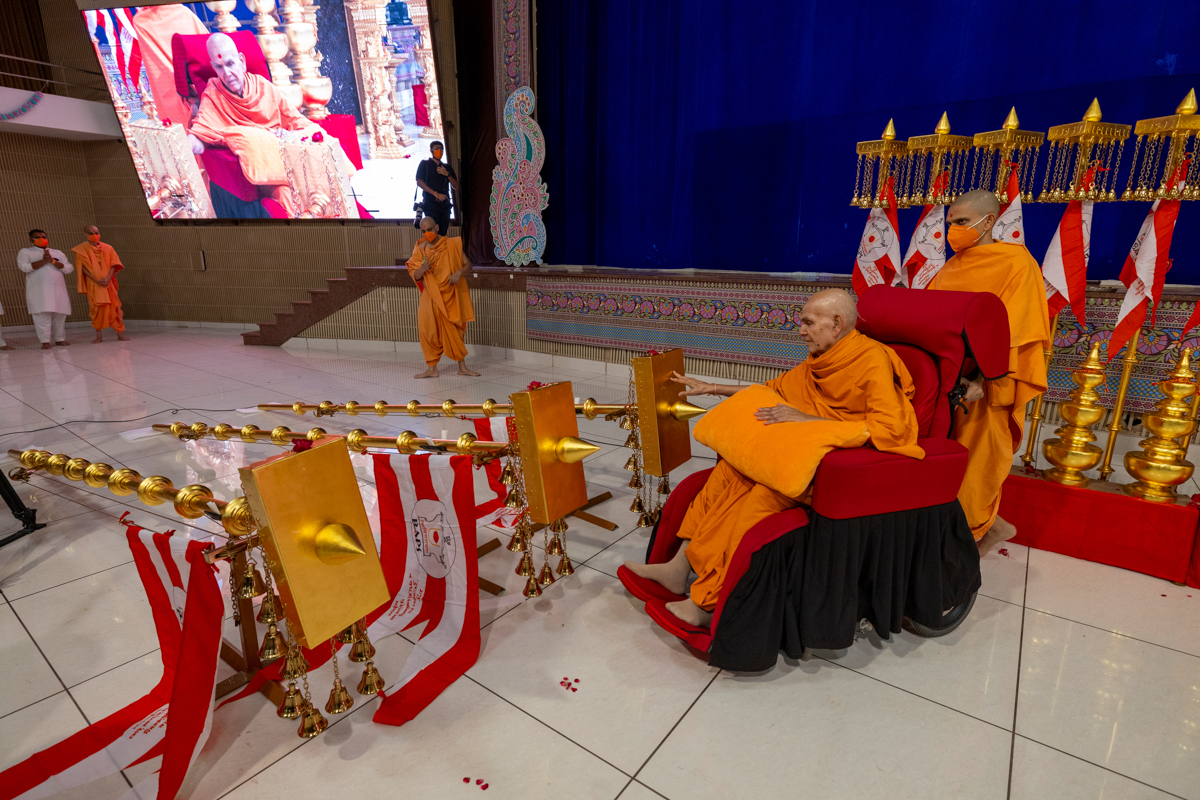 Swamishri arrives to perform pujan of kalashes and flagstaffs