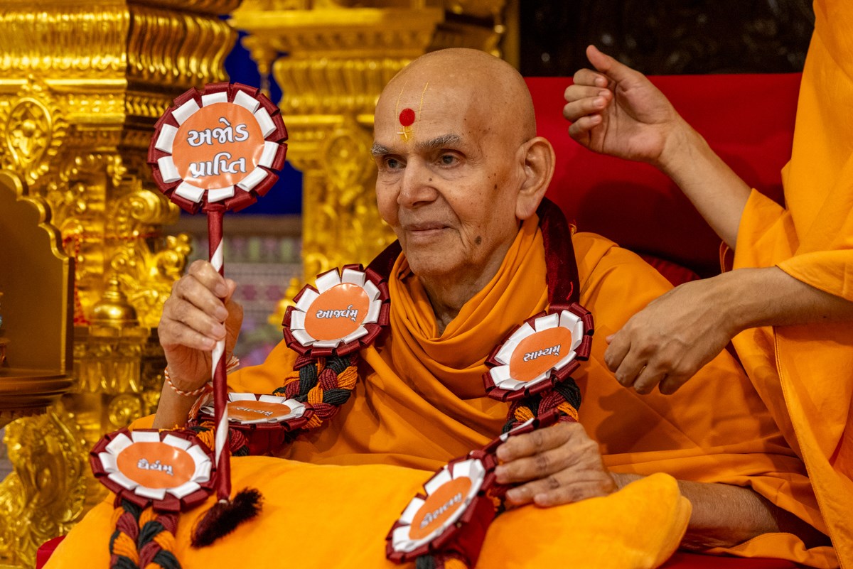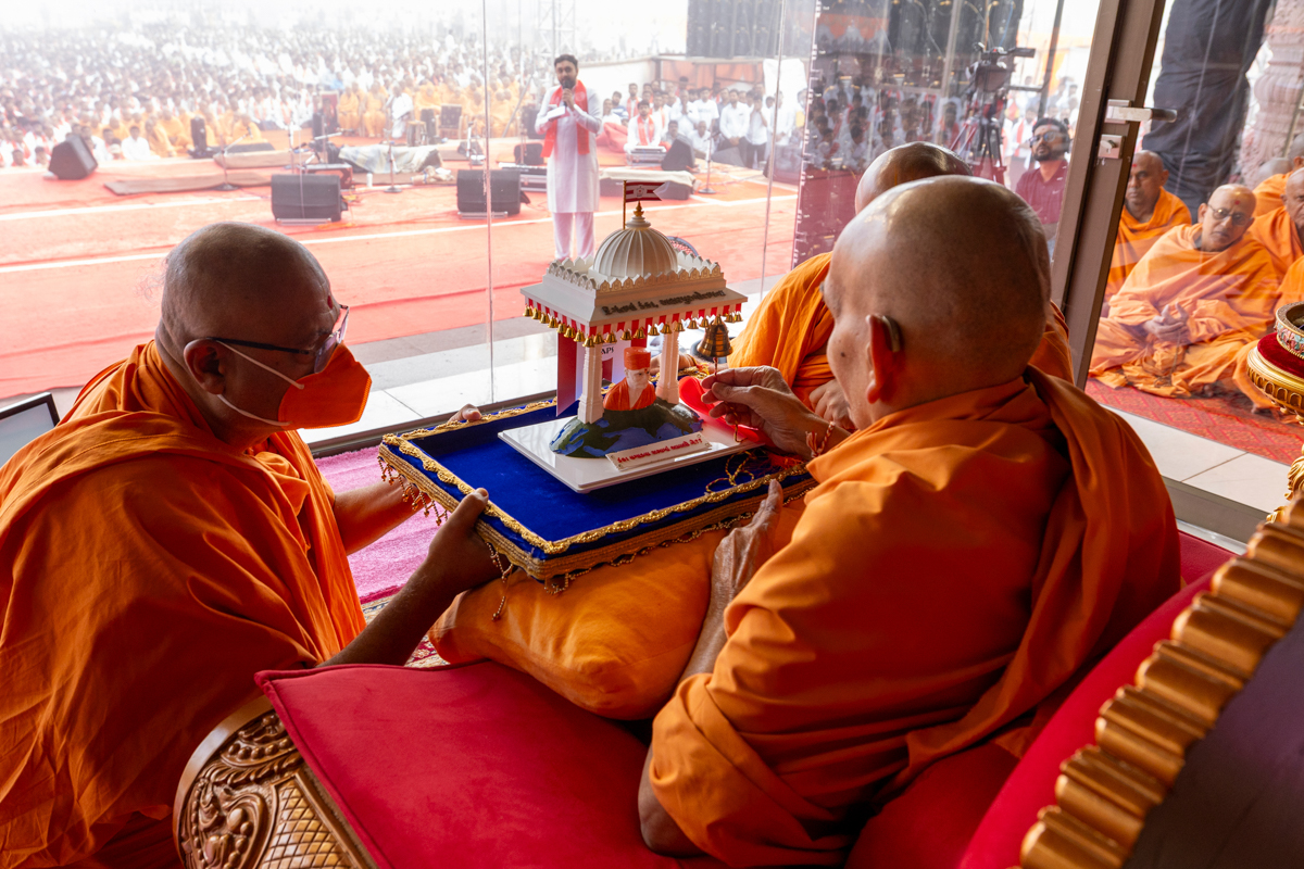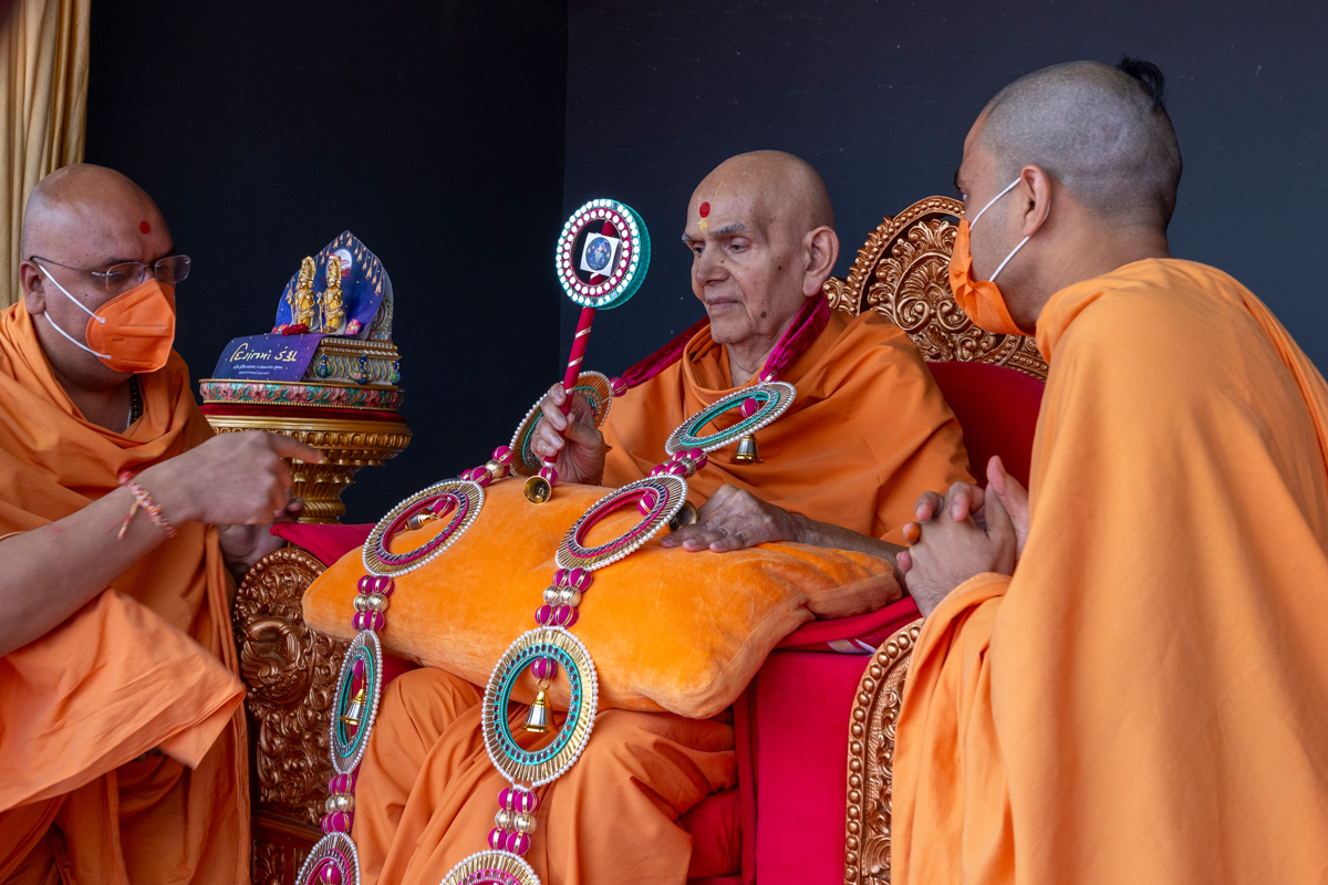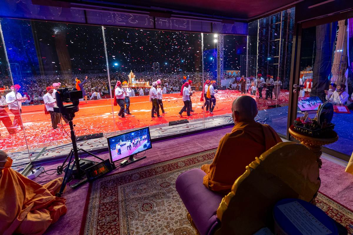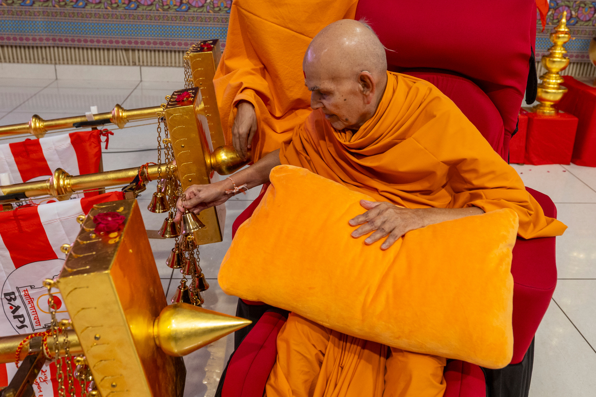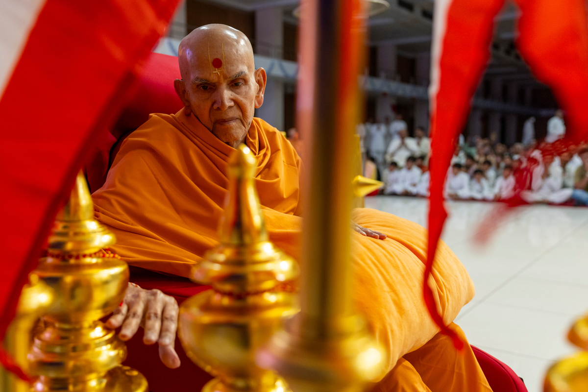 Swamishri arrives to perform pujan of kalashes and flagstaffs