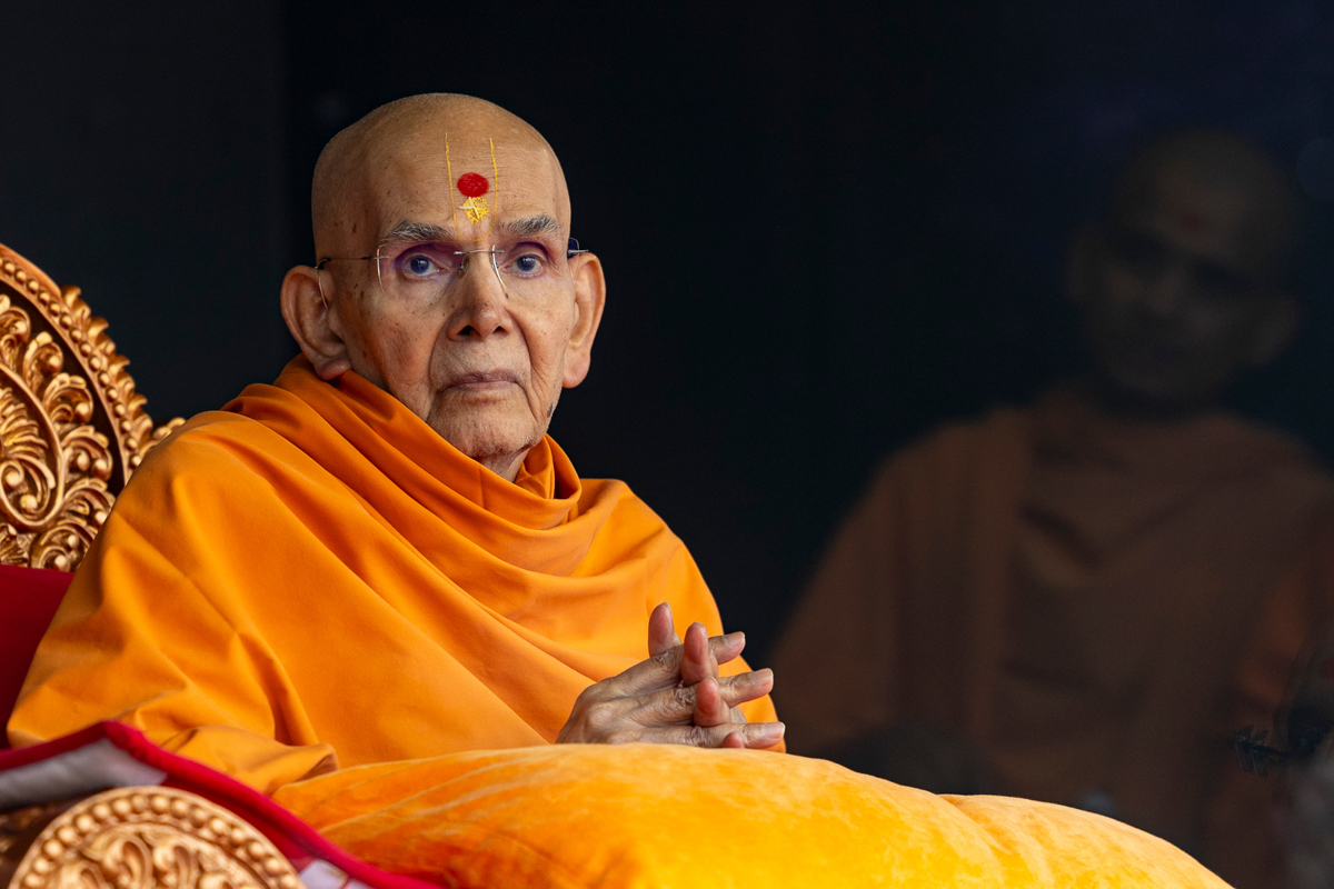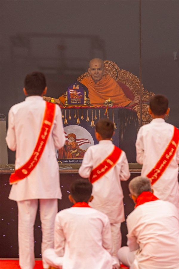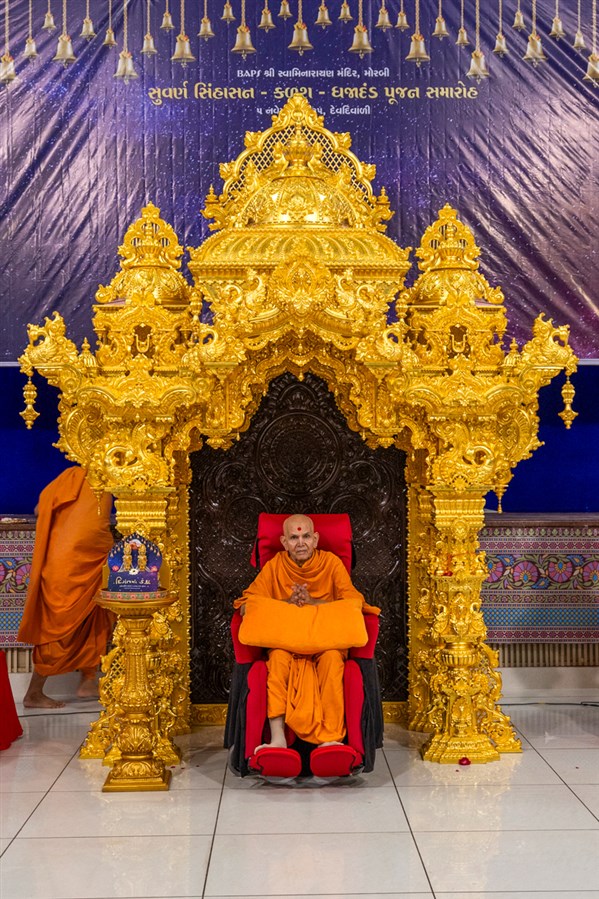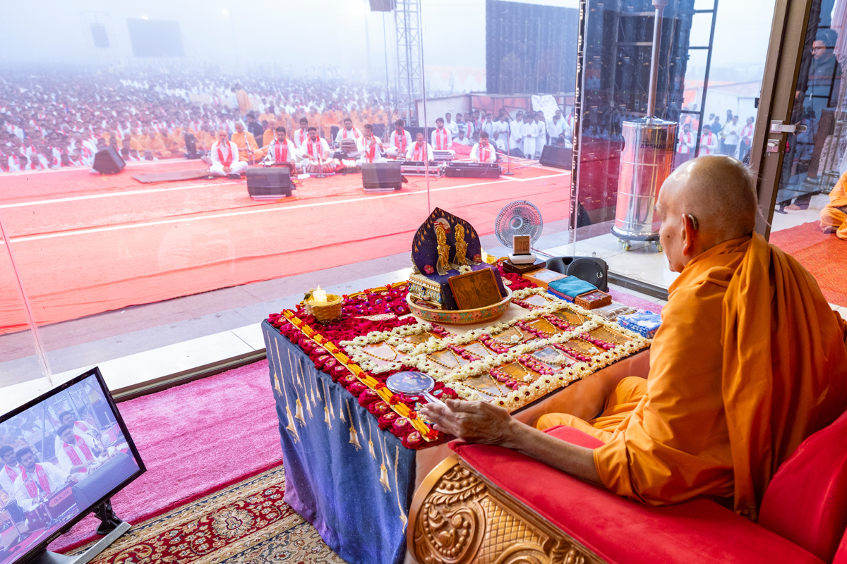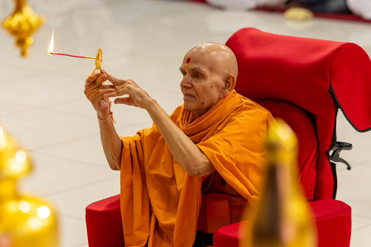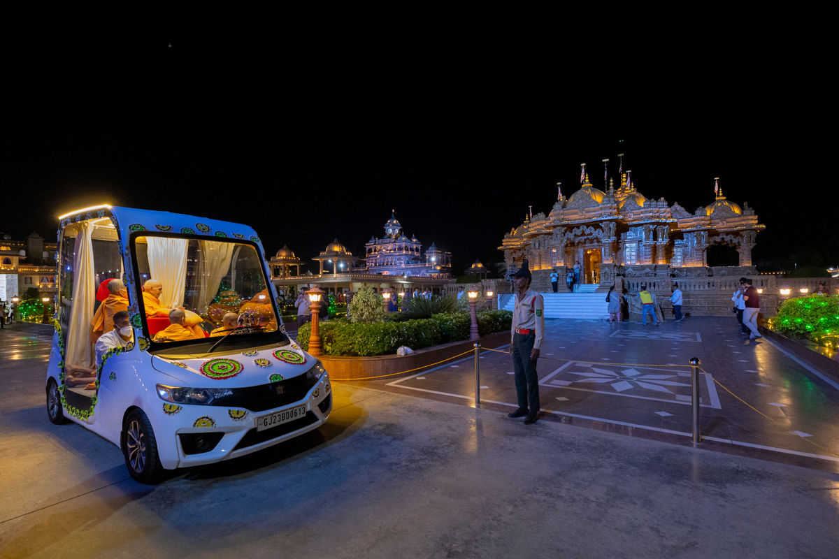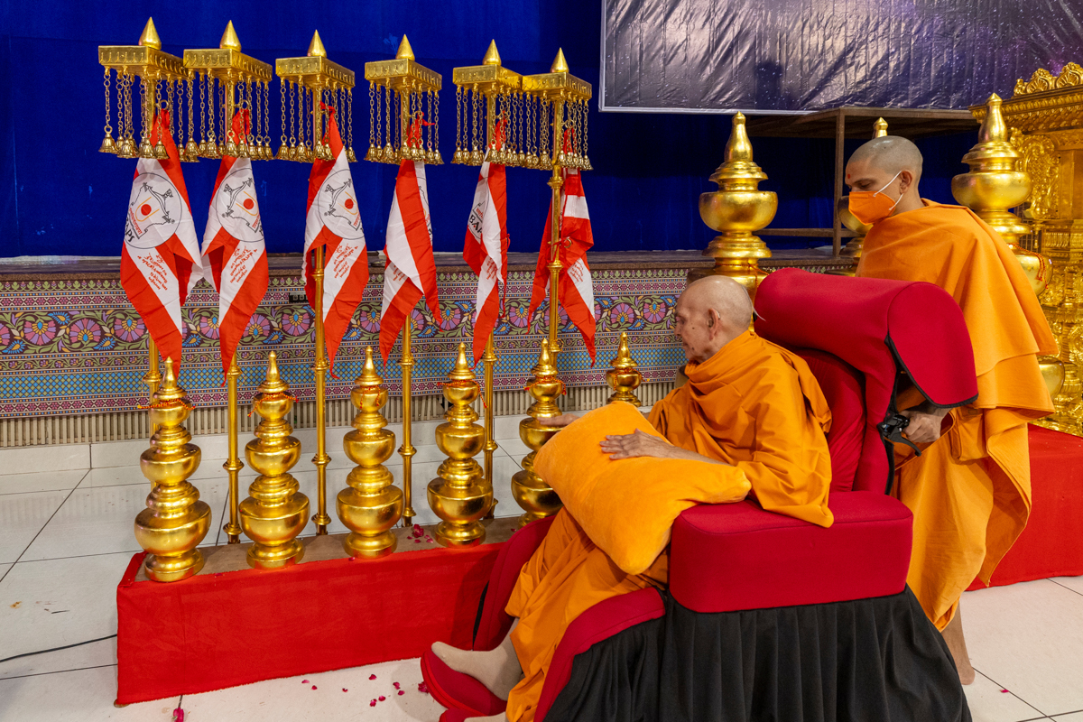 Swamishri arrives to perform pujan of kalashes and flagstaffs