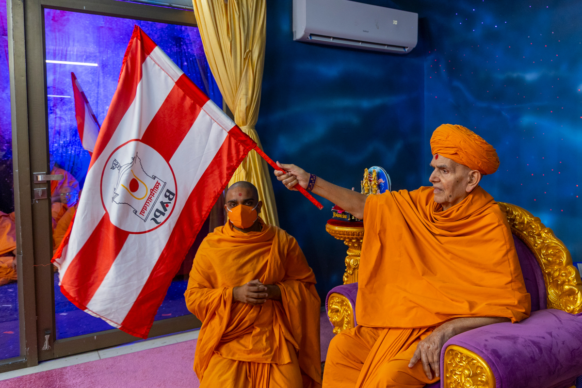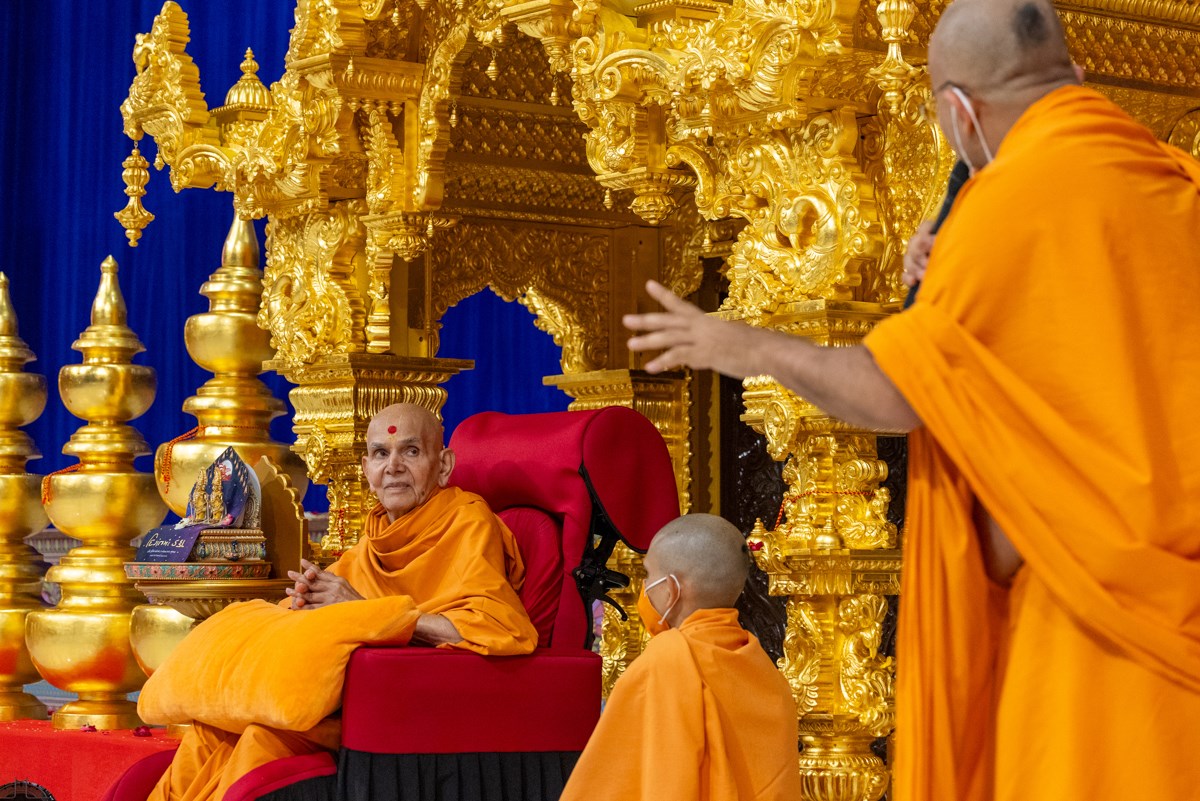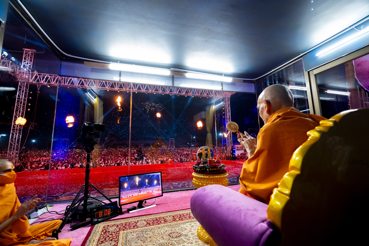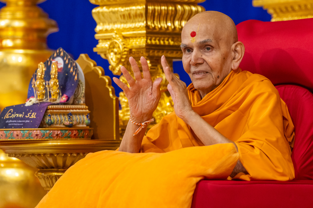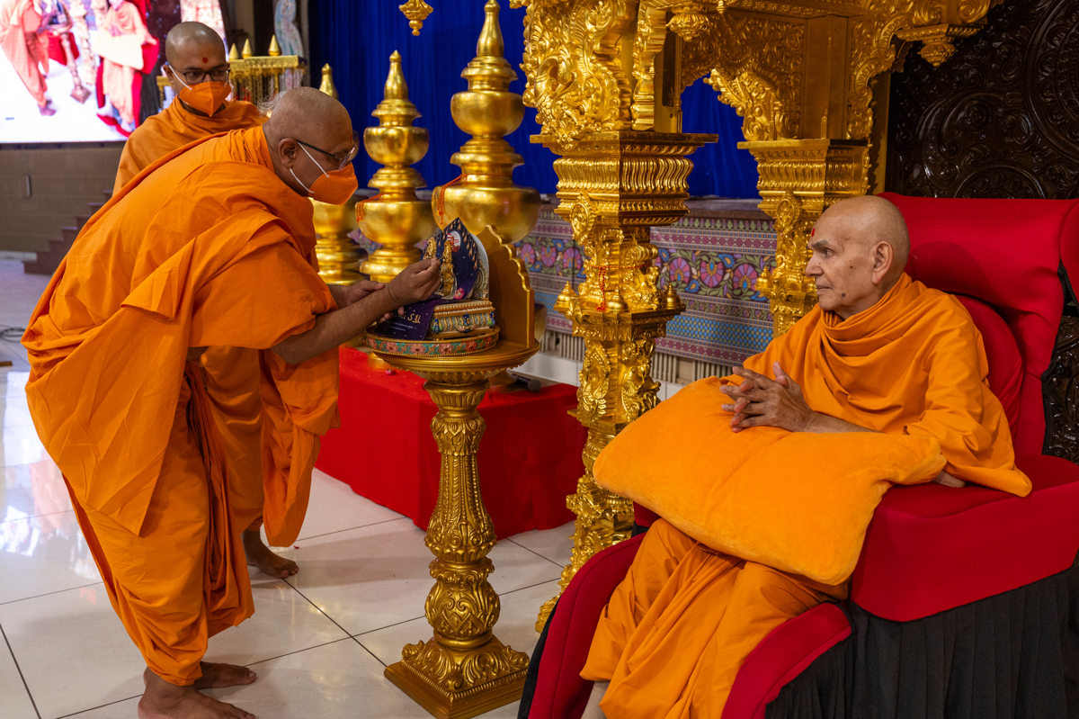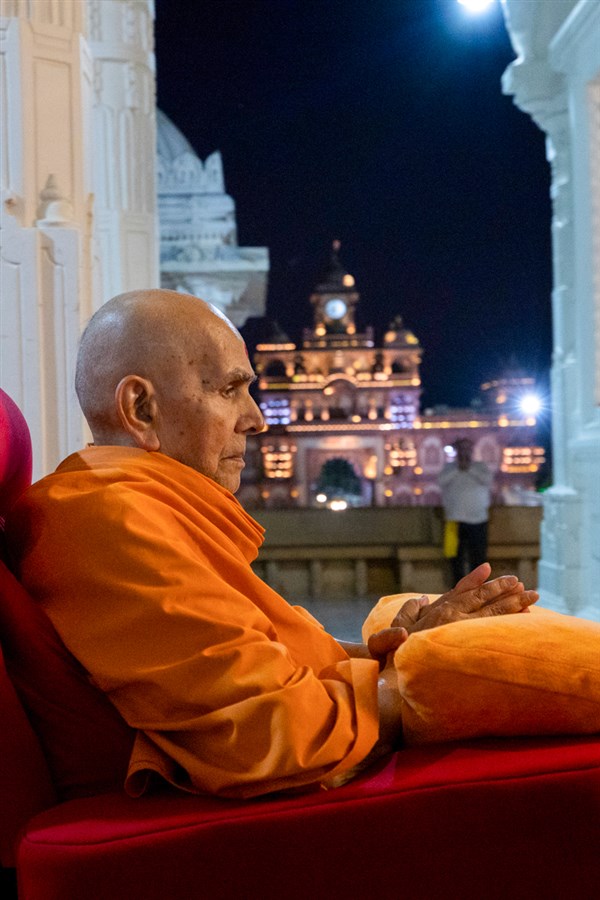 Swamishri arrives to perform pujan of kalashes and flagstaffs