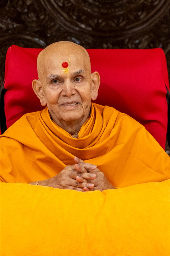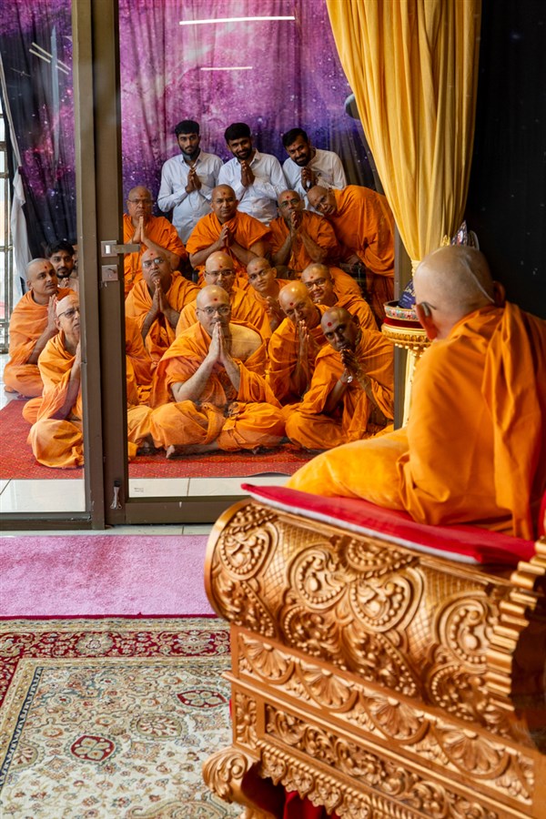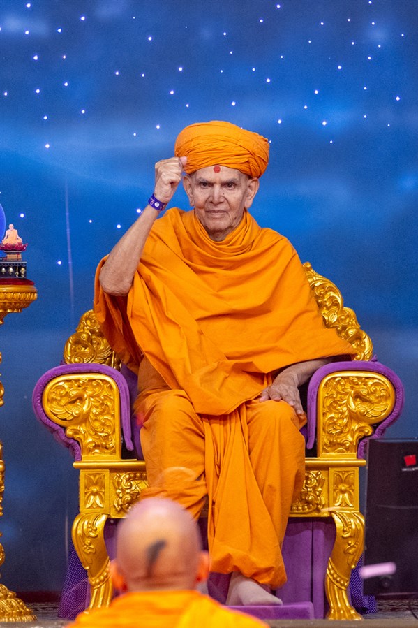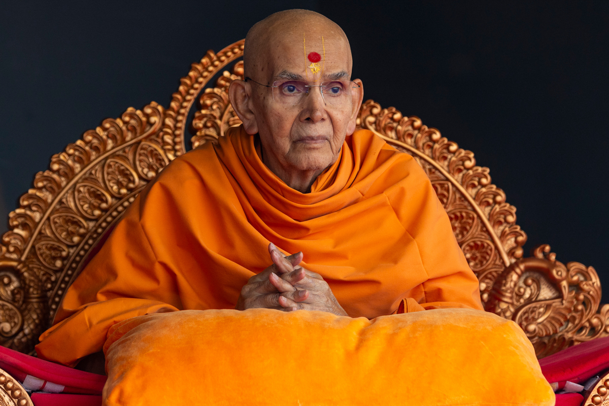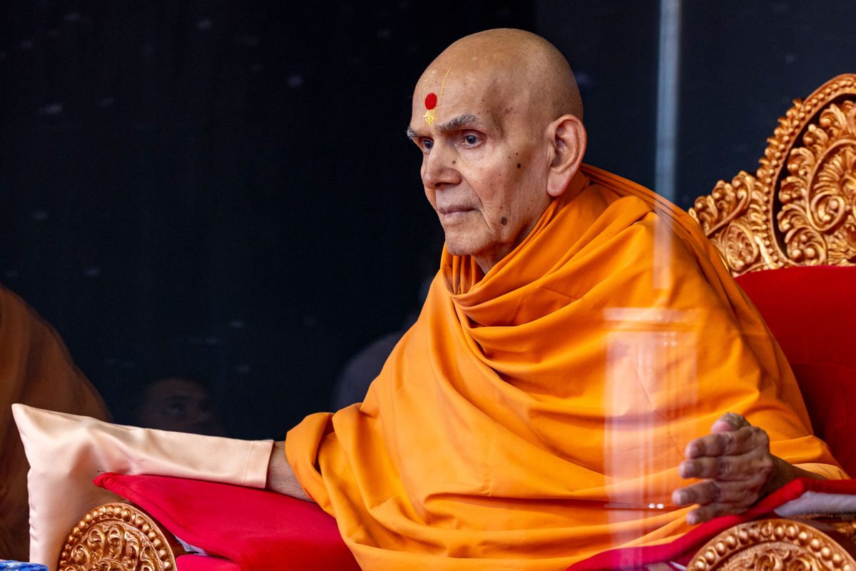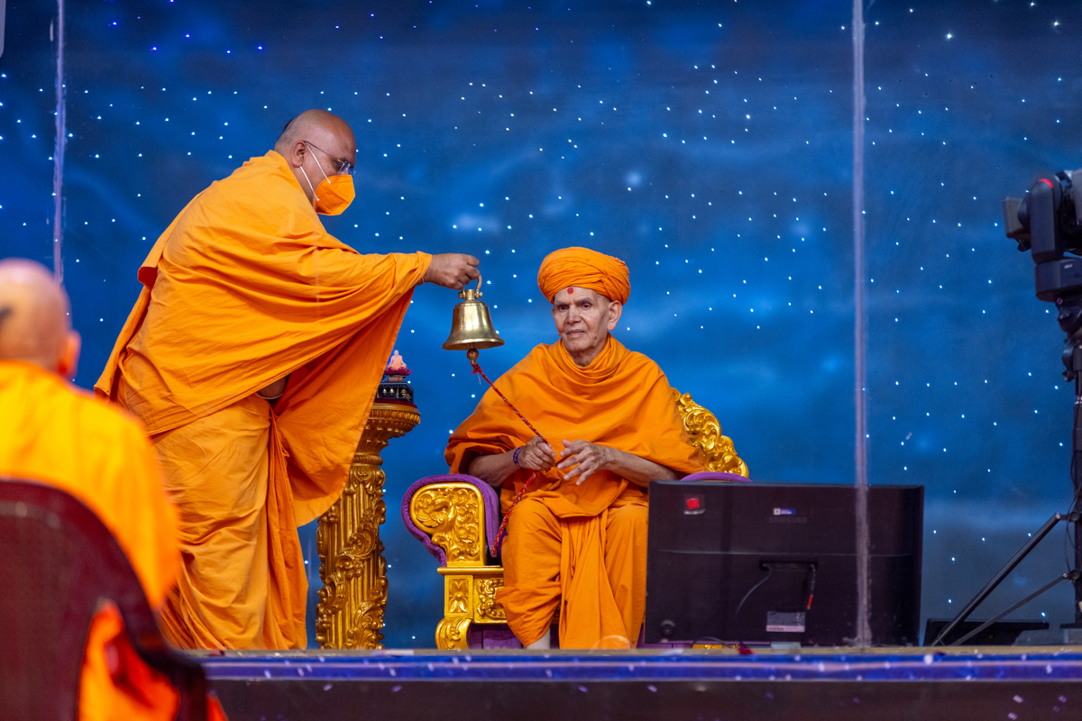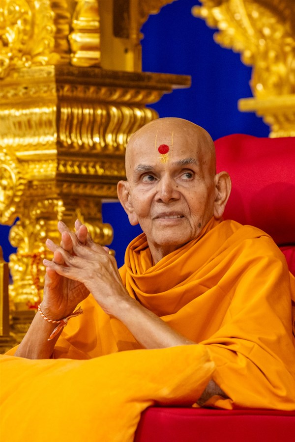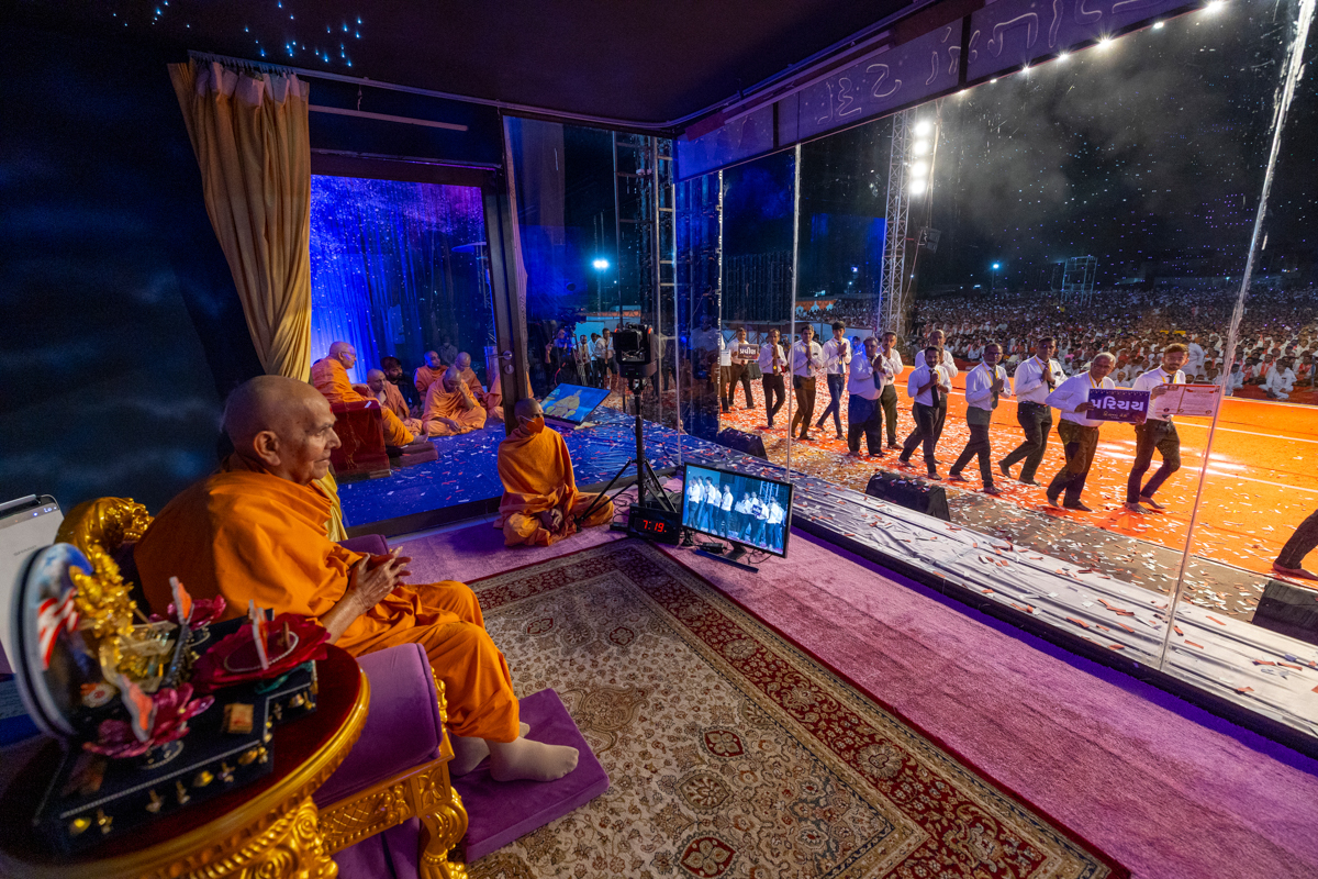 Swamishri arrives to perform pujan of kalashes and flagstaffs