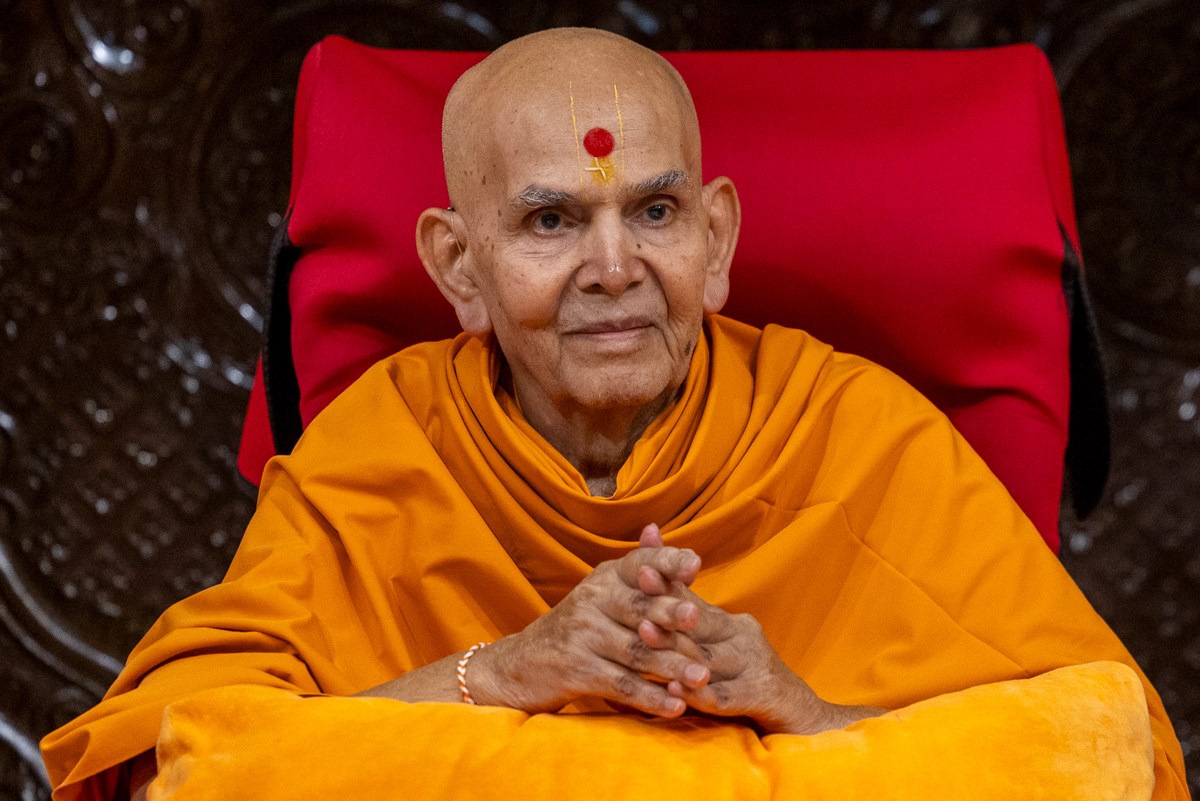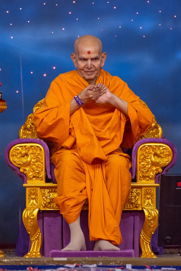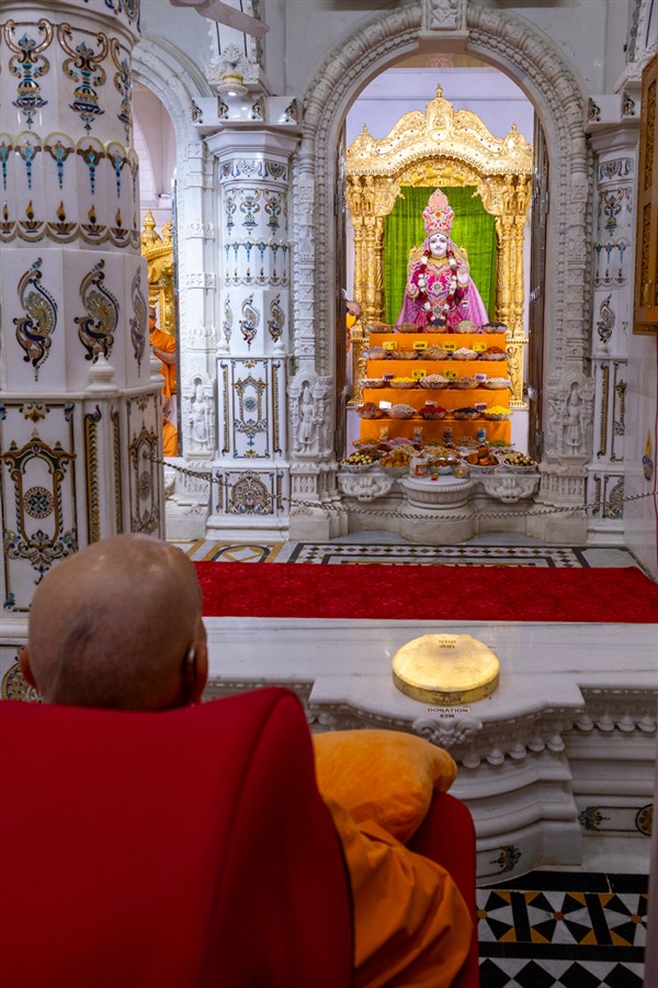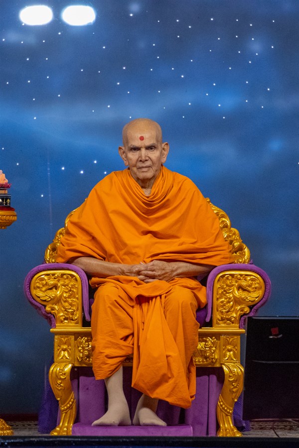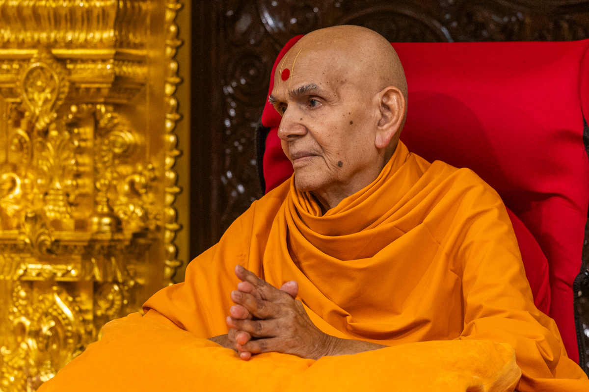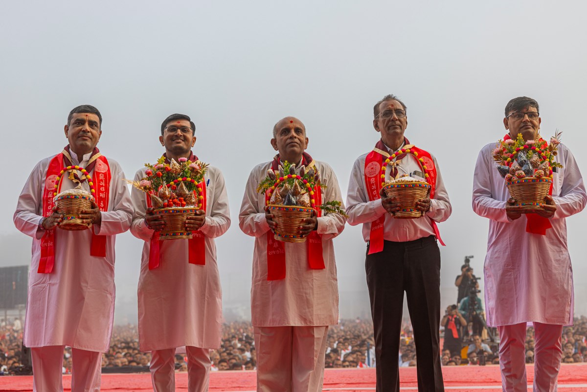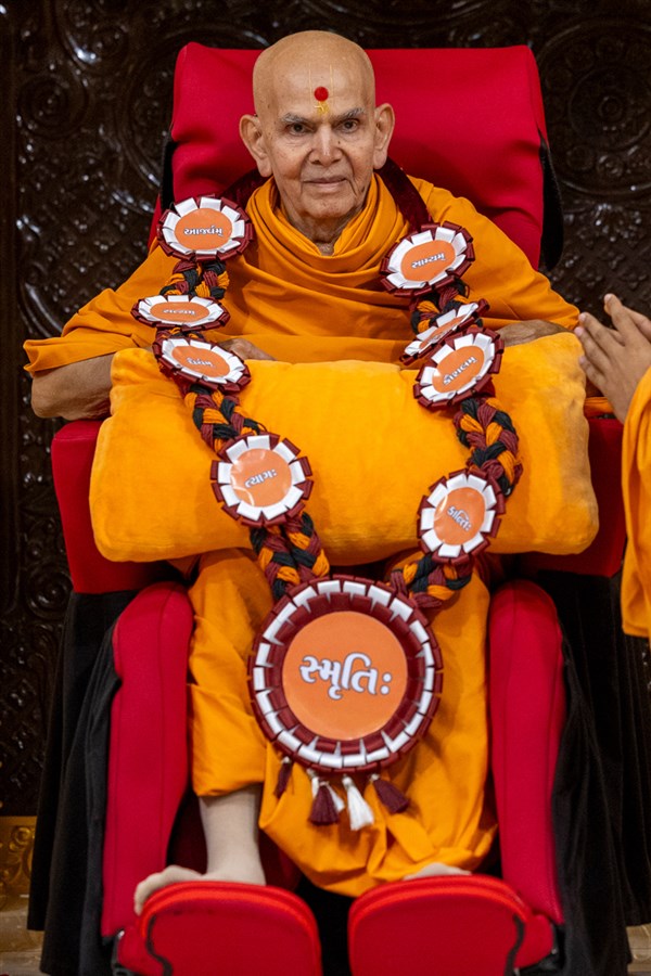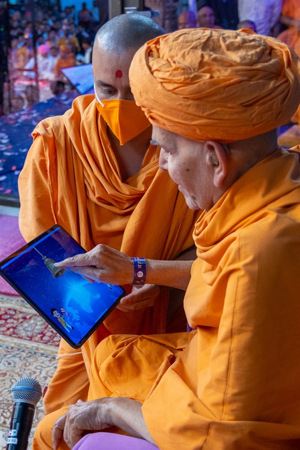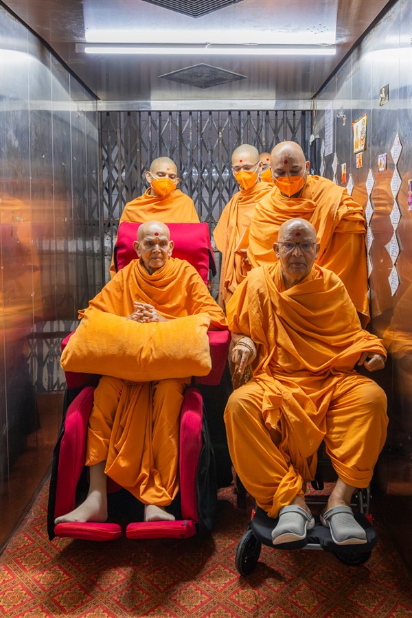 Swamishri arrives to perform pujan of kalashes and flagstaffs