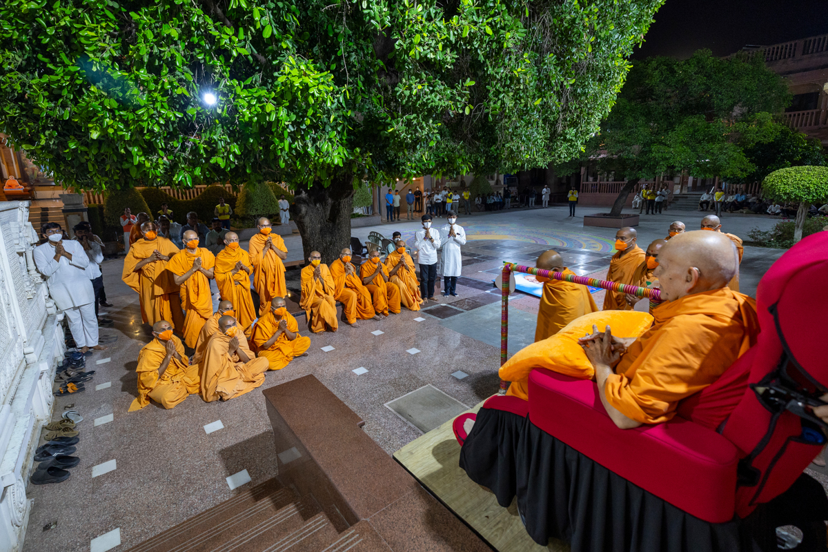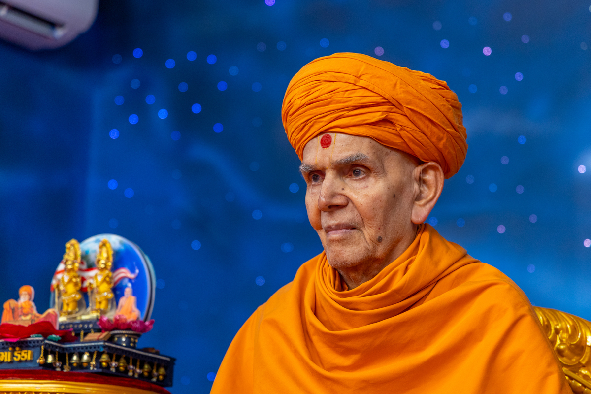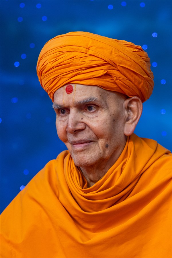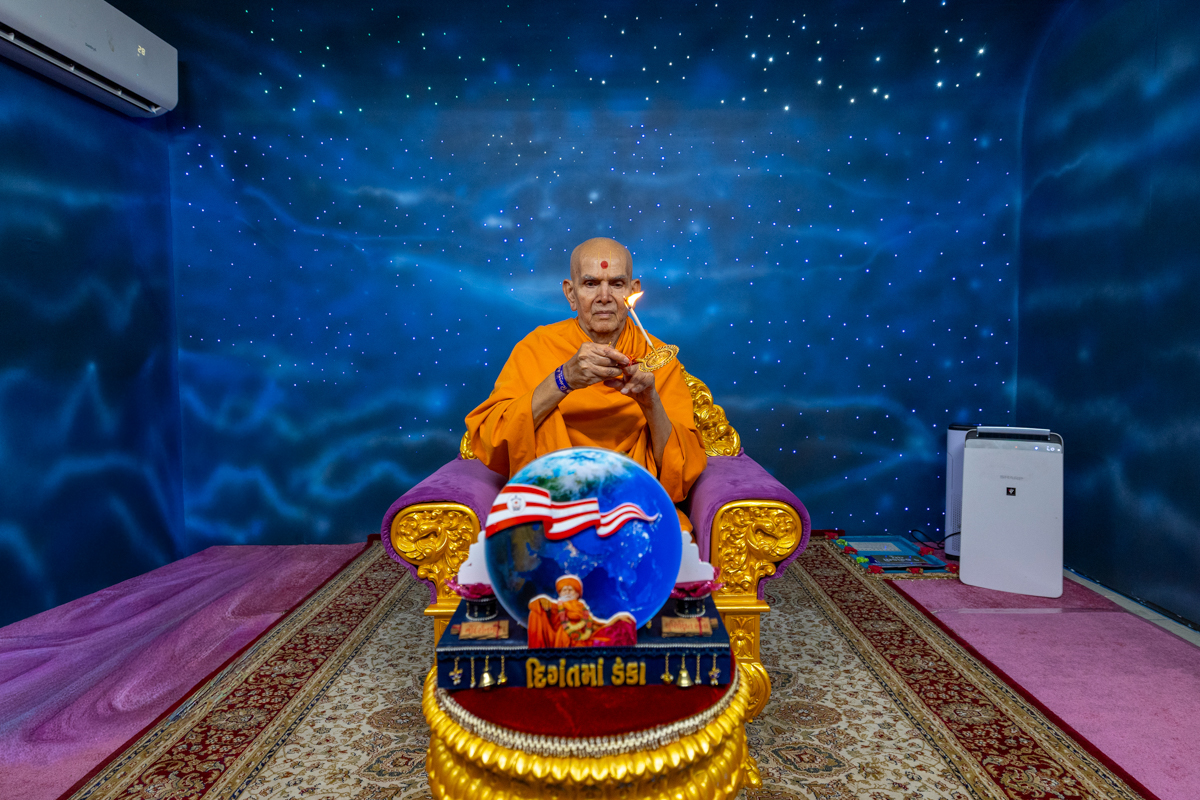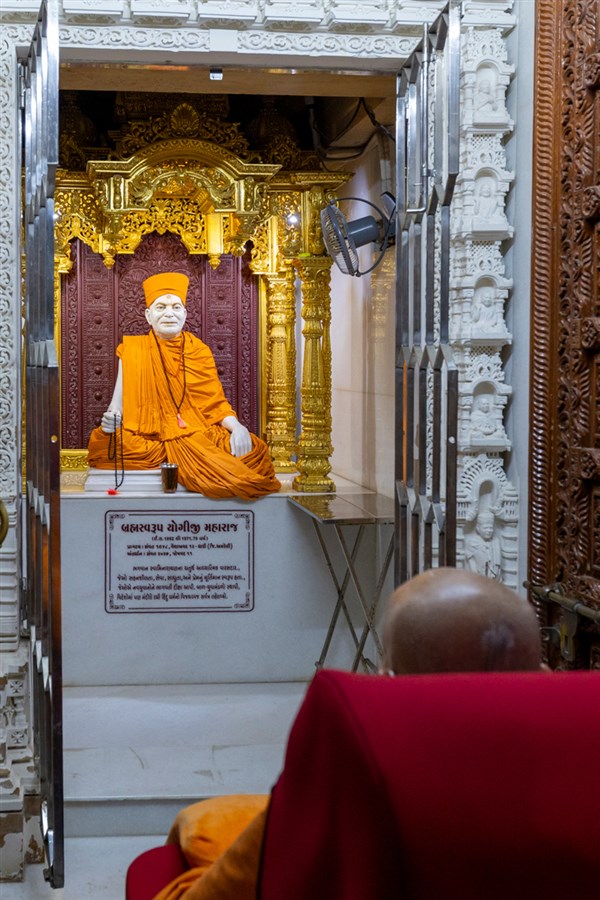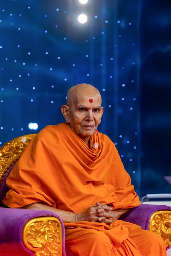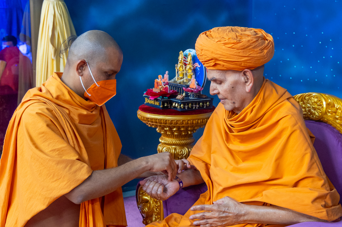 Swamishri arrives to perform pujan of kalashes and flagstaffs