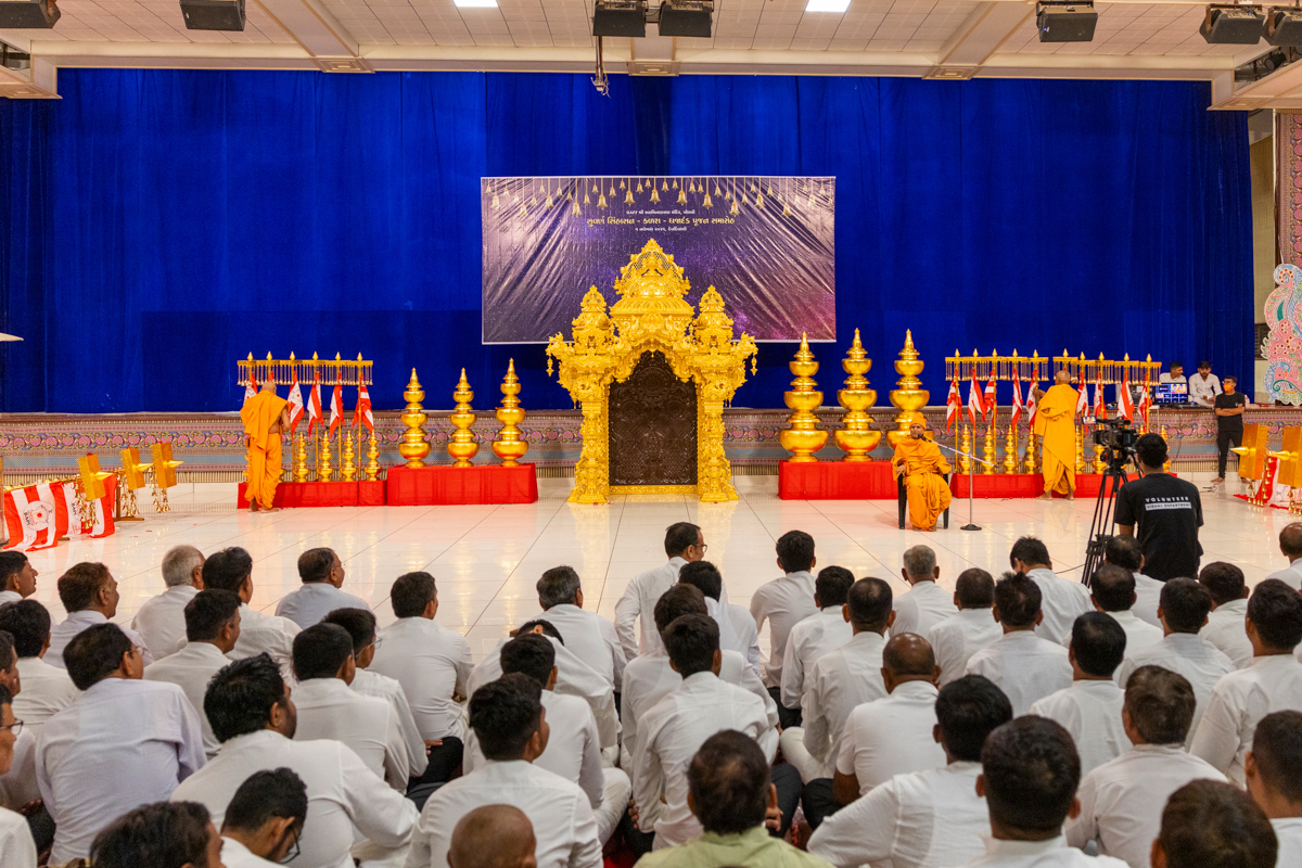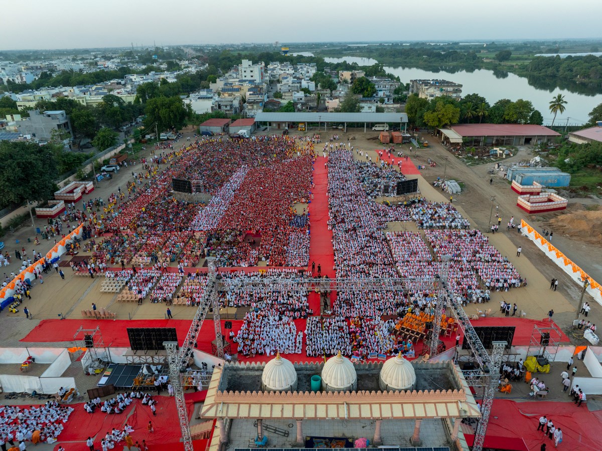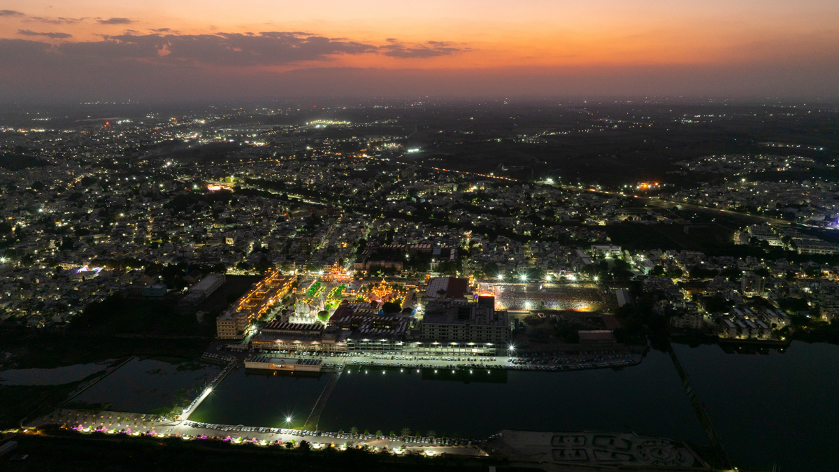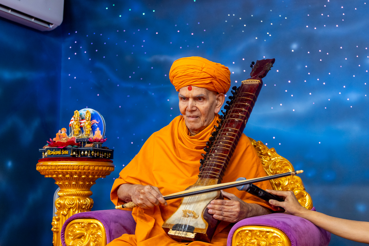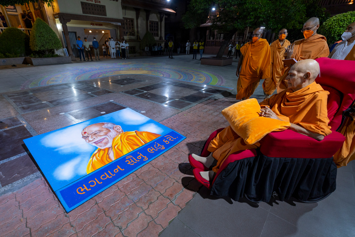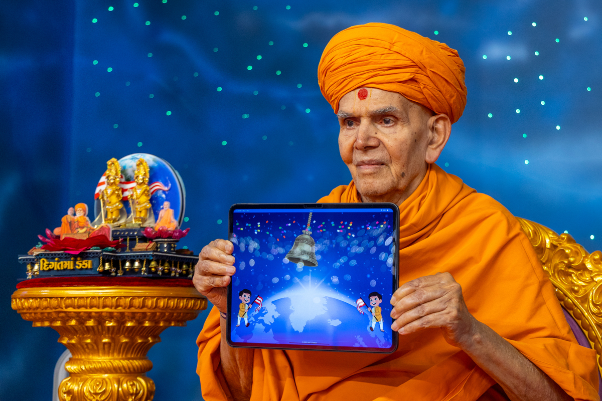 Swamishri arrives to perform pujan of kalashes and flagstaffs