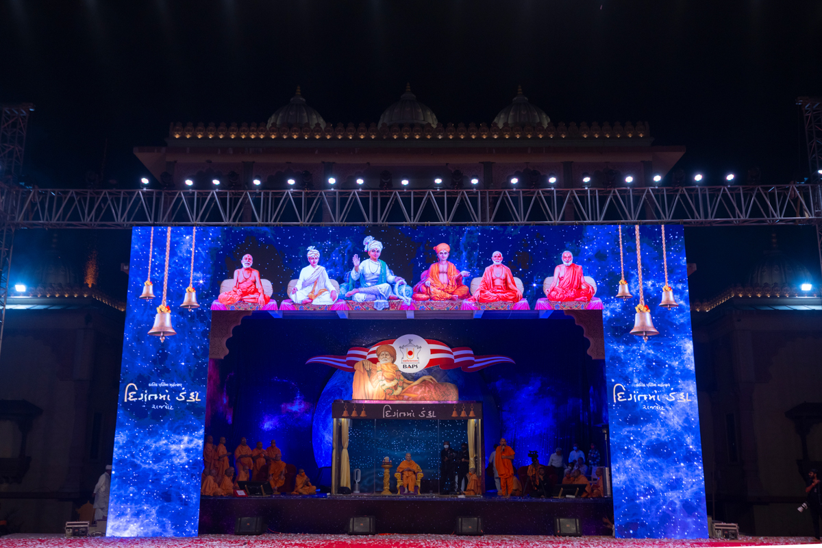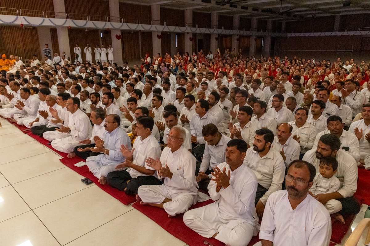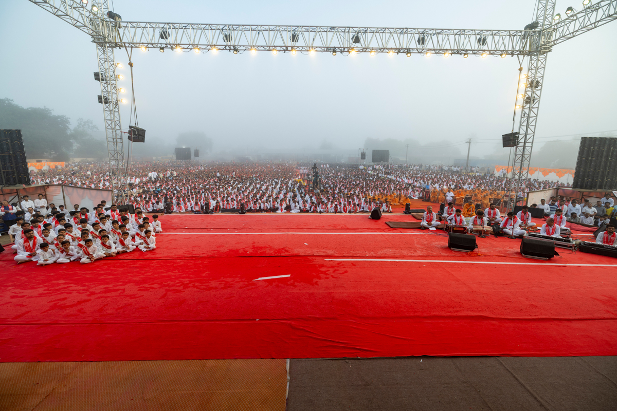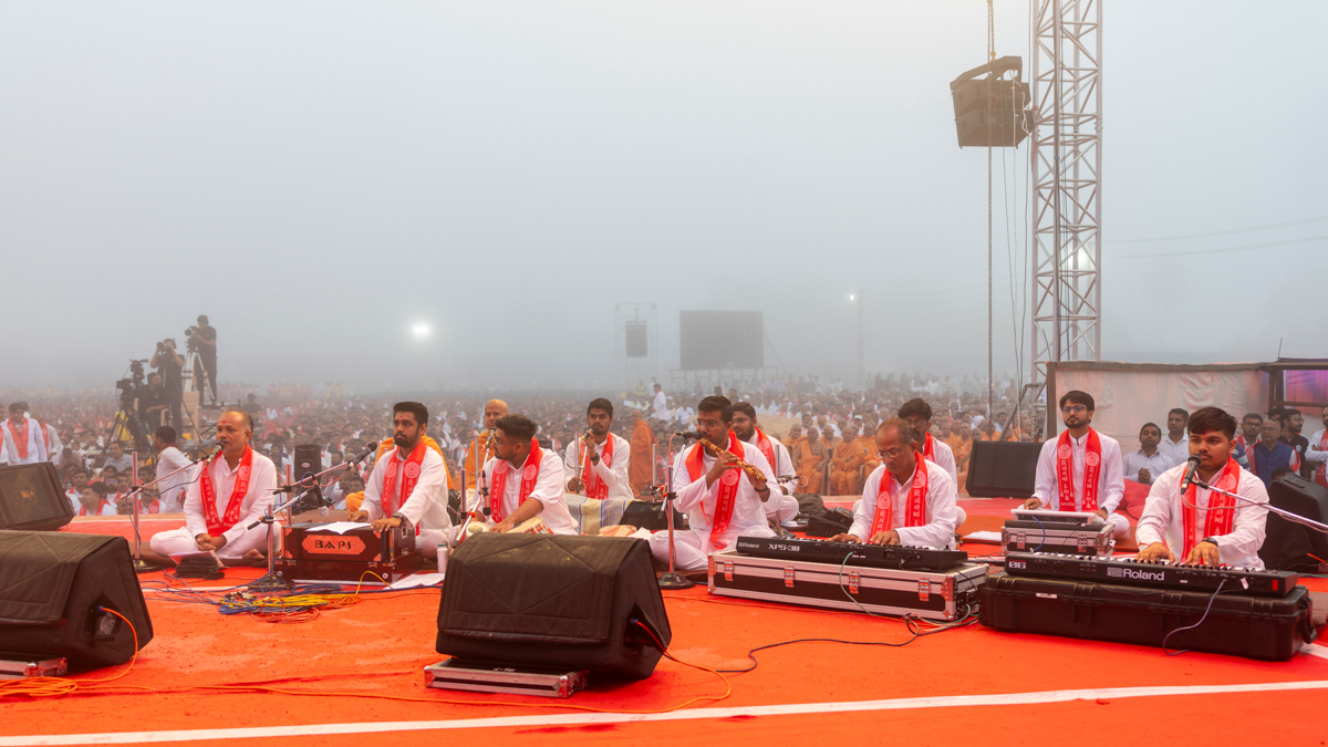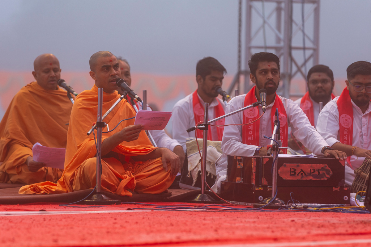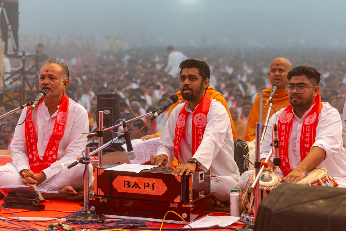Swamis and youths sing kirtans at the beginning of the evening Rajkot Din assembly, titled 'Digantma Danka'