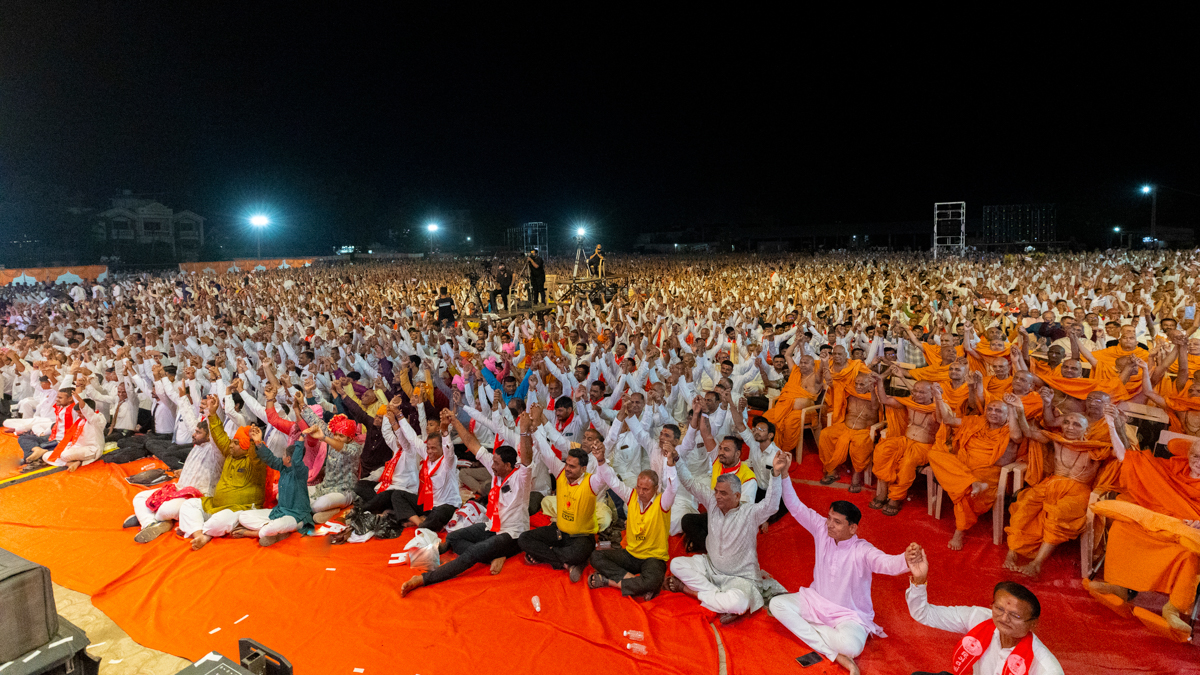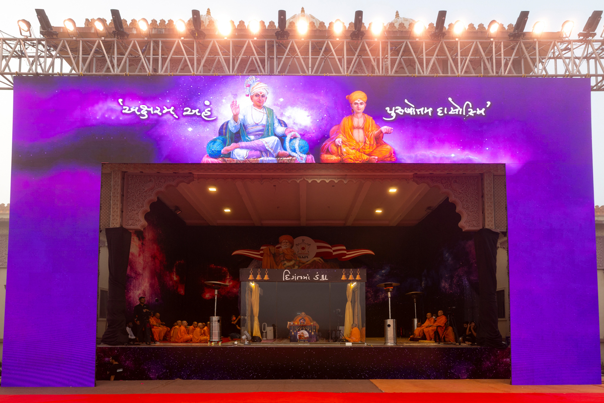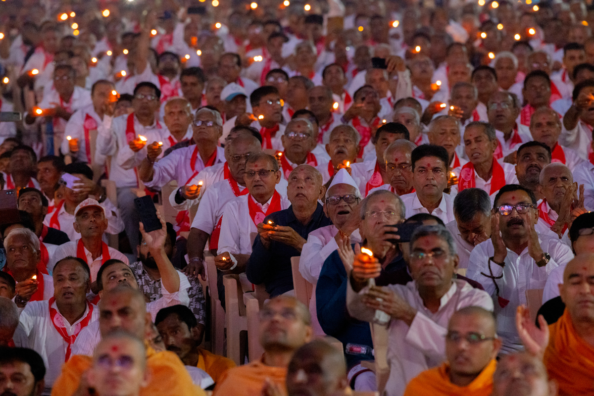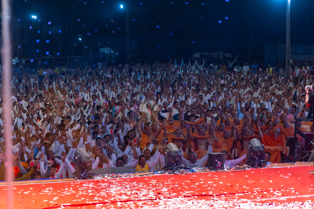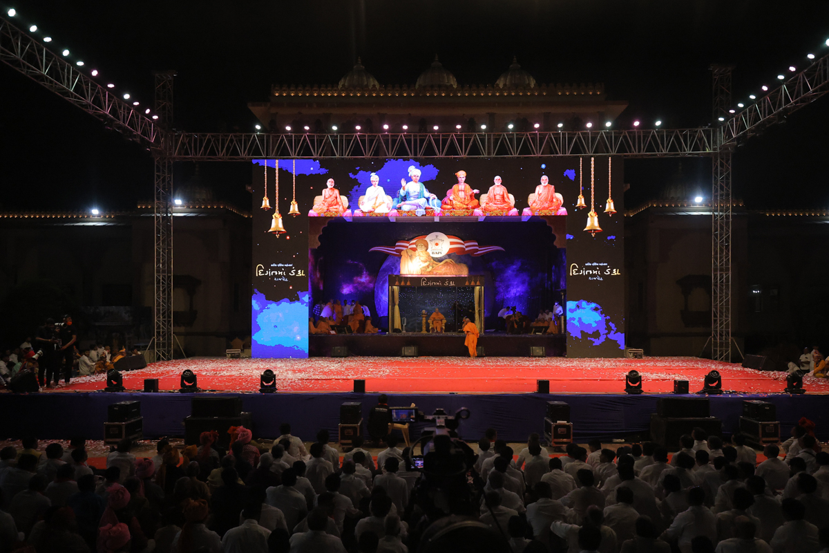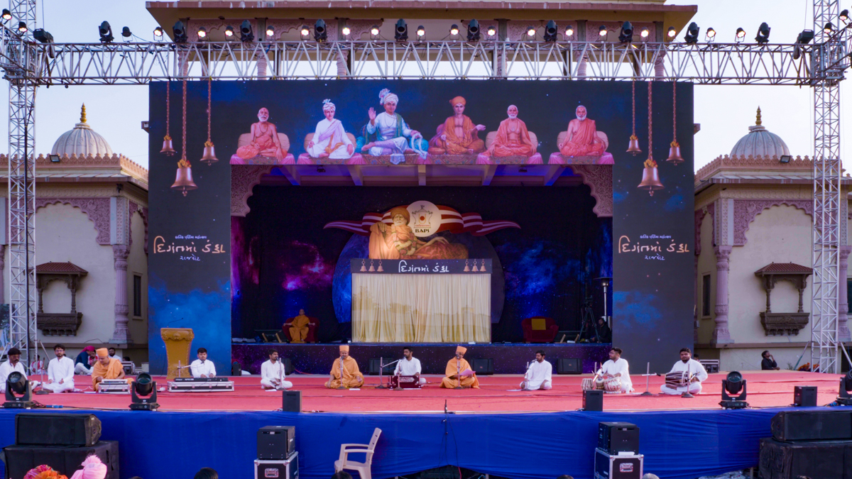 Swamis and youths sing kirtans at the beginning of the evening Rajkot Din assembly, titled 'Digantma Danka'
