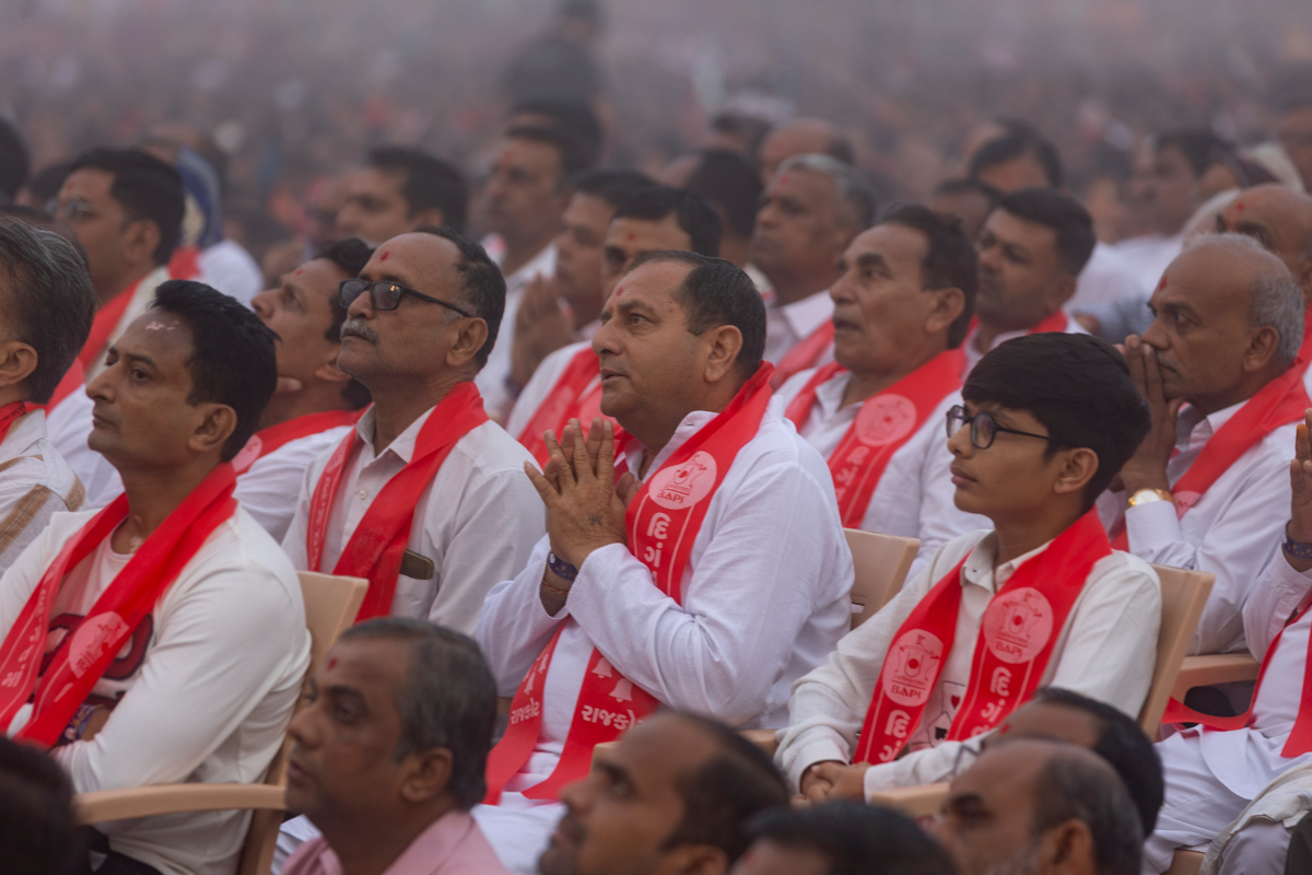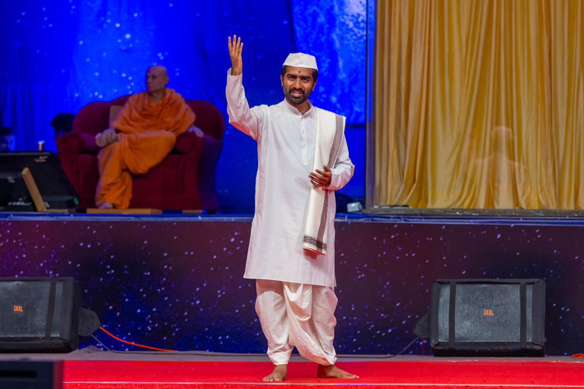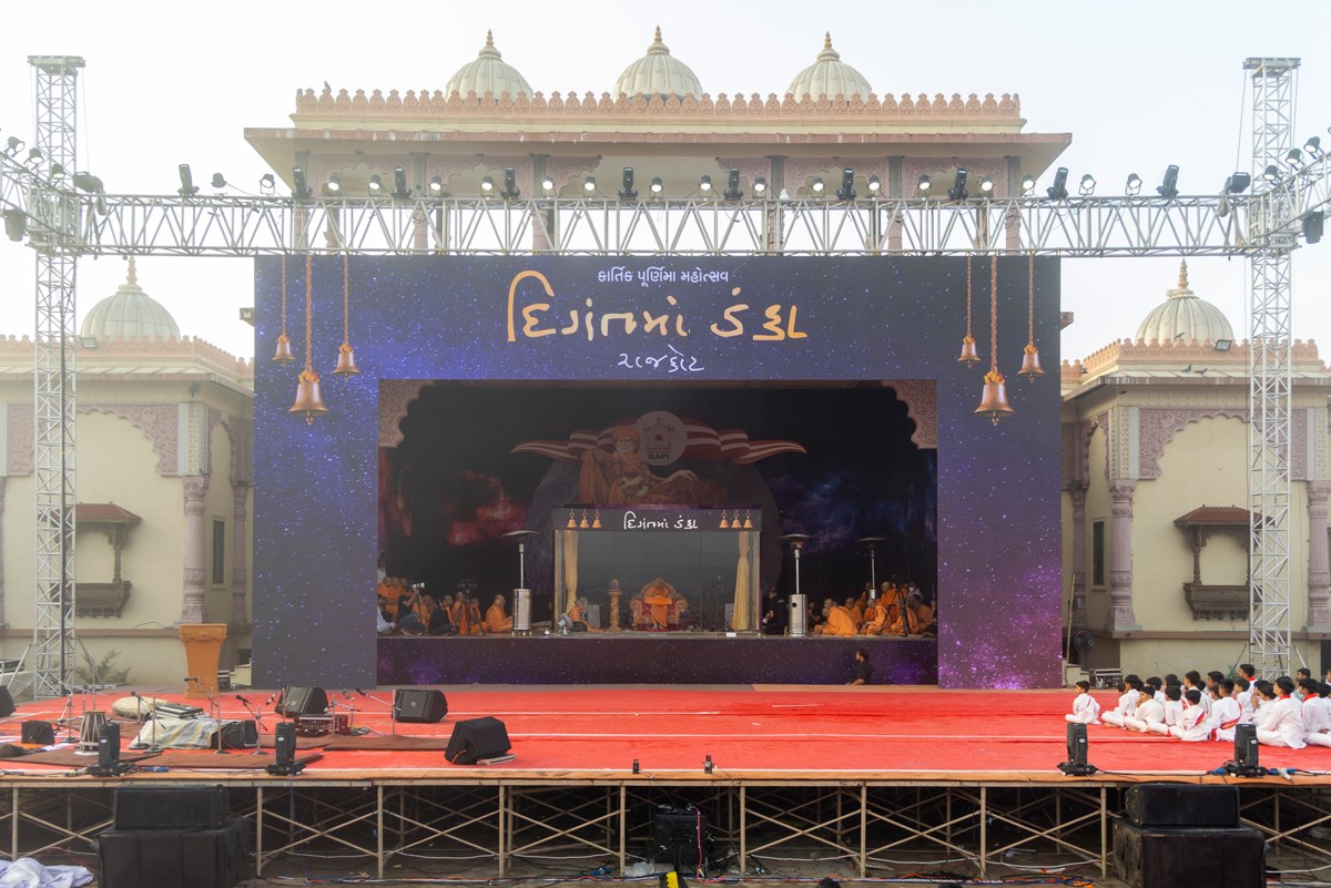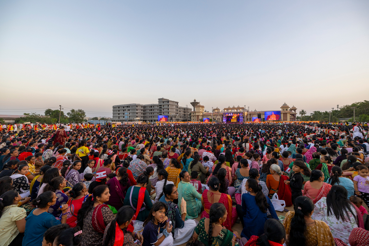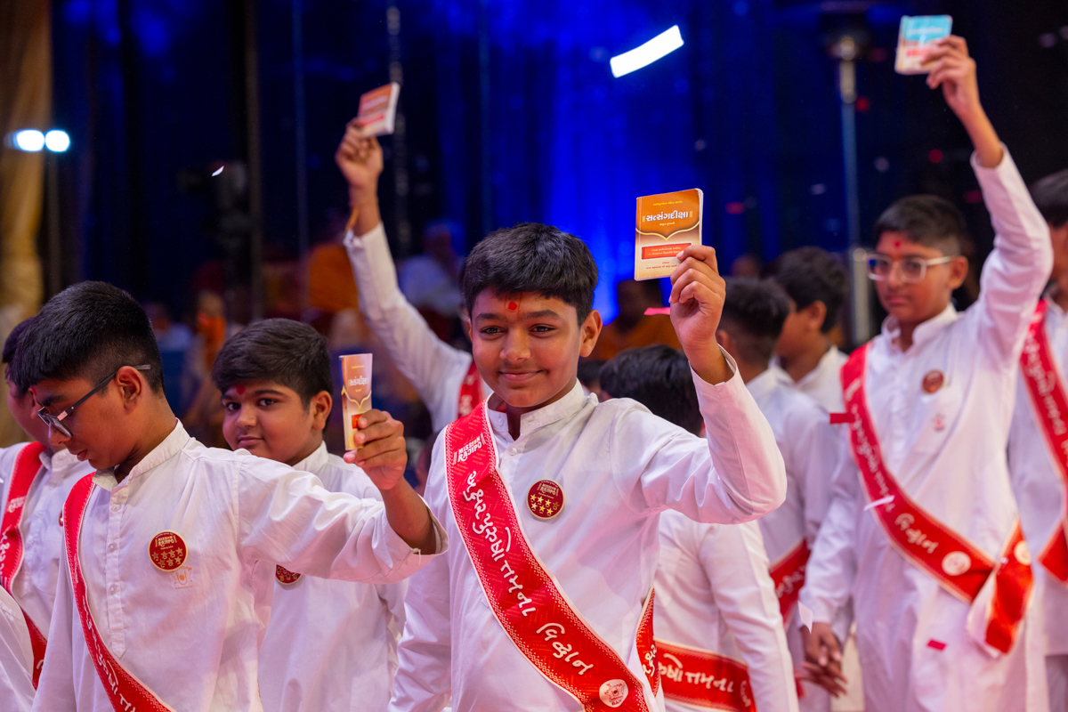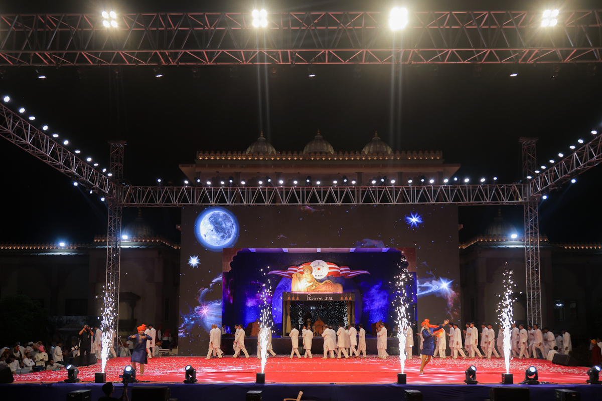 Swamis and youths sing kirtans at the beginning of the evening Rajkot Din assembly, titled 'Digantma Danka'