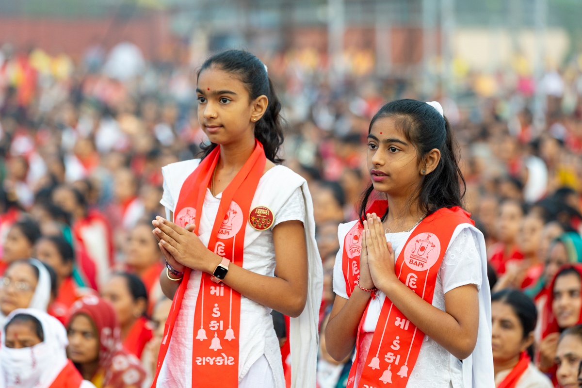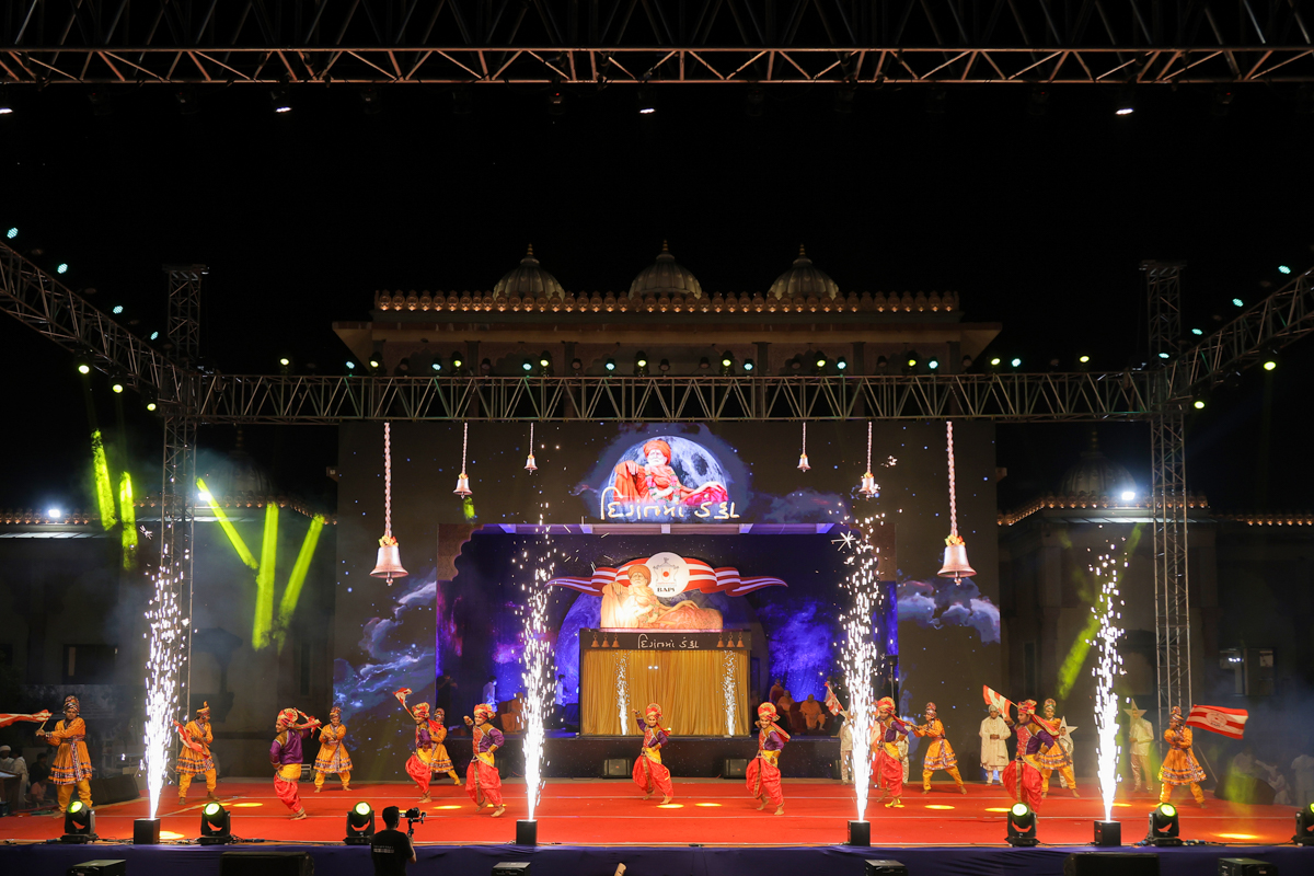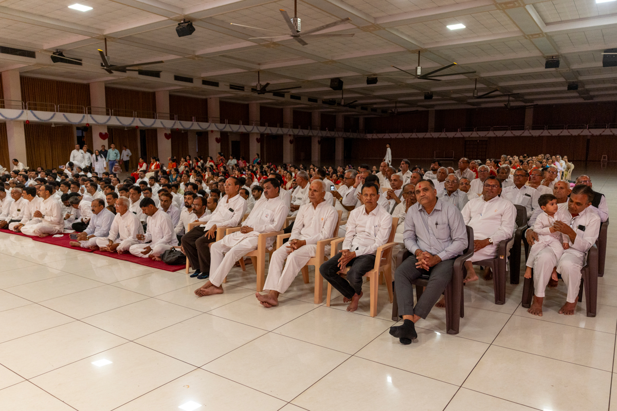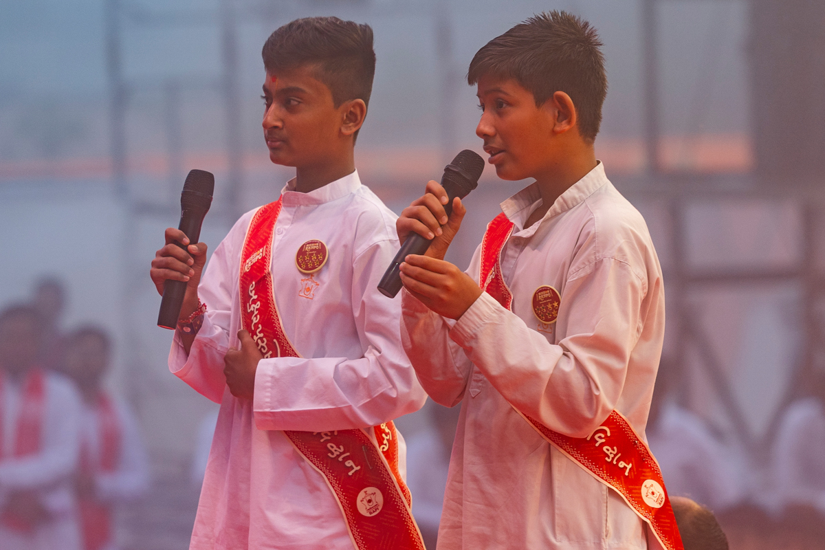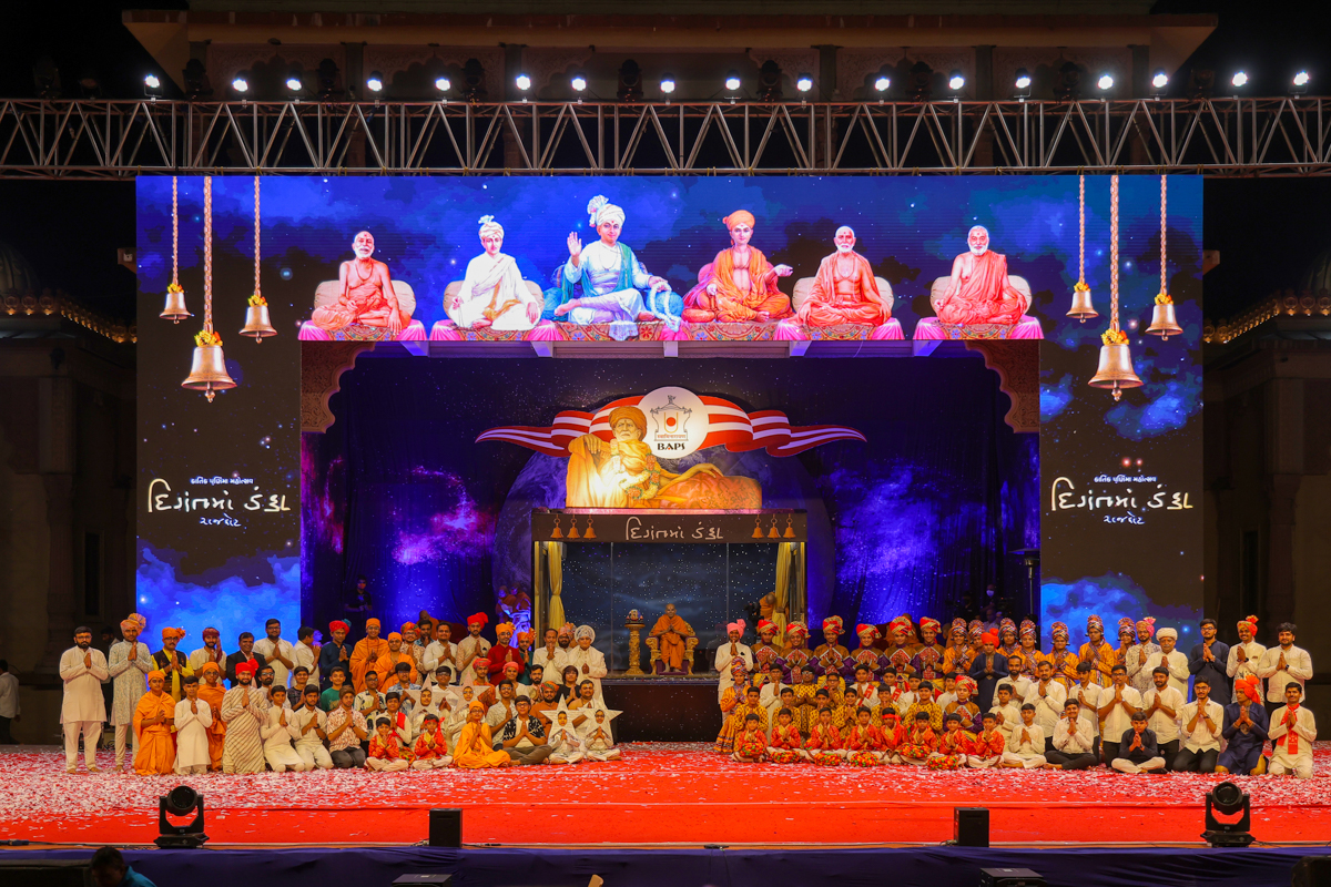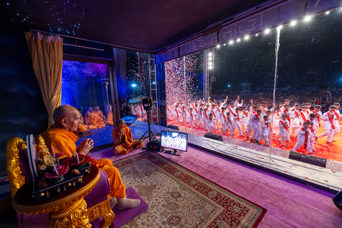 Swamis and youths sing kirtans at the beginning of the evening Rajkot Din assembly, titled 'Digantma Danka'