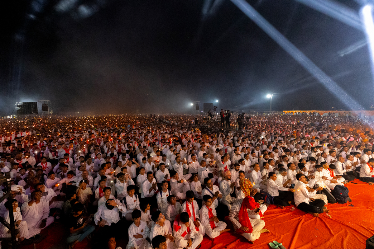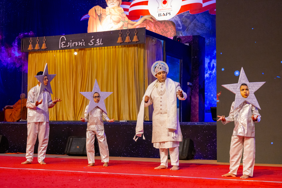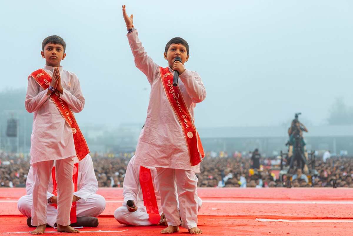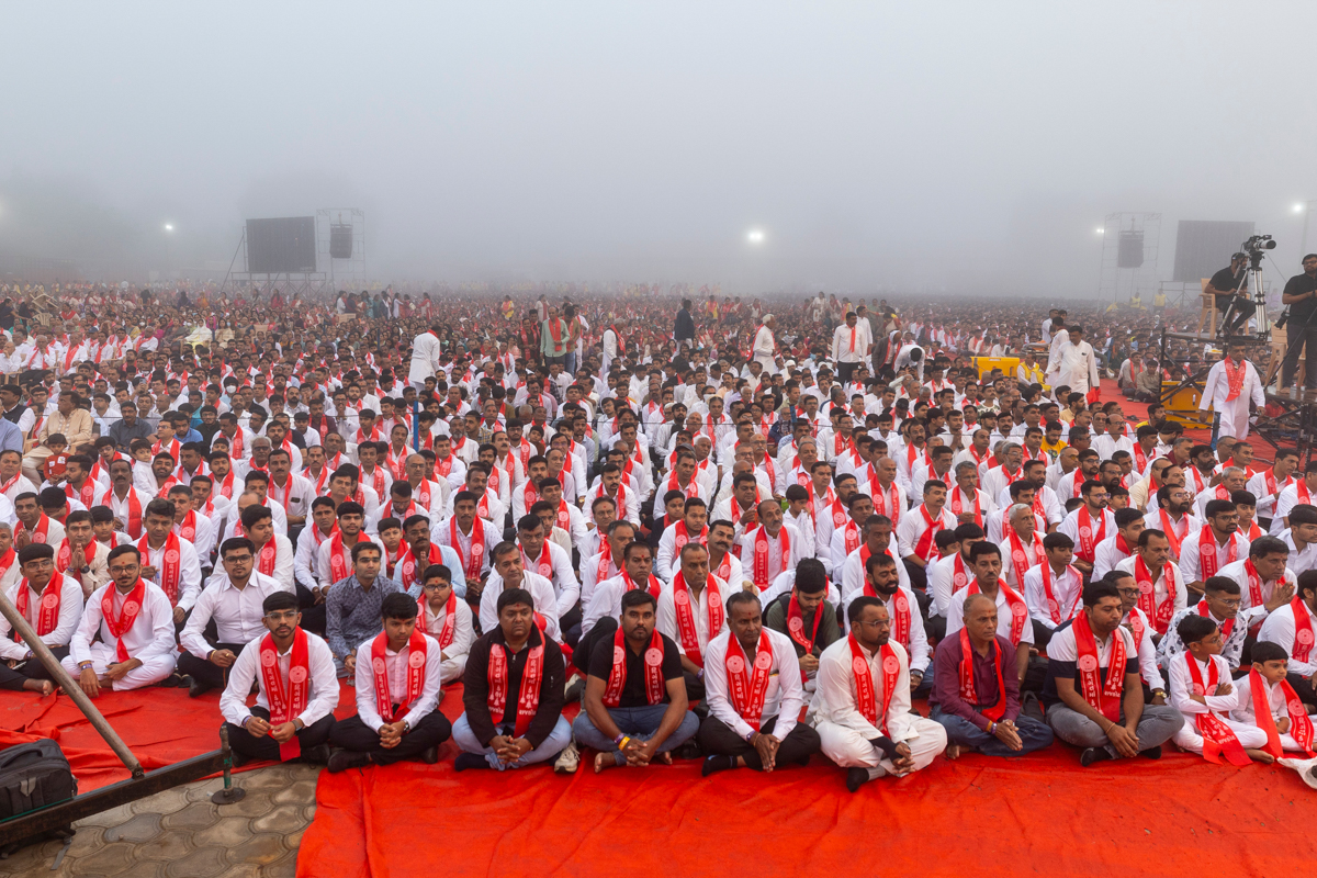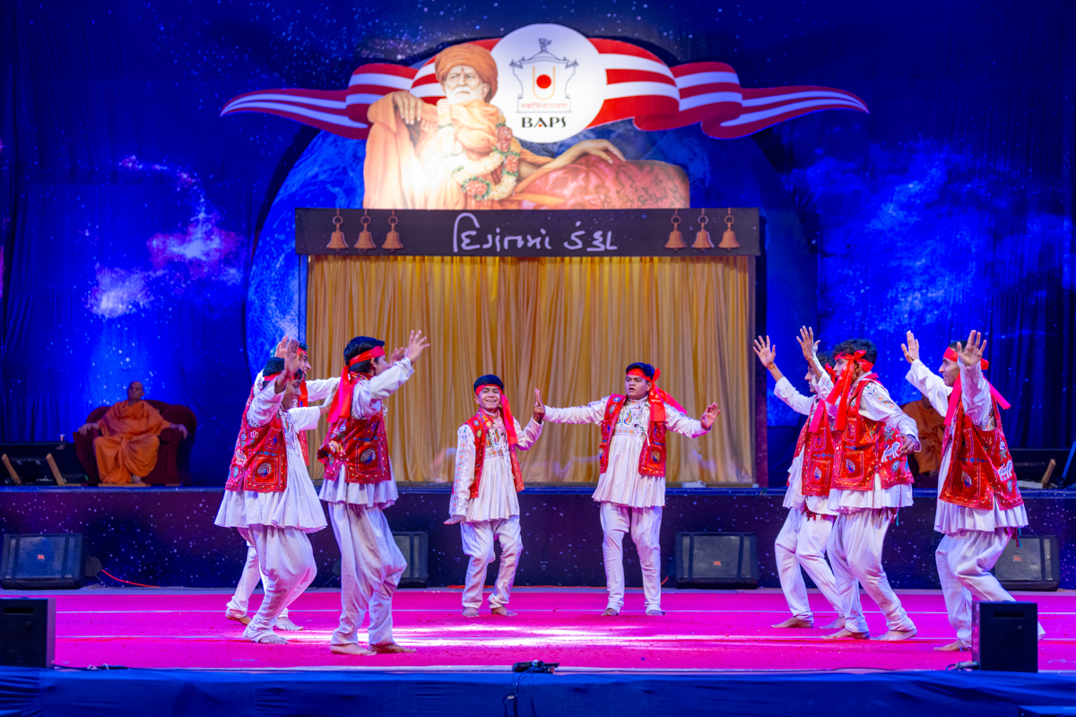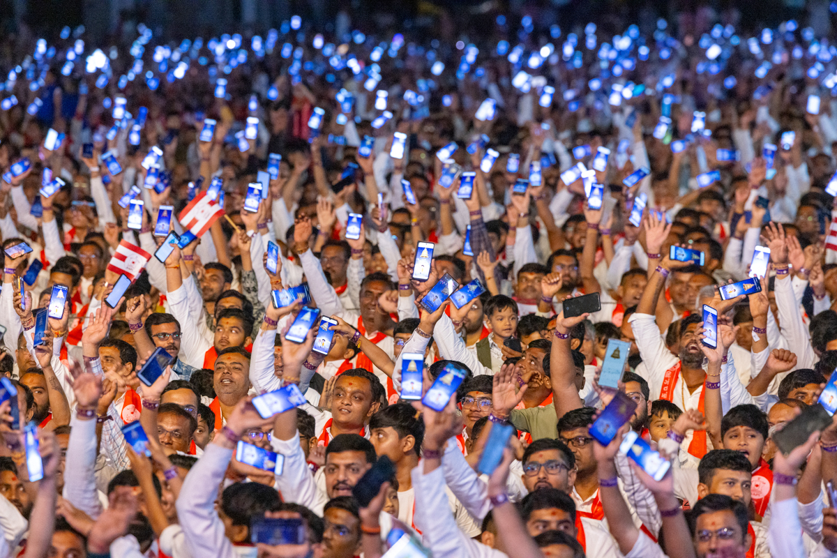 Swamis and youths sing kirtans at the beginning of the evening Rajkot Din assembly, titled 'Digantma Danka'