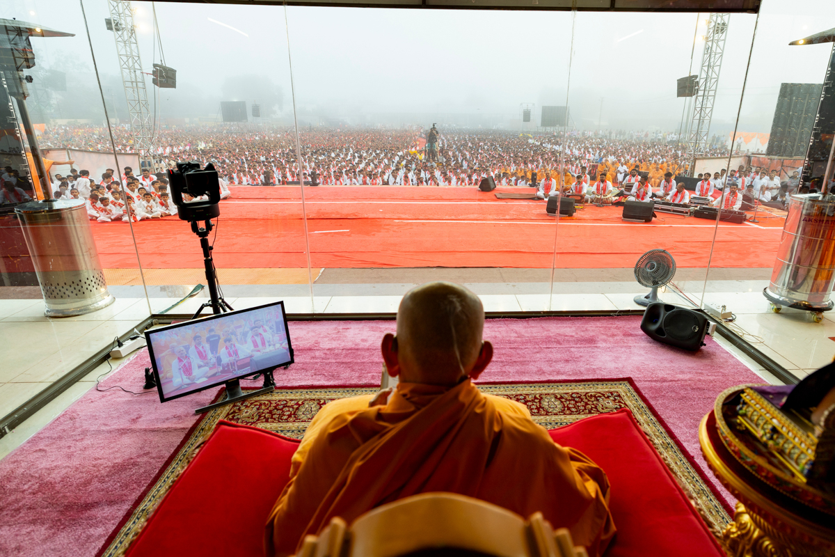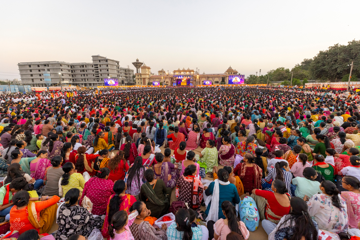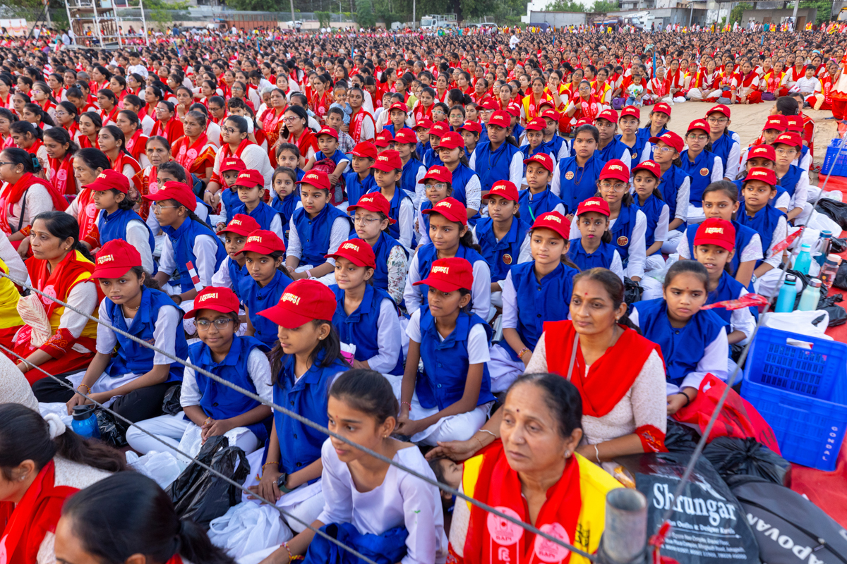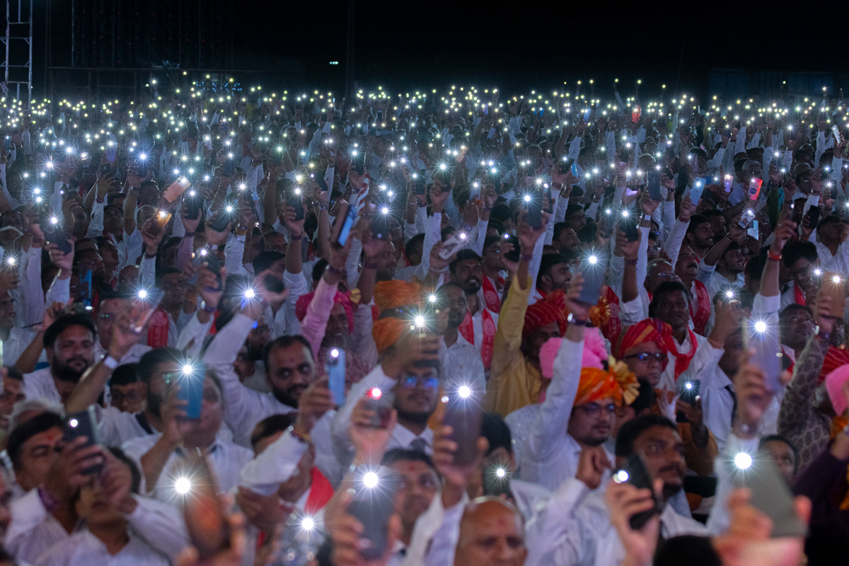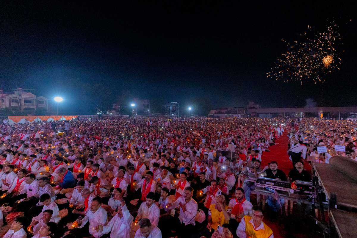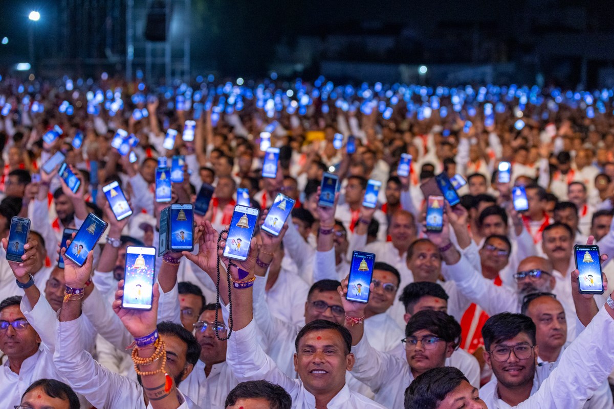 Swamis and youths sing kirtans at the beginning of the evening Rajkot Din assembly, titled 'Digantma Danka'