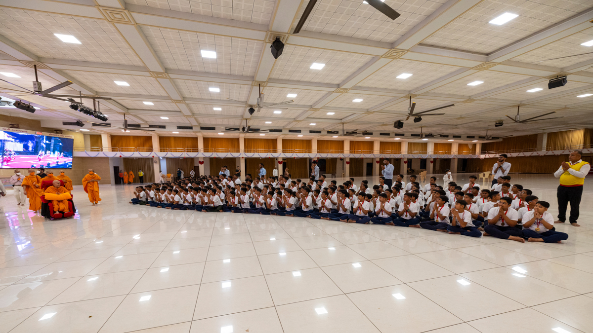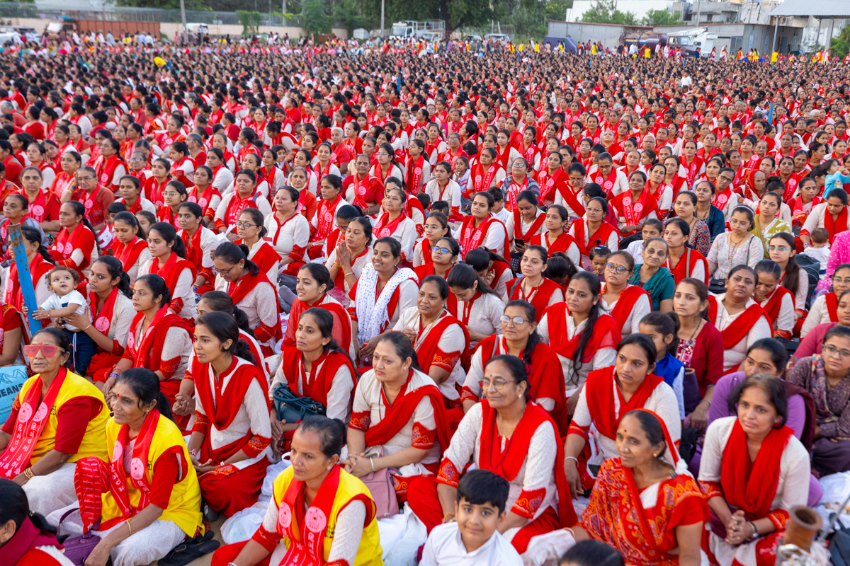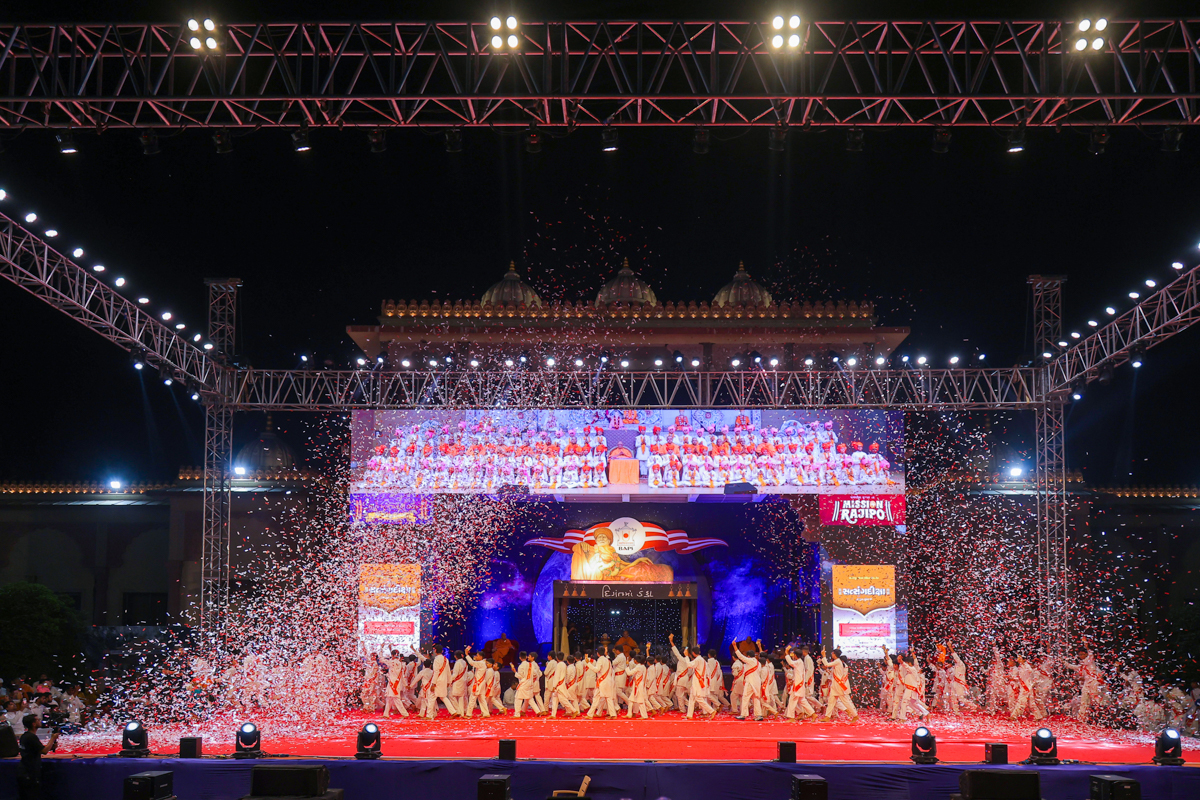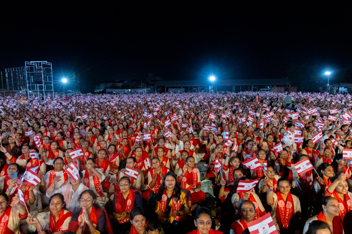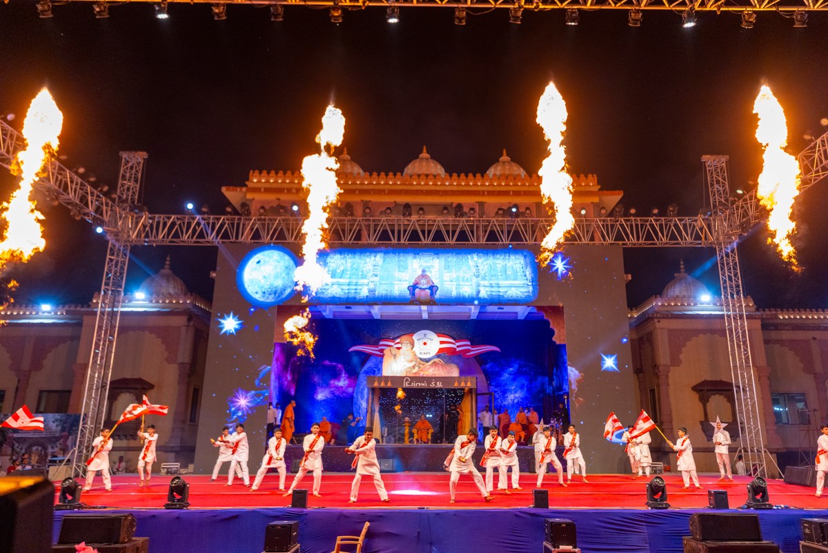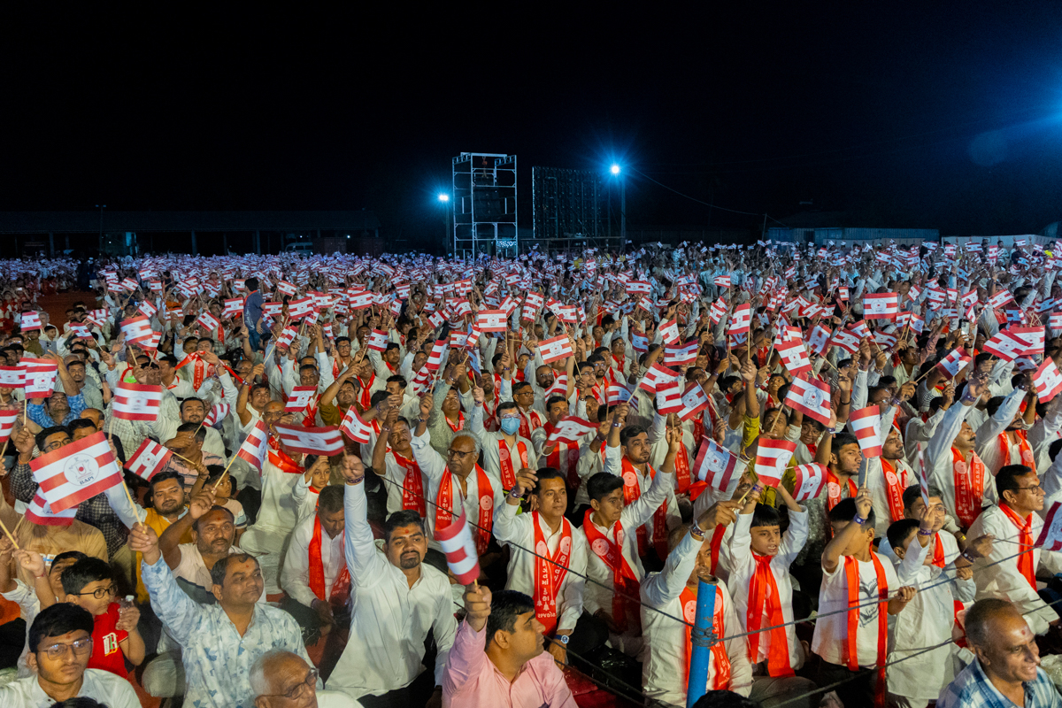 Swamis and youths sing kirtans at the beginning of the evening Rajkot Din assembly, titled 'Digantma Danka'