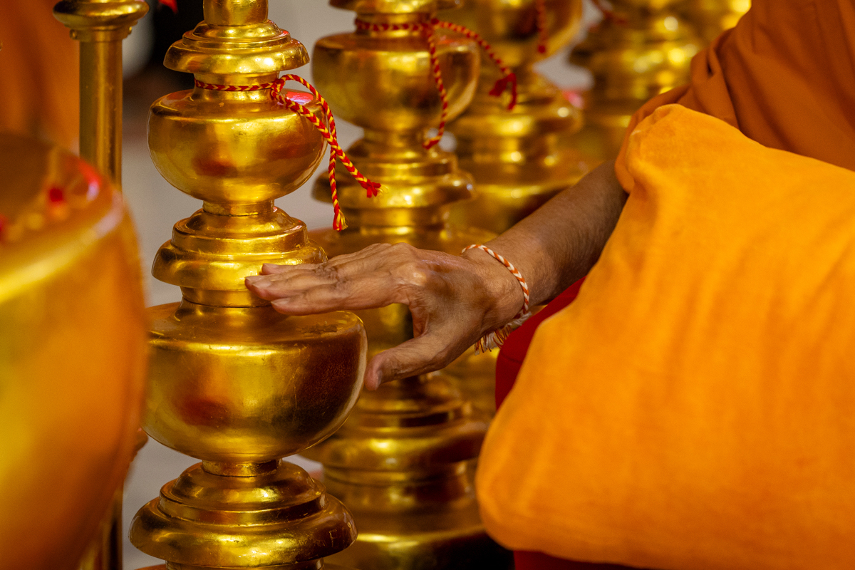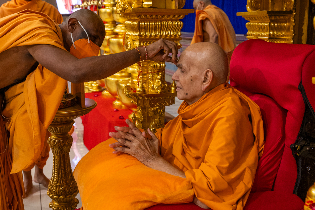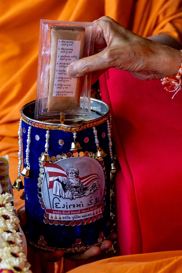 Swamishri sanctifies water with the holy relics of Bhagwan Swaminarayan and the Guru Parampara
