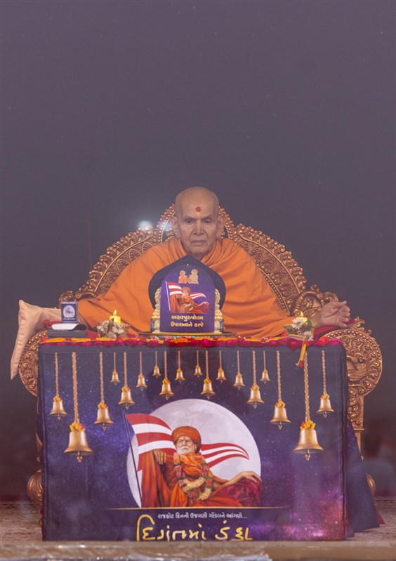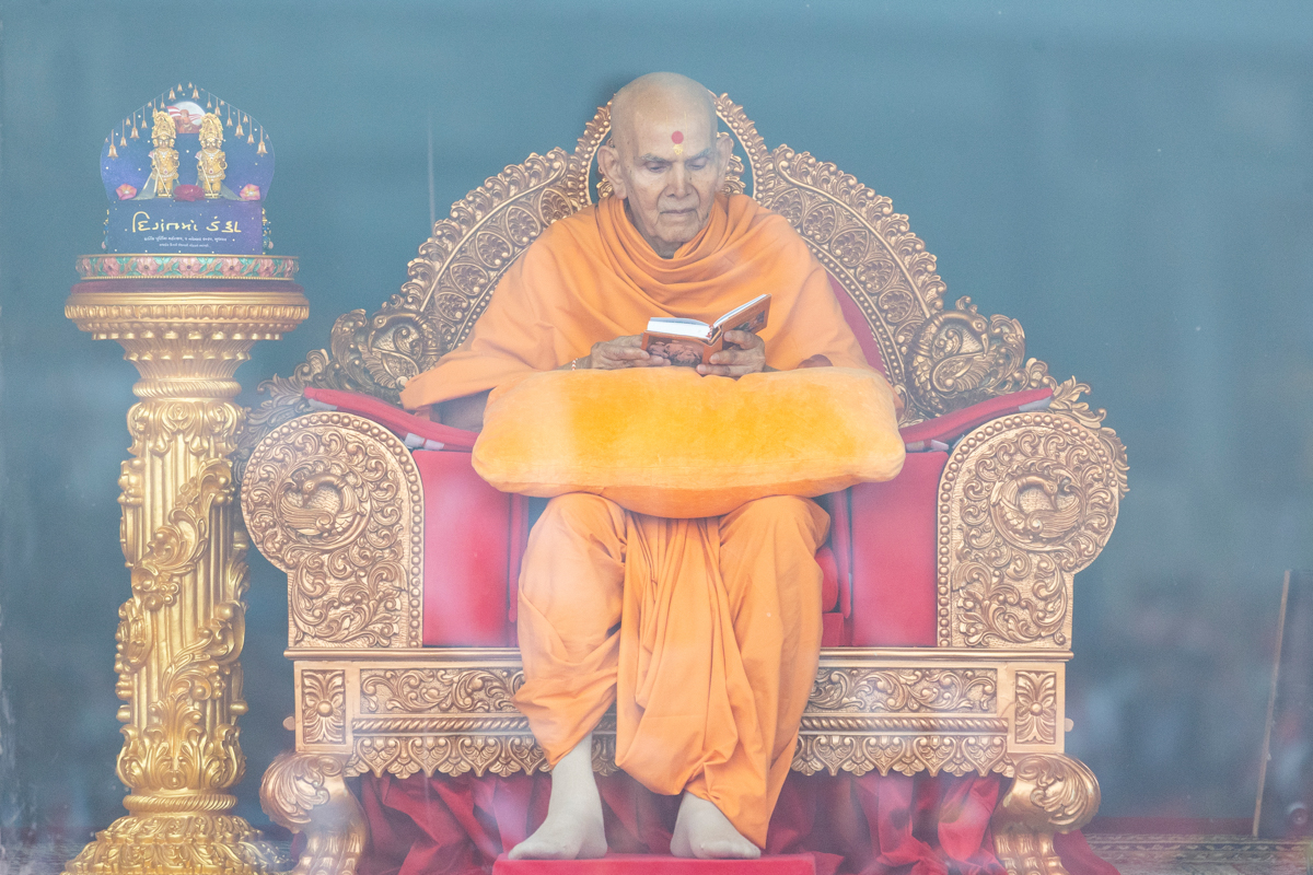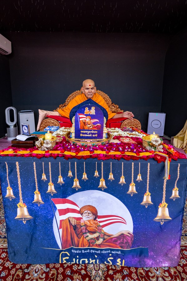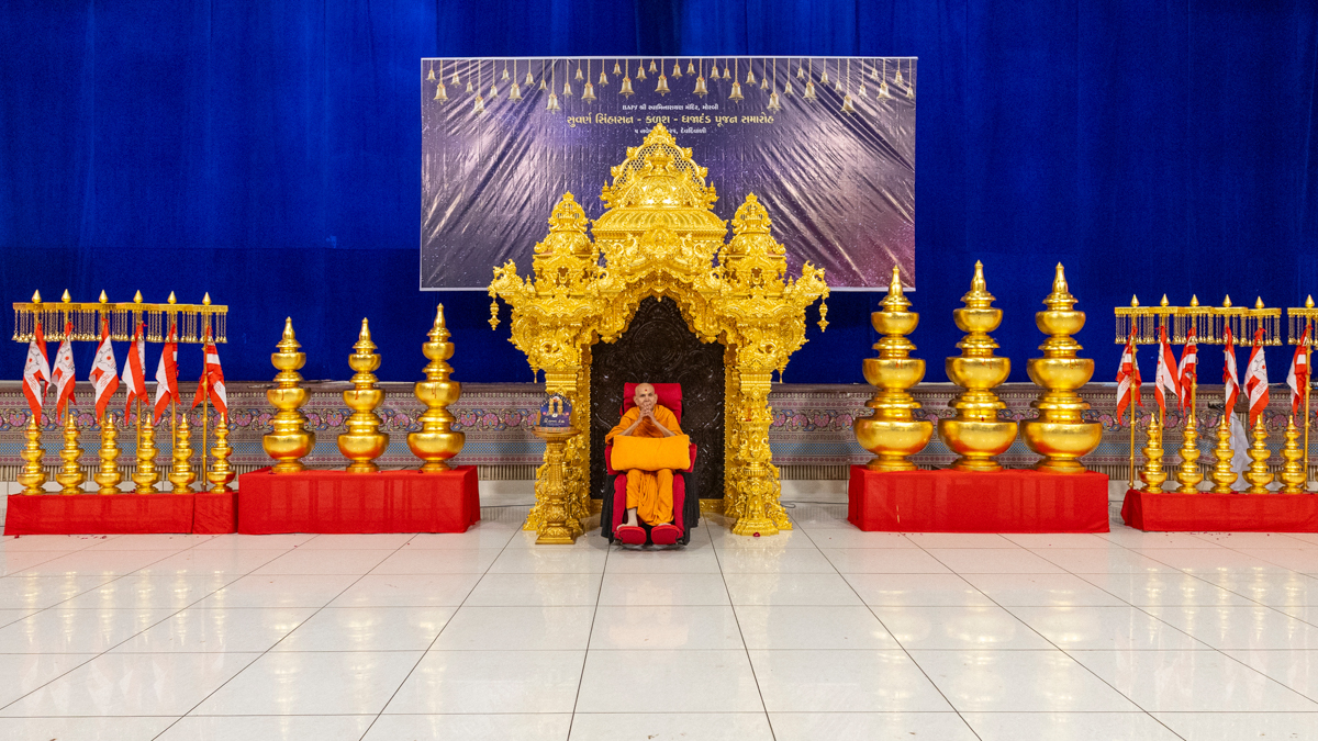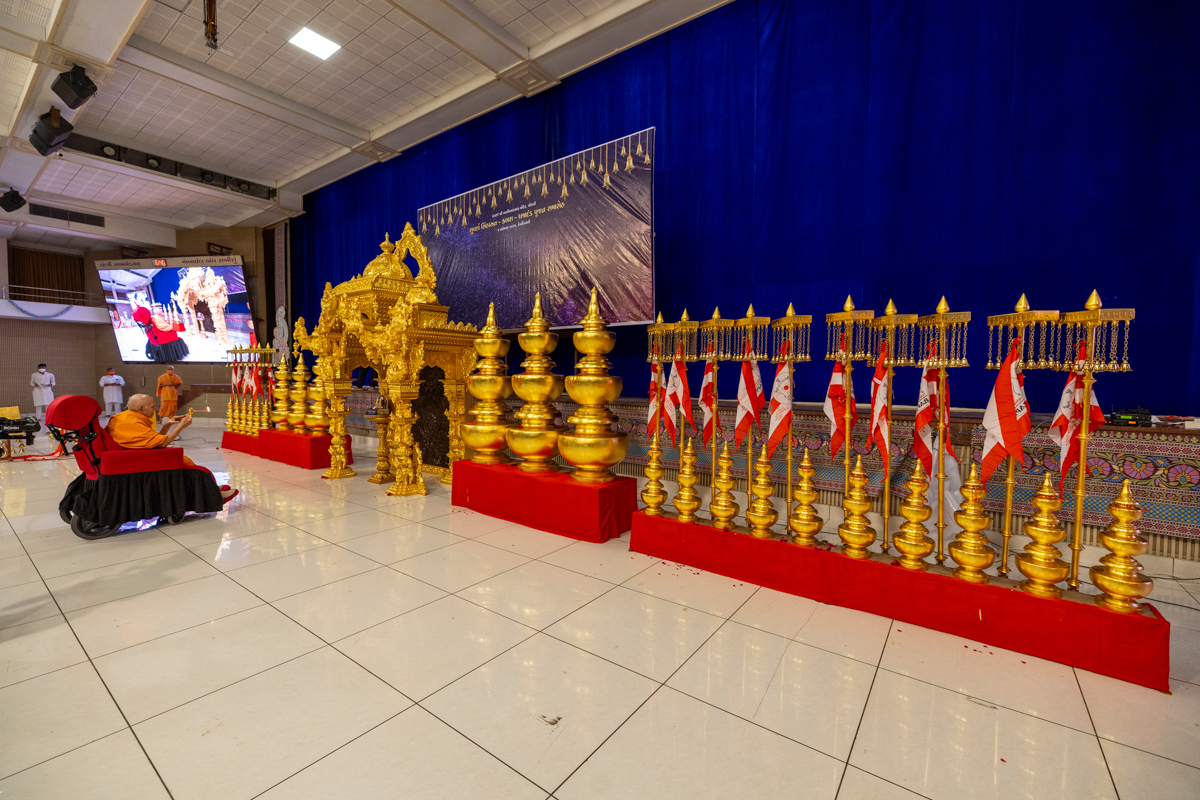 Swamishri with a sinhasan, kalashes and flagstaffs