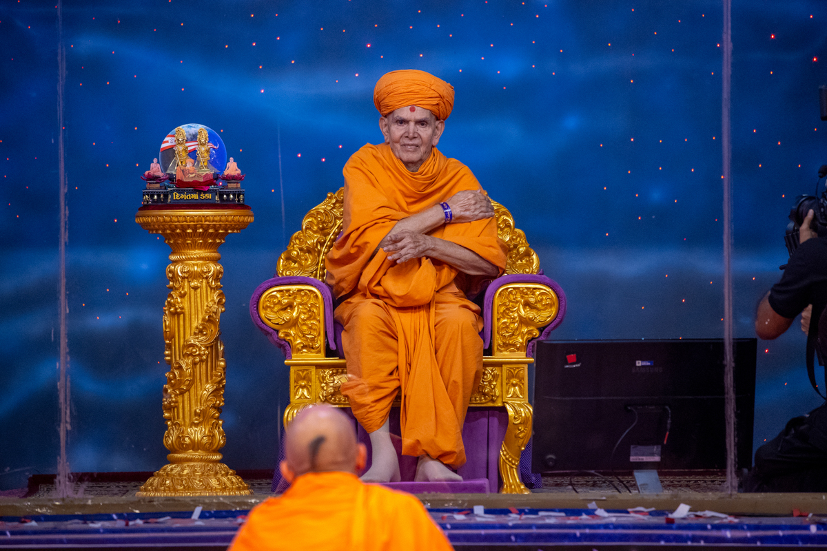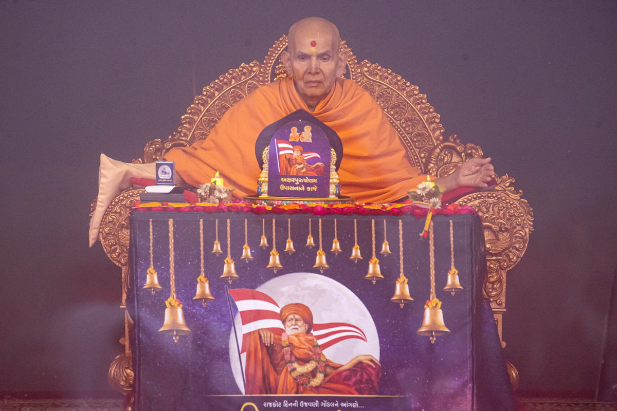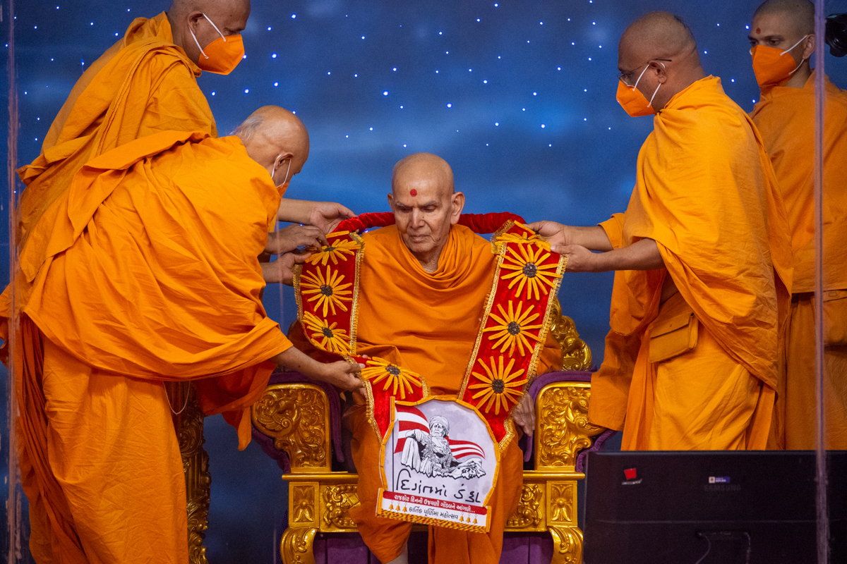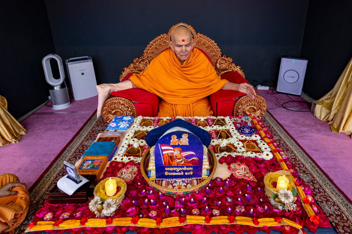 Swamishri with a sinhasan, kalashes and flagstaffs