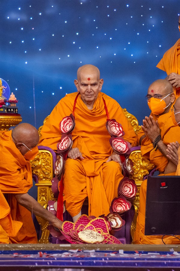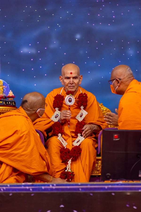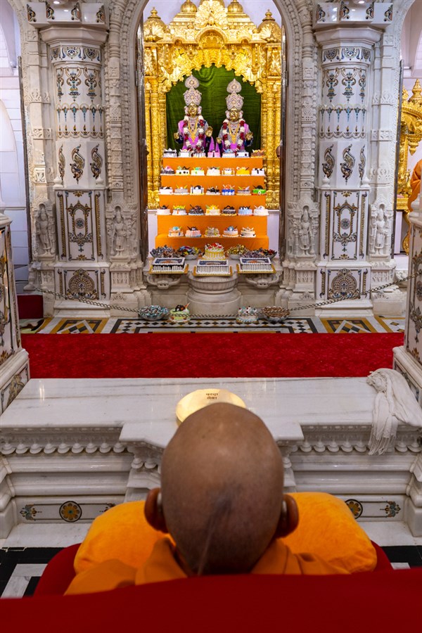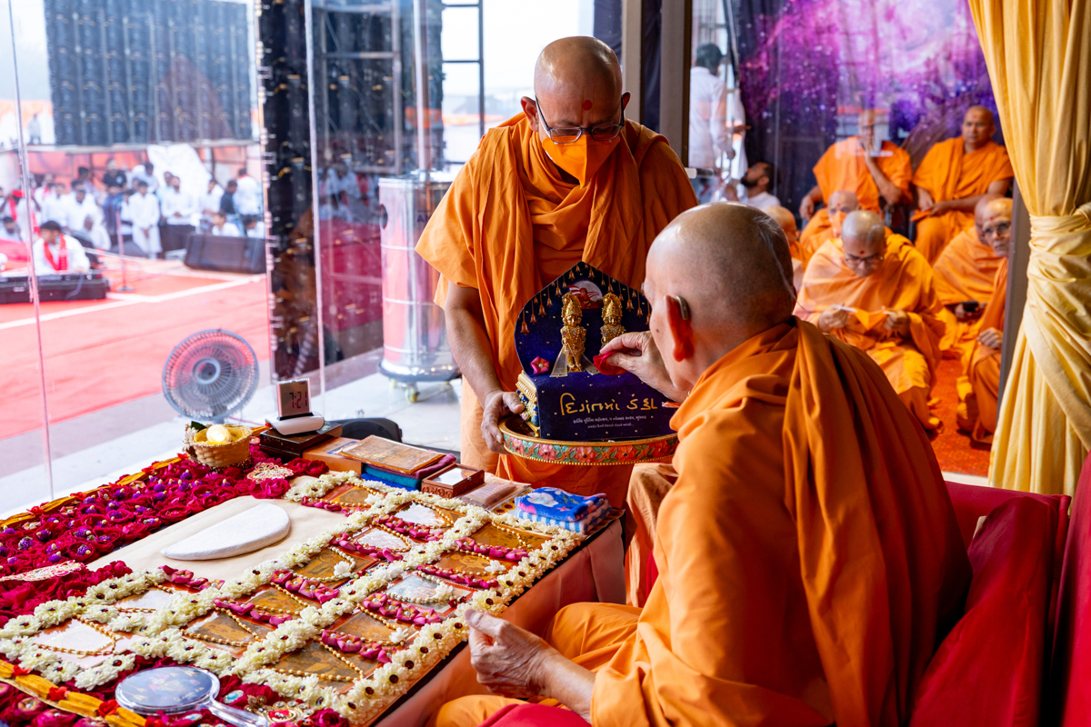 Swamishri places a flower at the feet of Shri Harikrishna Maharaj and Shri Gunatitanand Swami Maharaj