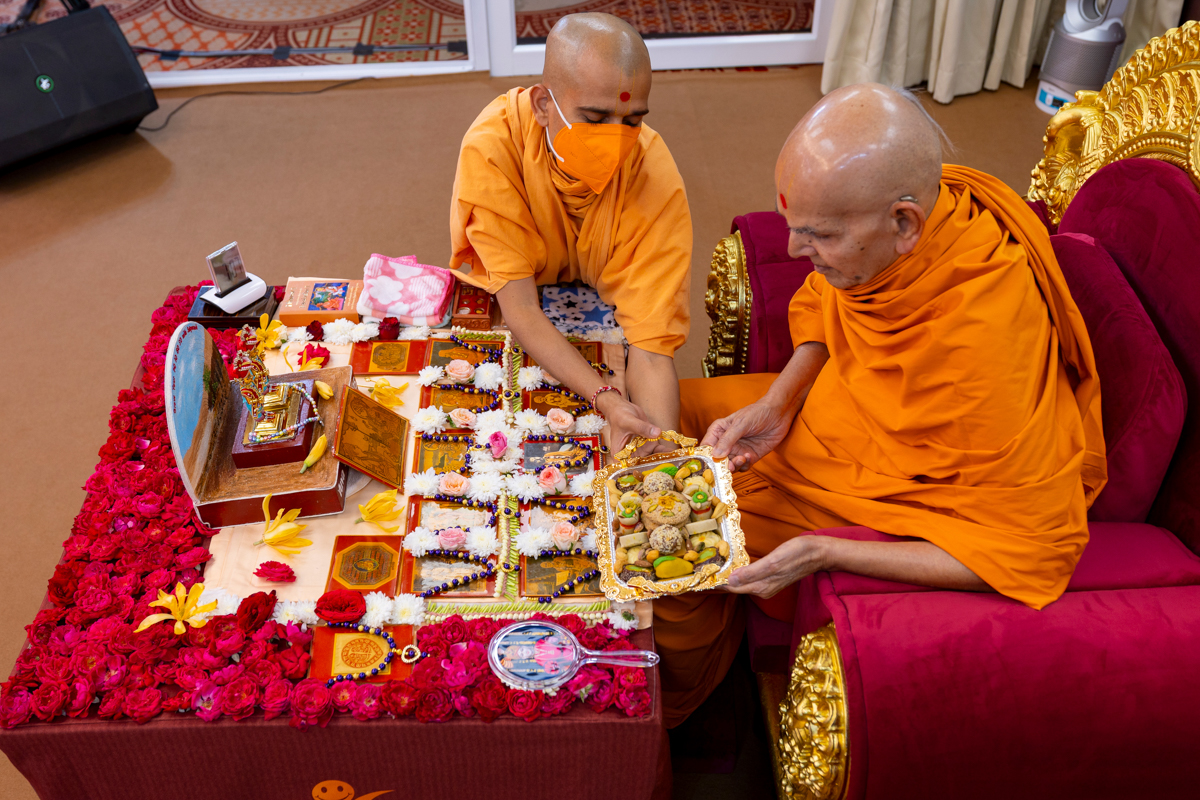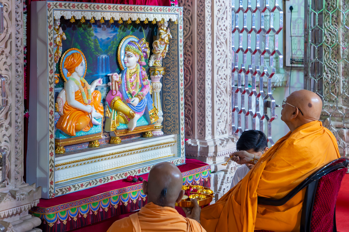 Pujya Tyagvallabh Swami and Pujya Viveksagar Swamishri doing Swamishri's puja darshan