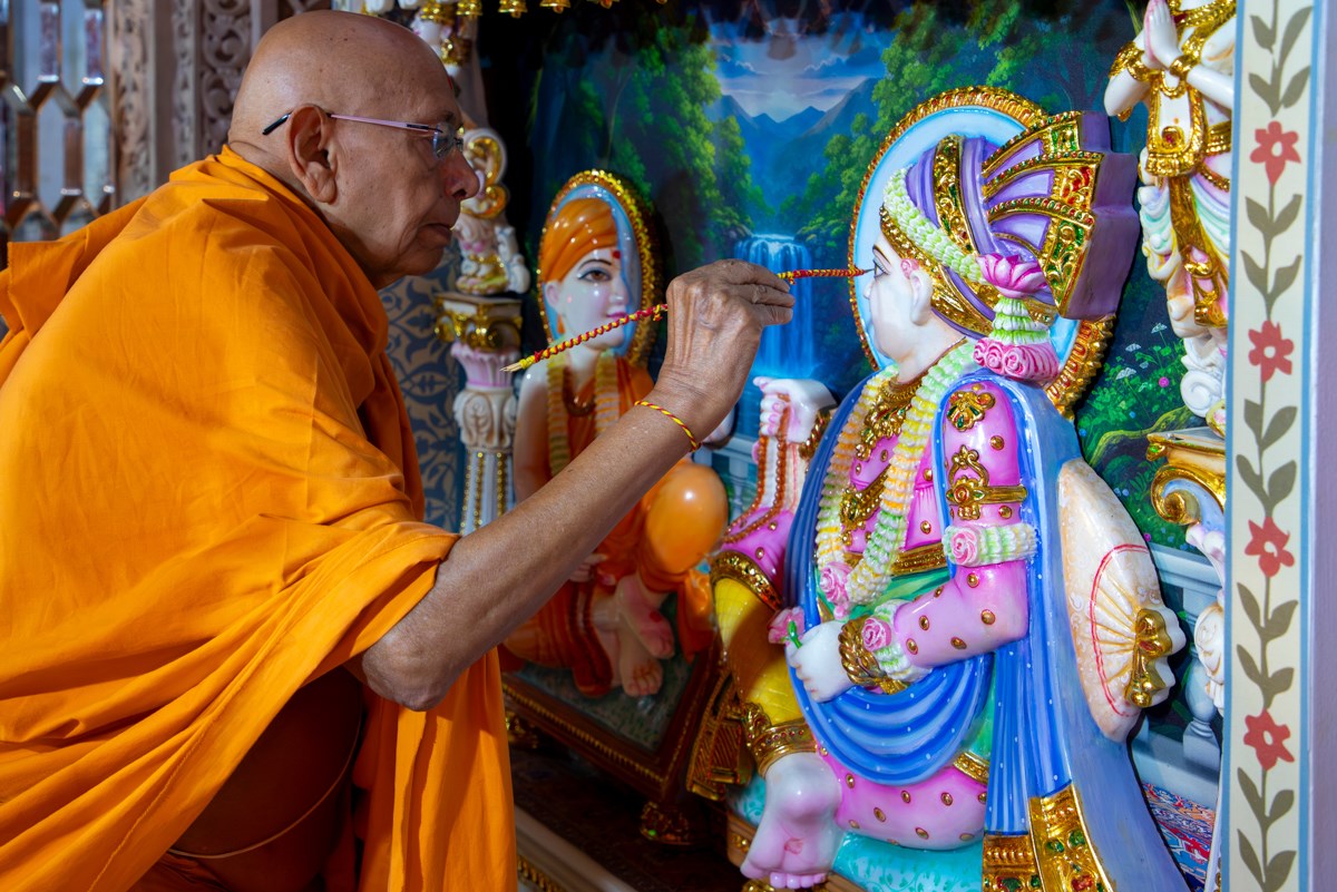 Swamishri applies chandan on a tilakiyu