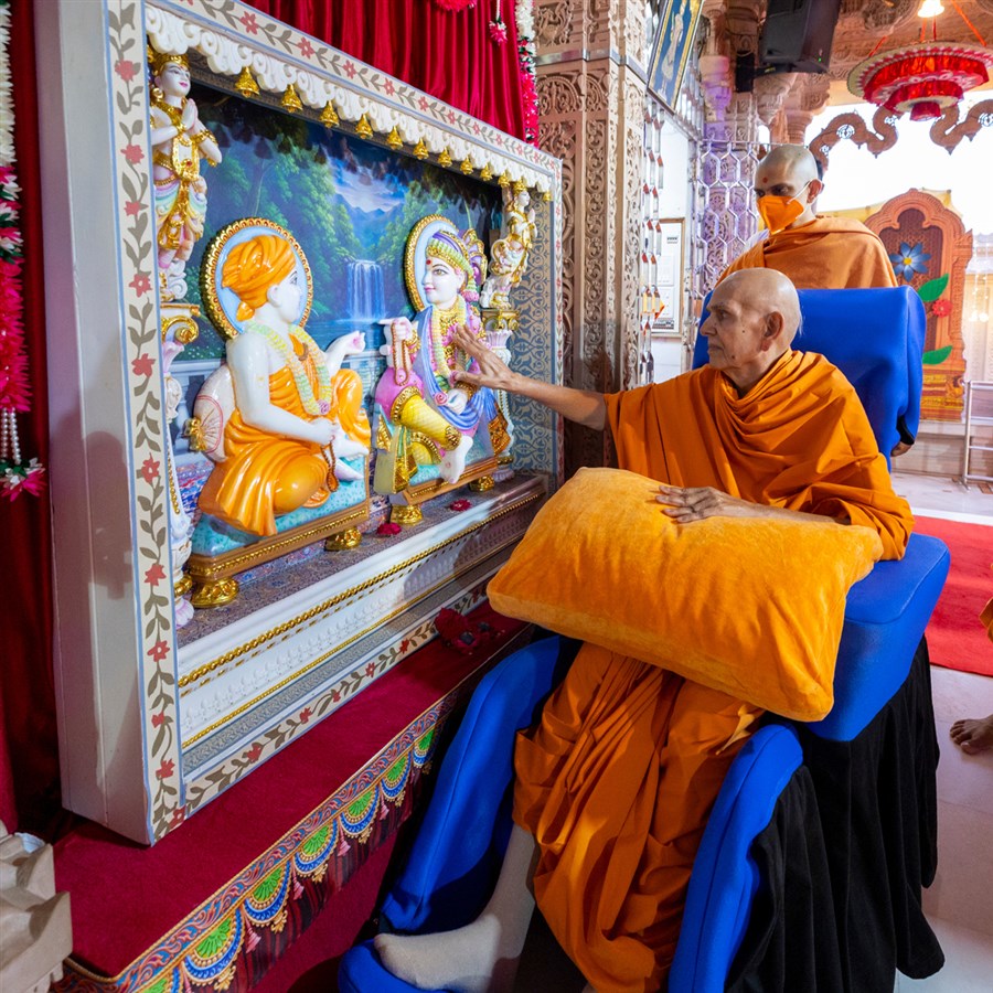 Swamishri engrossed in darshan of Shri Harikrishna Maharaj and Shri Gunatitanand Swami Maharaj