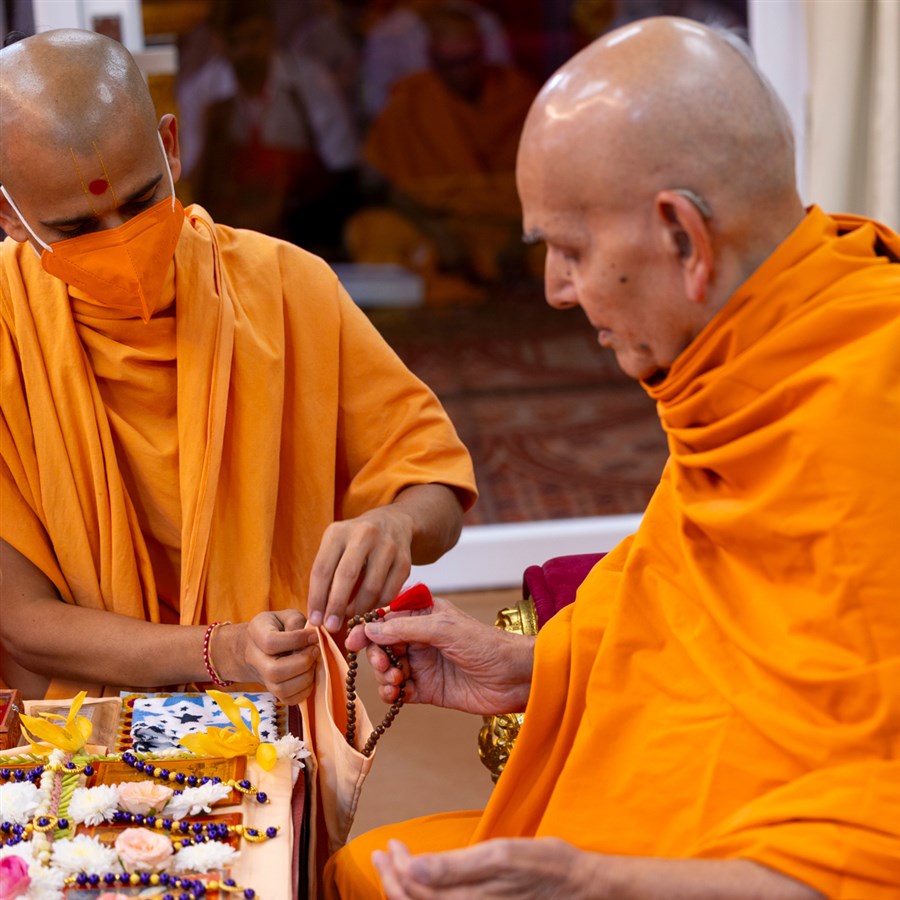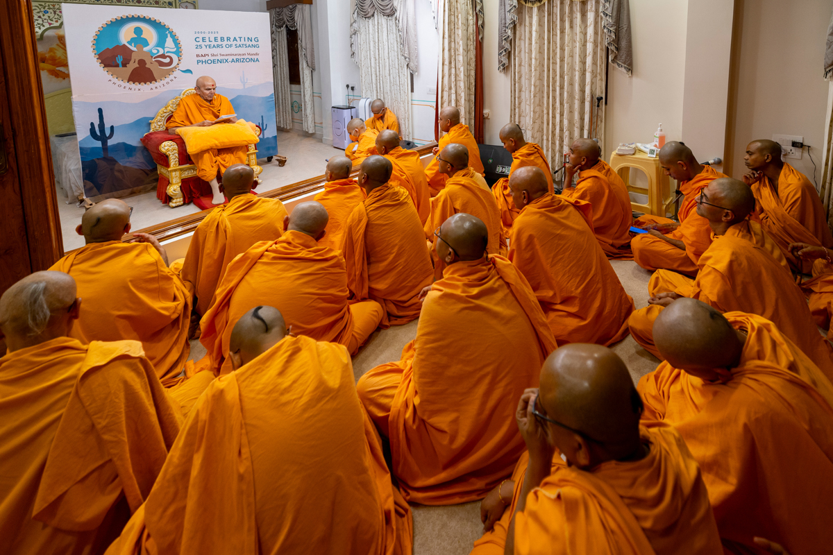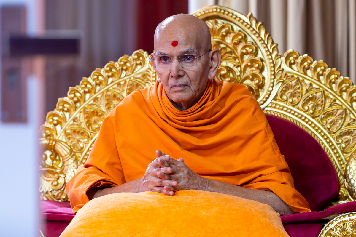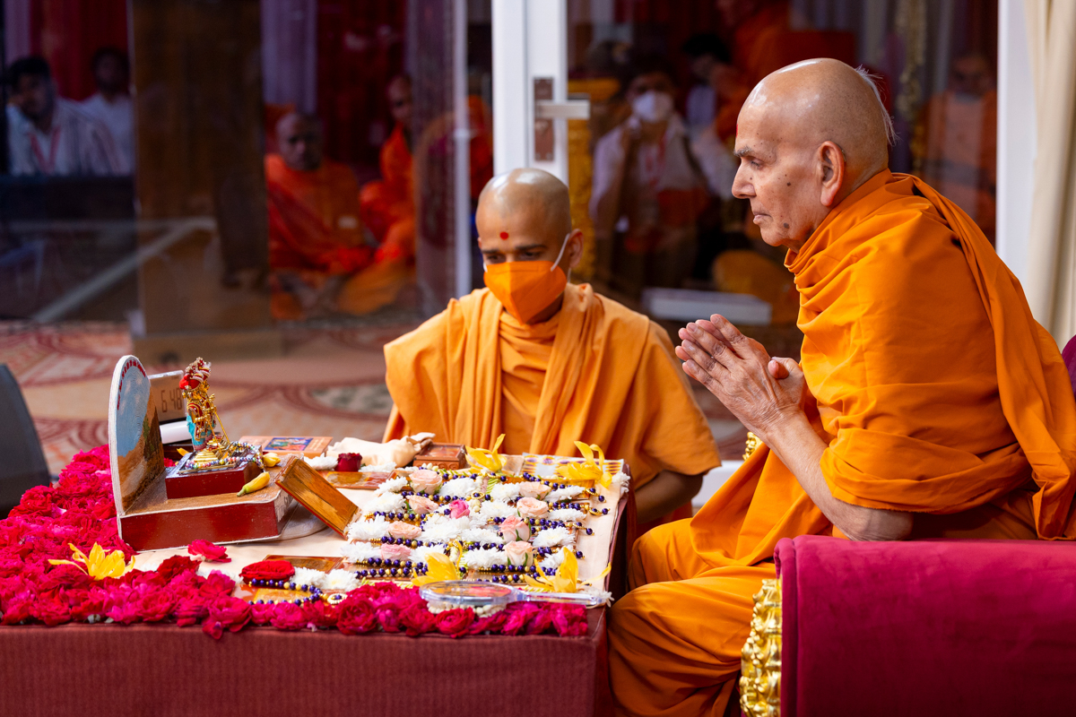 Swamishri listens to the sadhana mantra and daily prayer