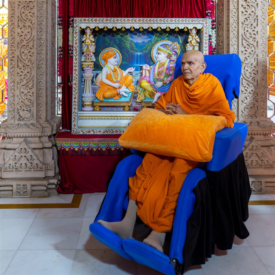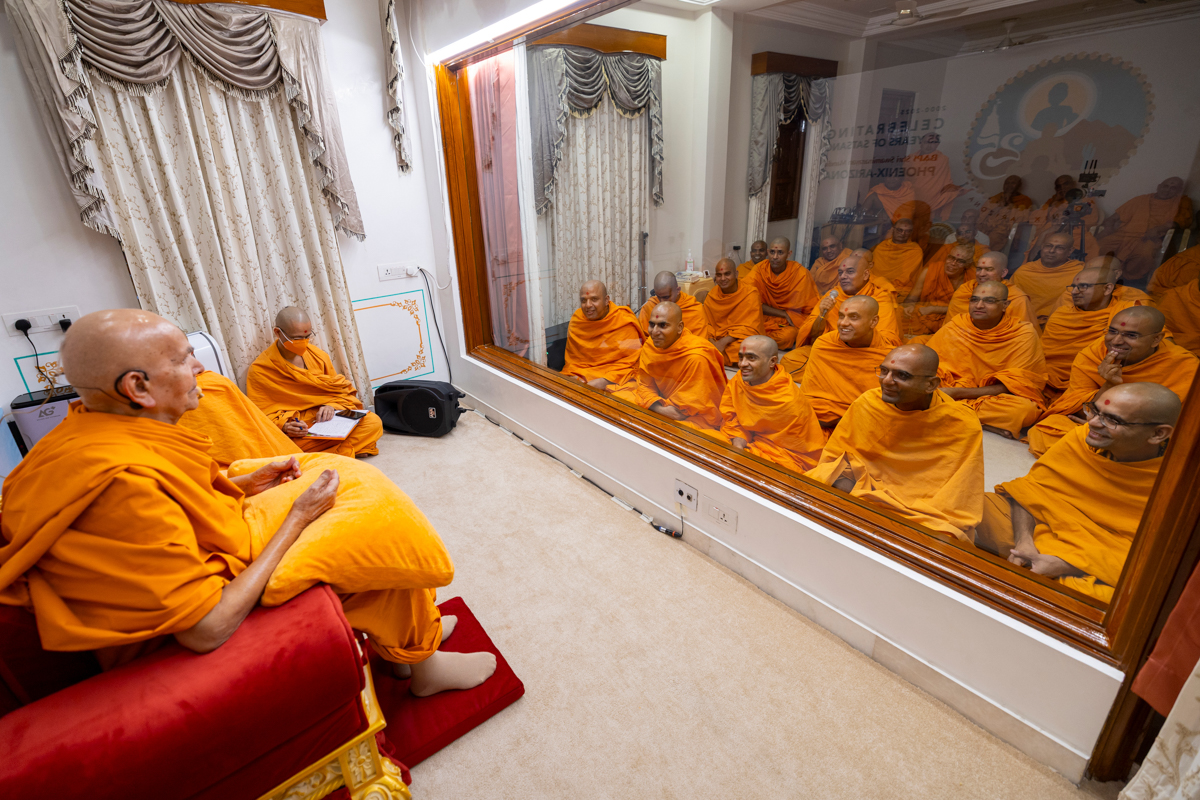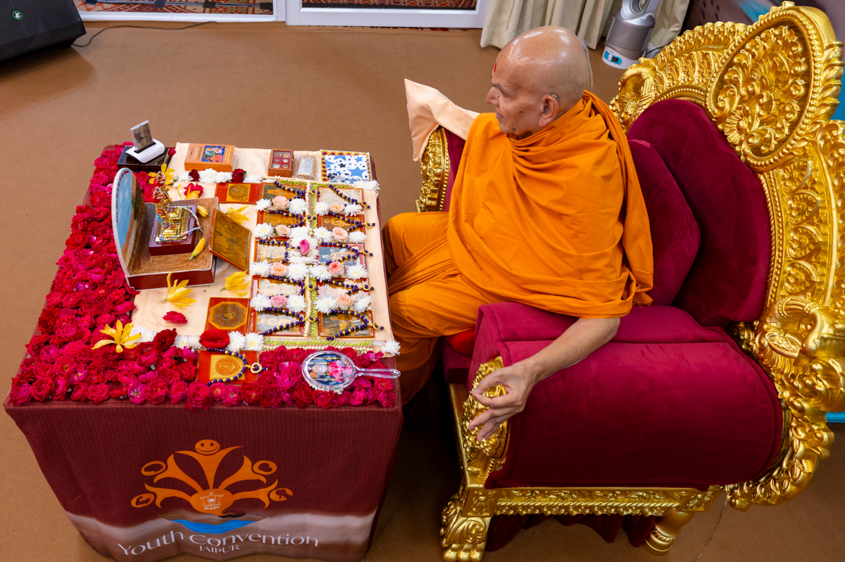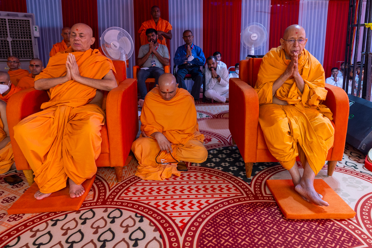 Swamishri listens to the sadhana mantra and daily prayer