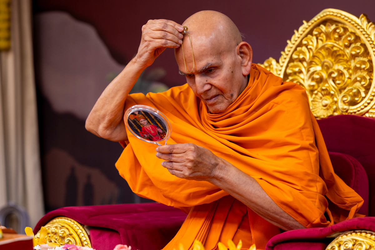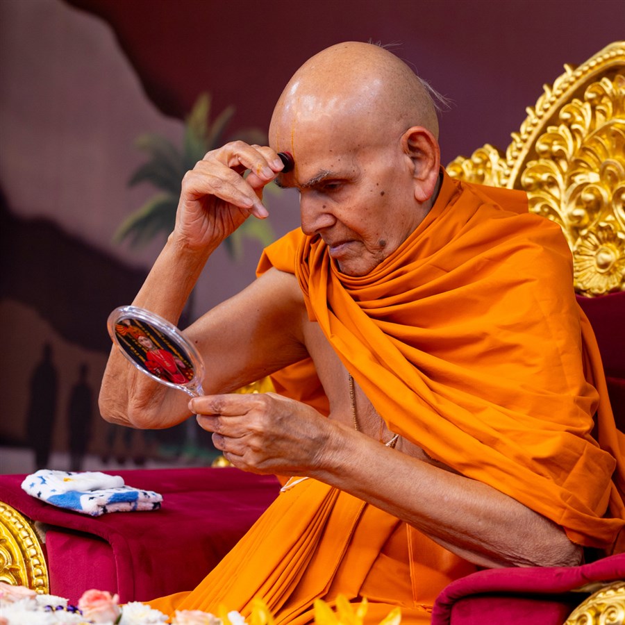 Swamishri applies a tilak on his forehead
