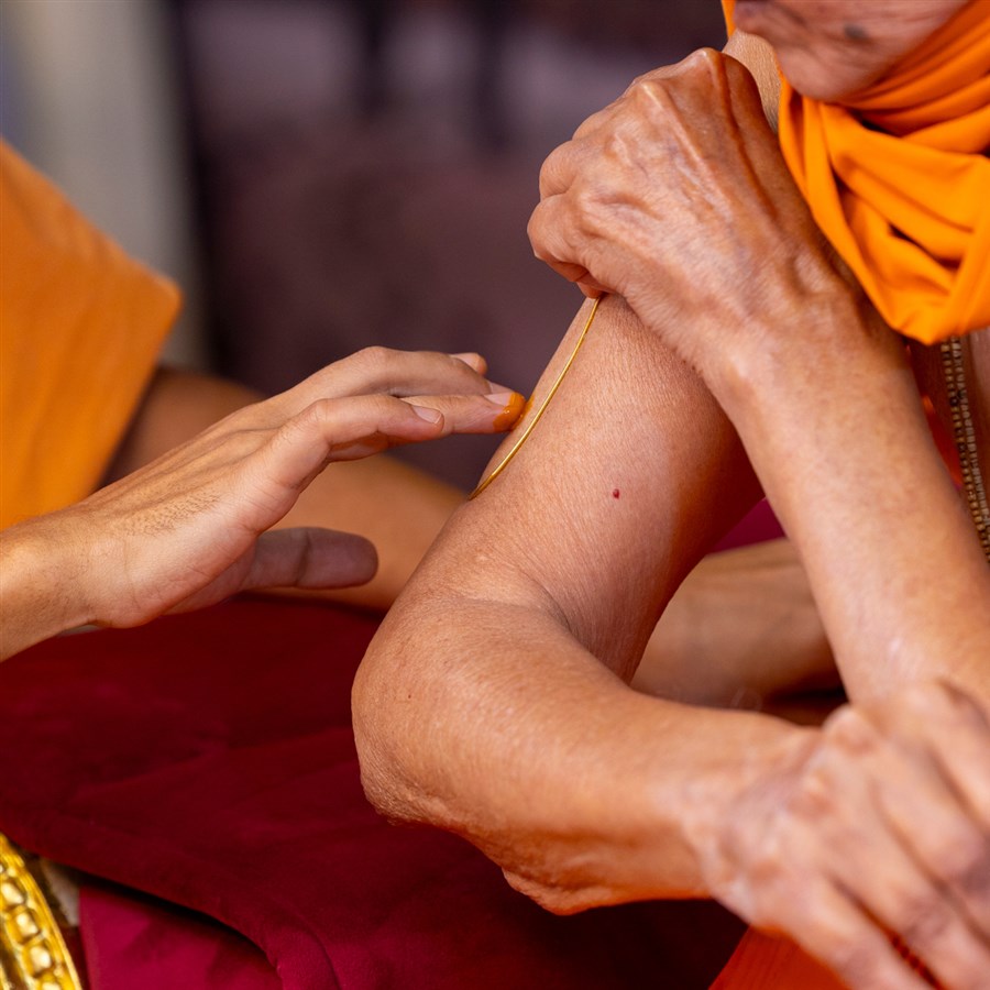 Swamishri applies a tilak on his upper arm