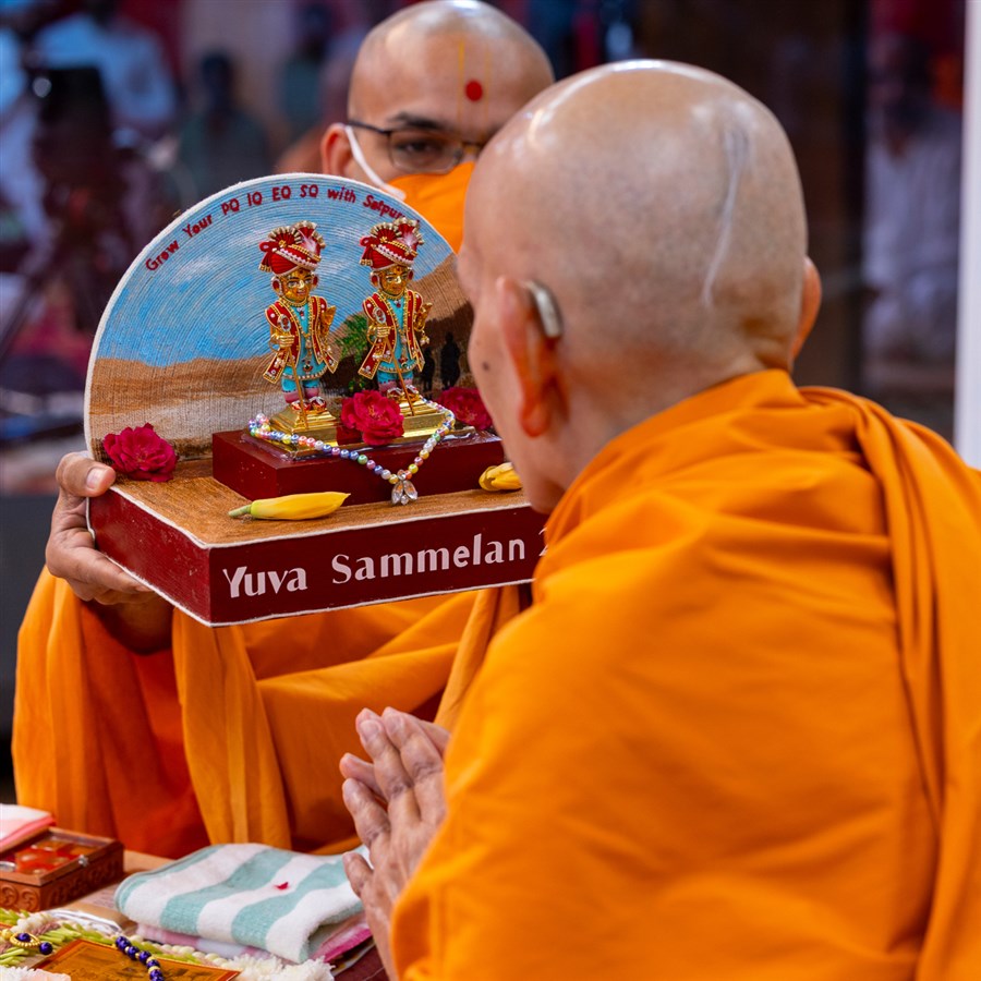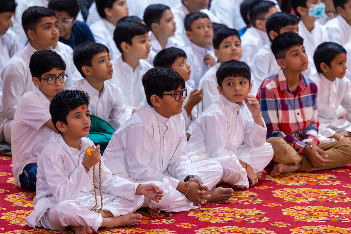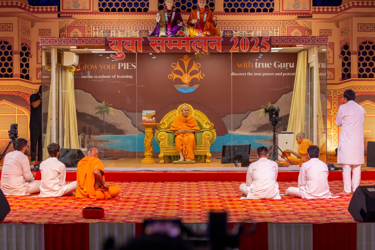 Youths lead everyone in reciting the sadhana mantra and daily prayer in Swamishri's puja