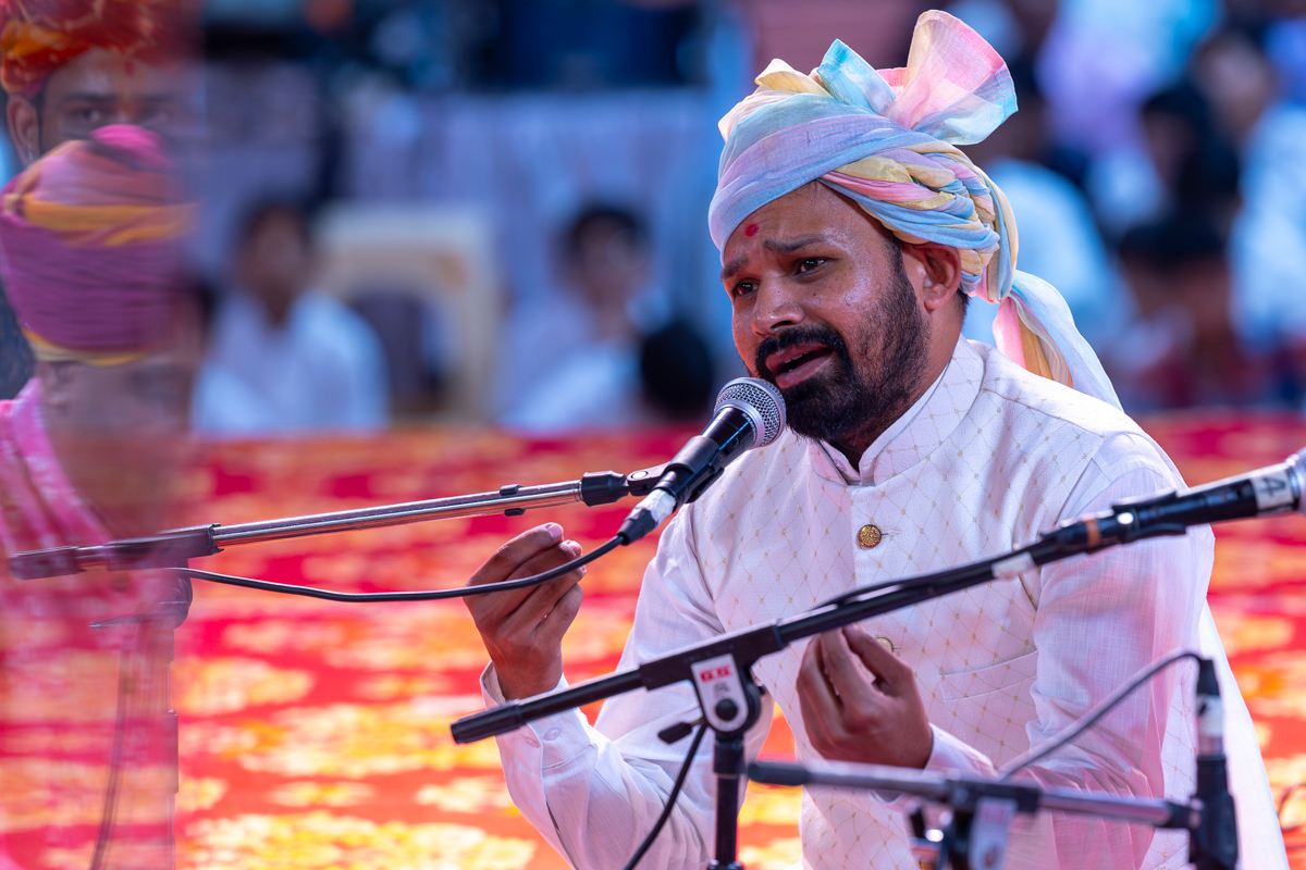 A youth sings a kirtan in Swamishri's daily puja