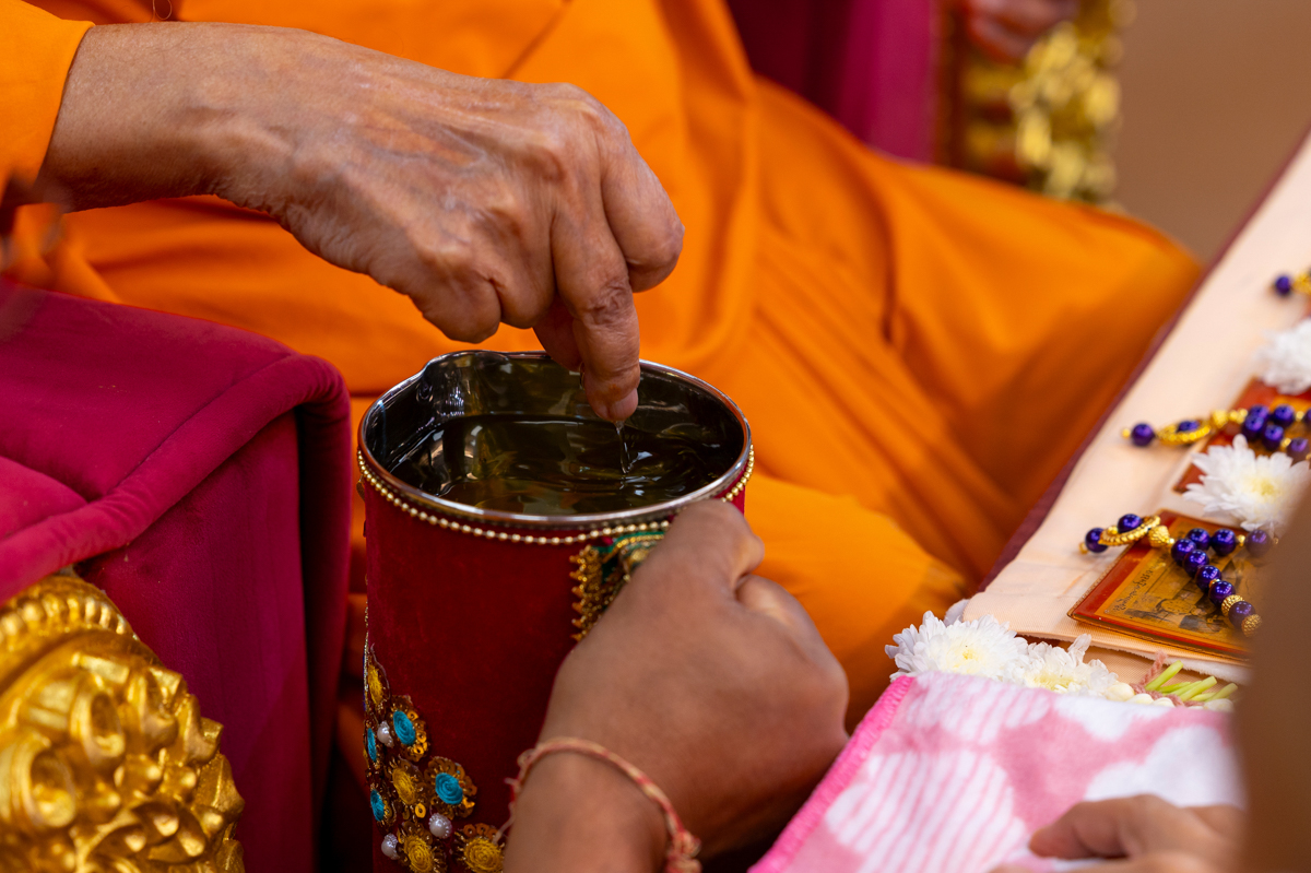 Swamishri sanctifies water with the holy relics of Bhagwan Swaminarayan and the Guru Parampara