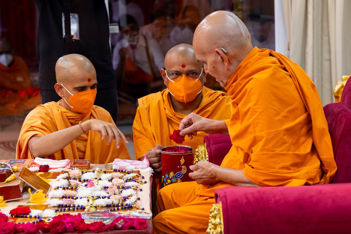 Swamishri adds flowers to the sanctified water