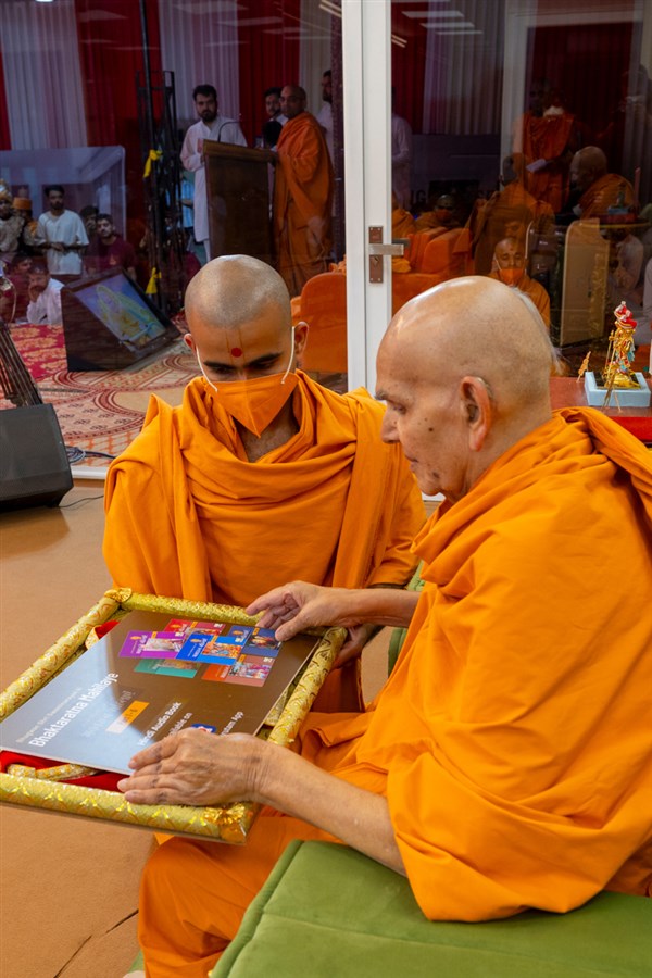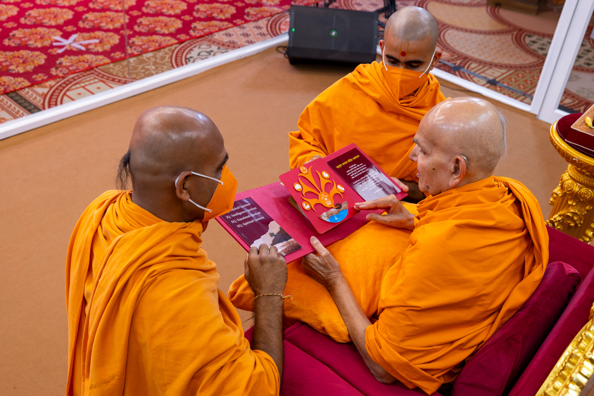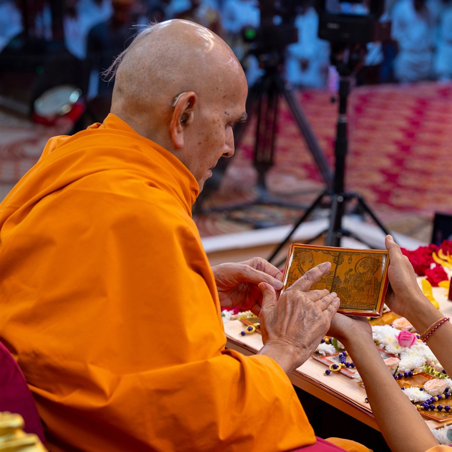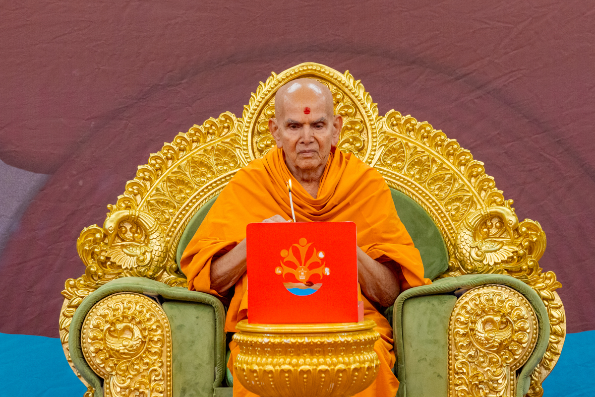 Swamishri observes an invitation card for the evening Yuva Din assembly