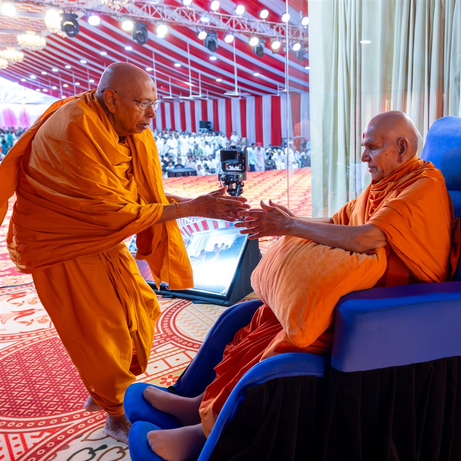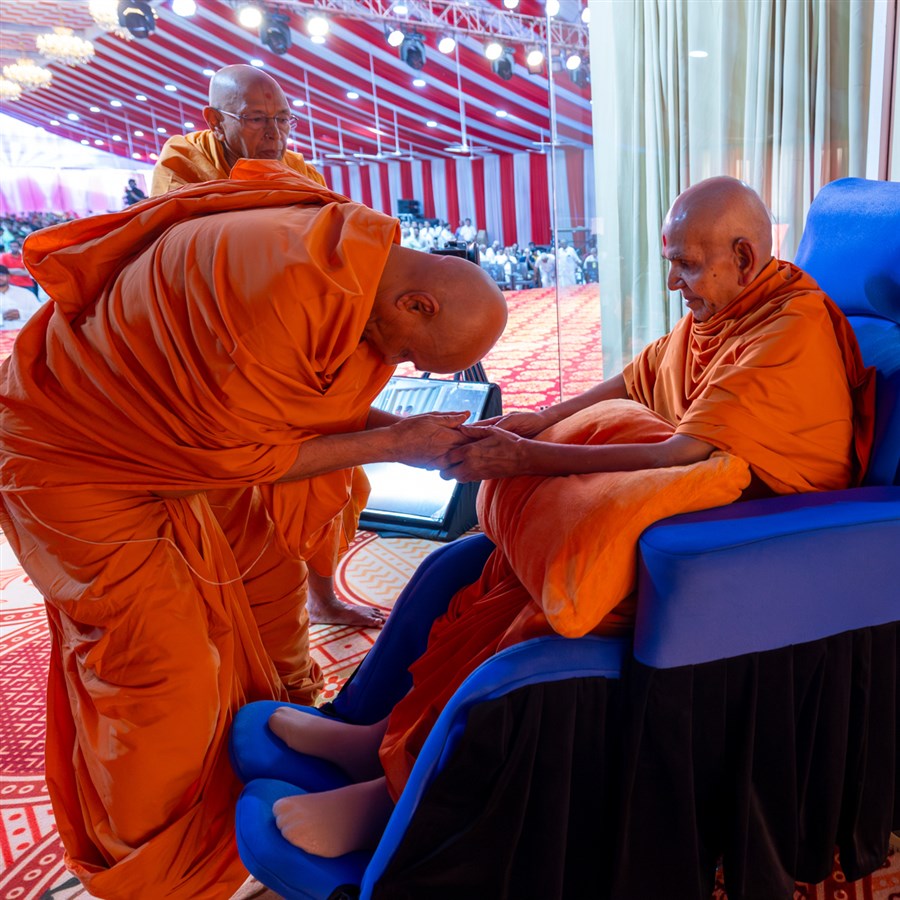Pujya Tyagvallabh Swami greets Swamishri
