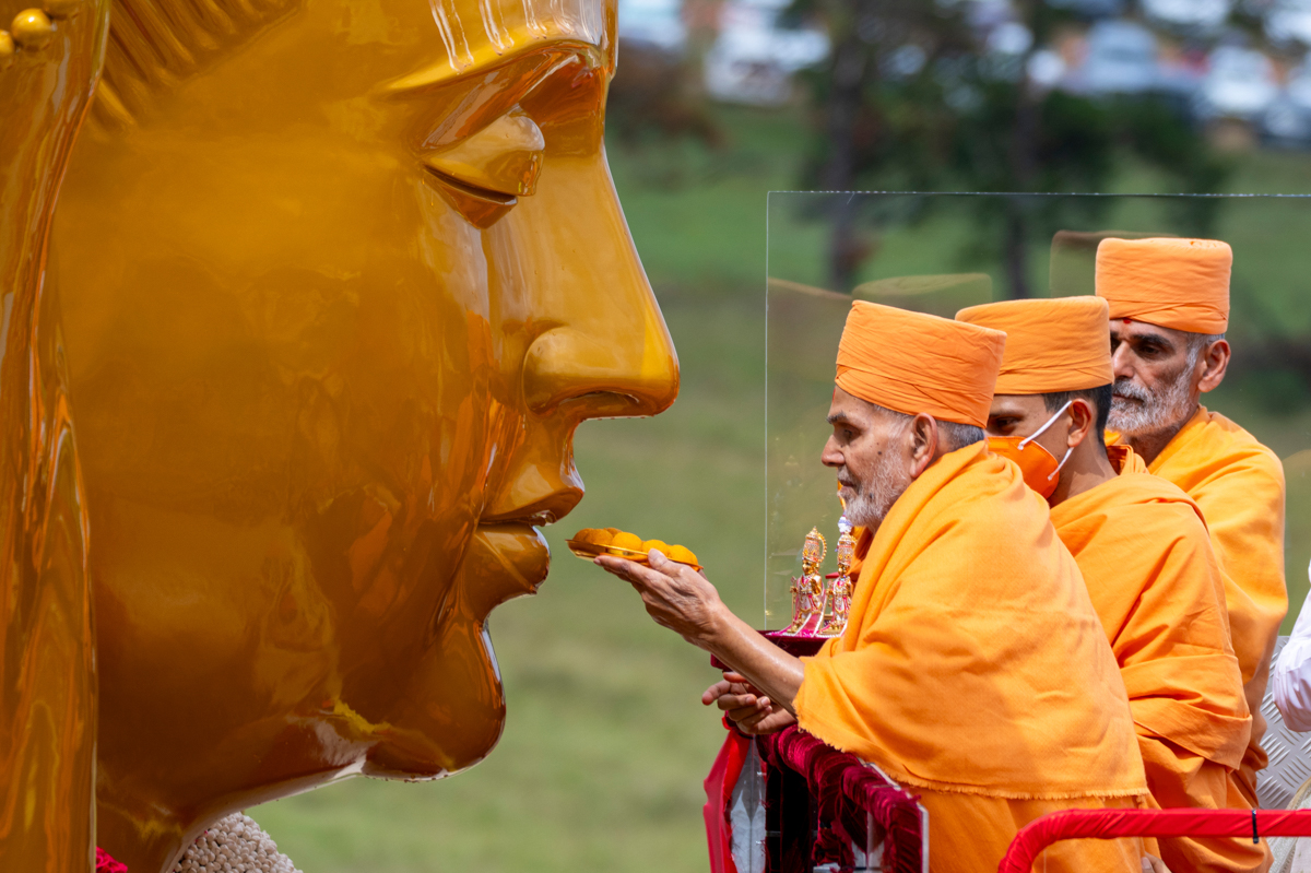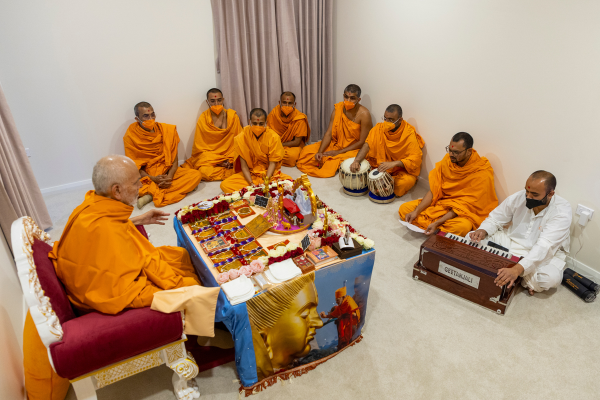 Param Pujya Mahant Swami Maharaj performs the morning arti