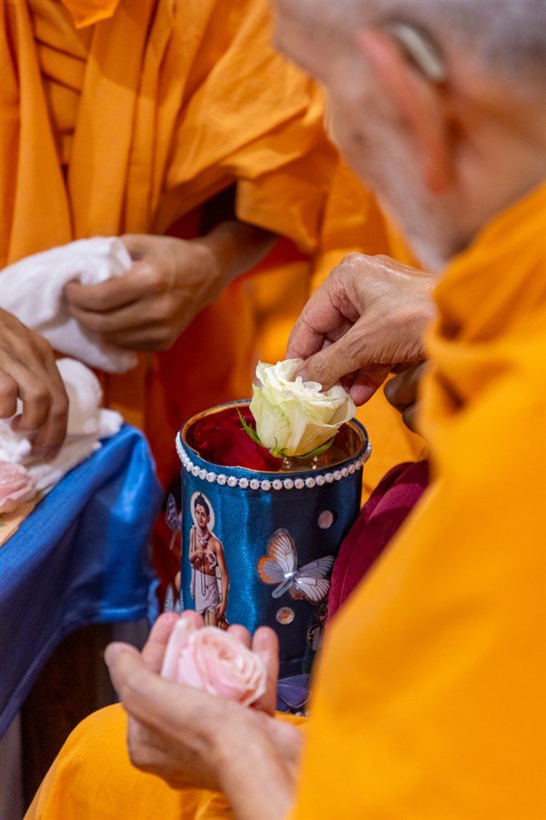 Swamishri offers a flower to Shri Harikrishna Maharaj and Shri Gunatitanand Swami Maharaj