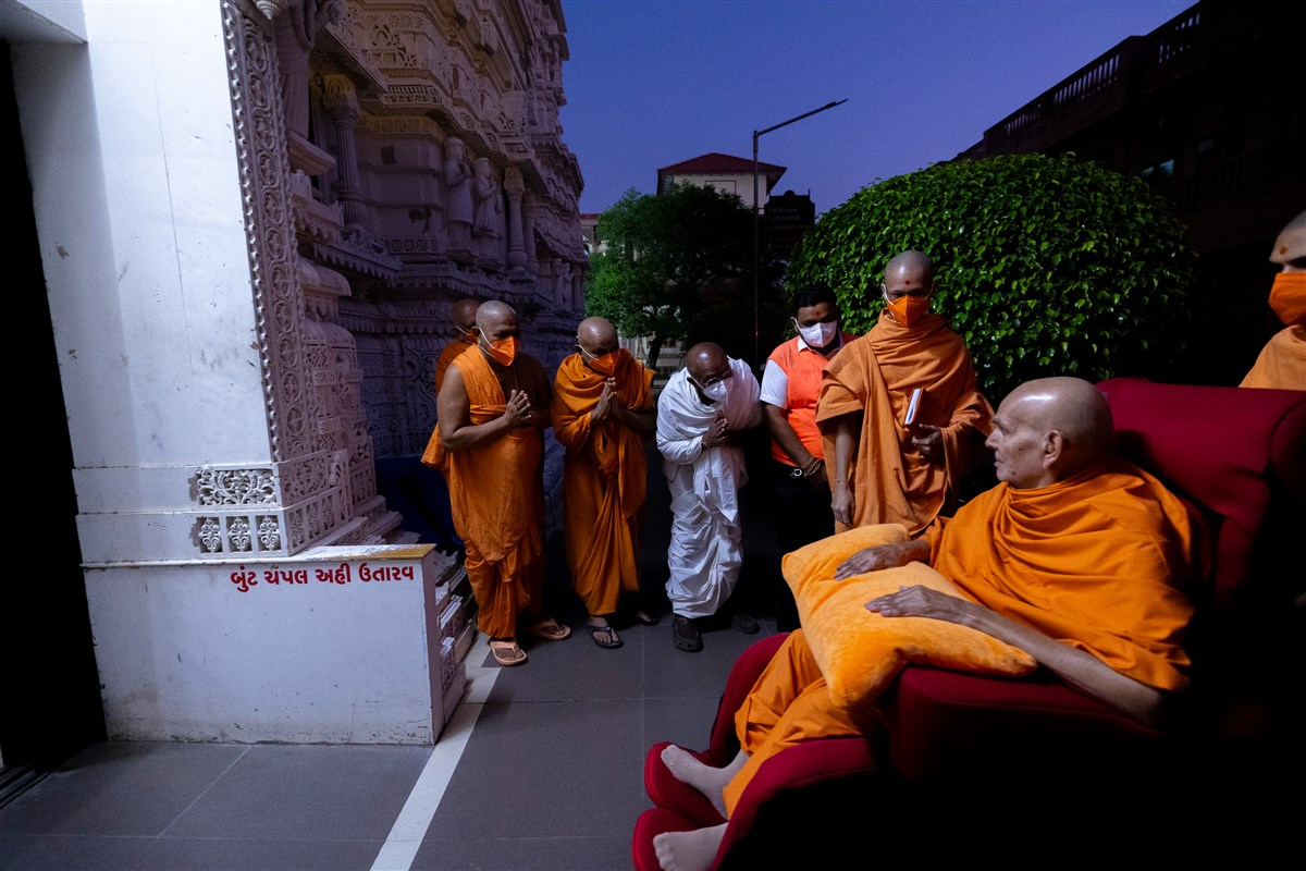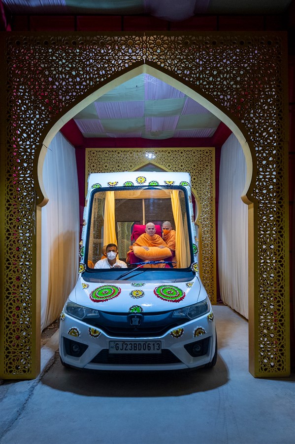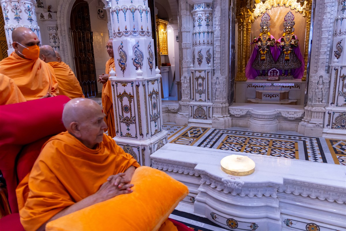 Swamishri arrives for darshan of Bhagwan Swaminarayan and Aksharbrahma Gunatitanand Swami