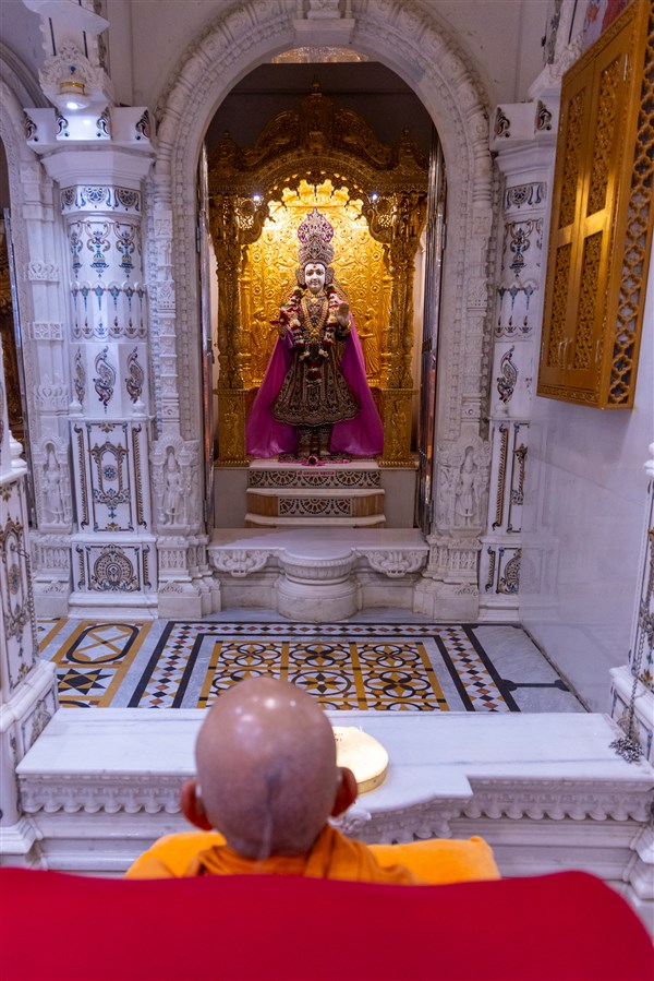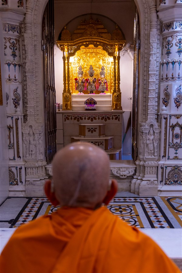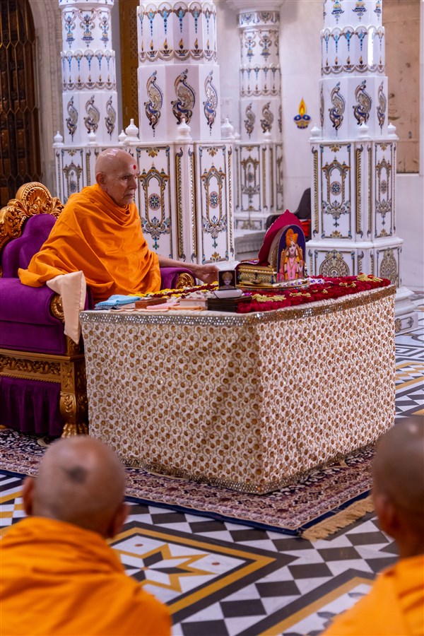 Swamishri performs his daily puja under the mandir dome