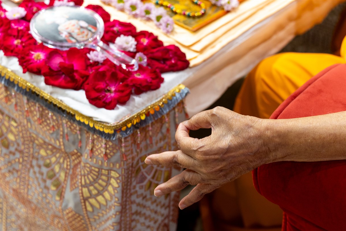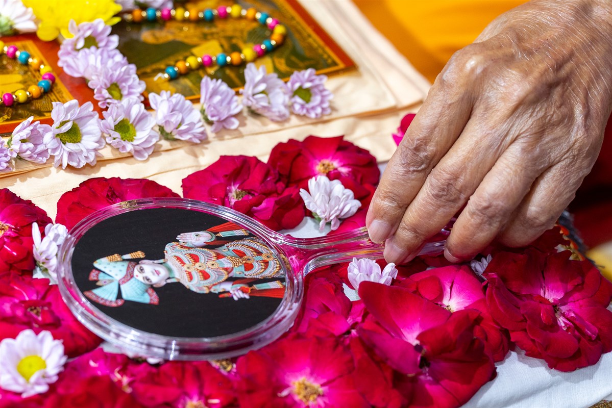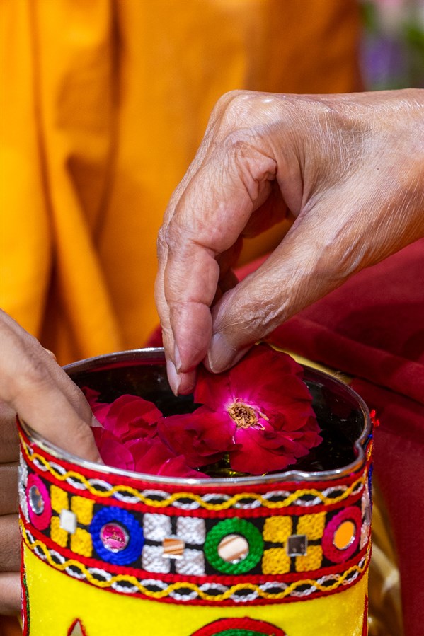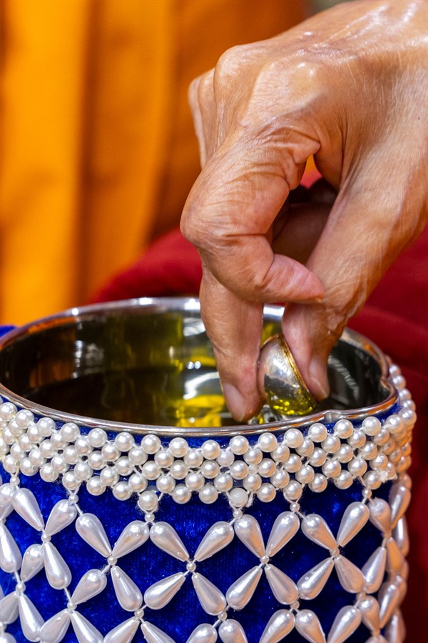 Swamishri sanctifies water with the holy relics of Bhagwan Swaminarayan and the Guru Parampara