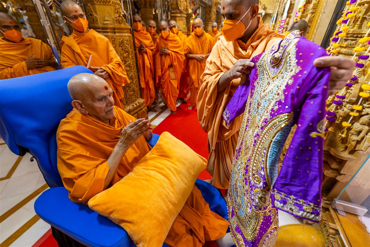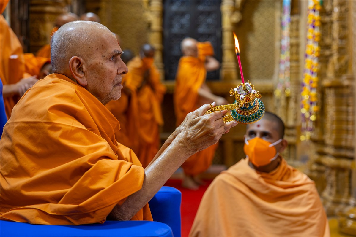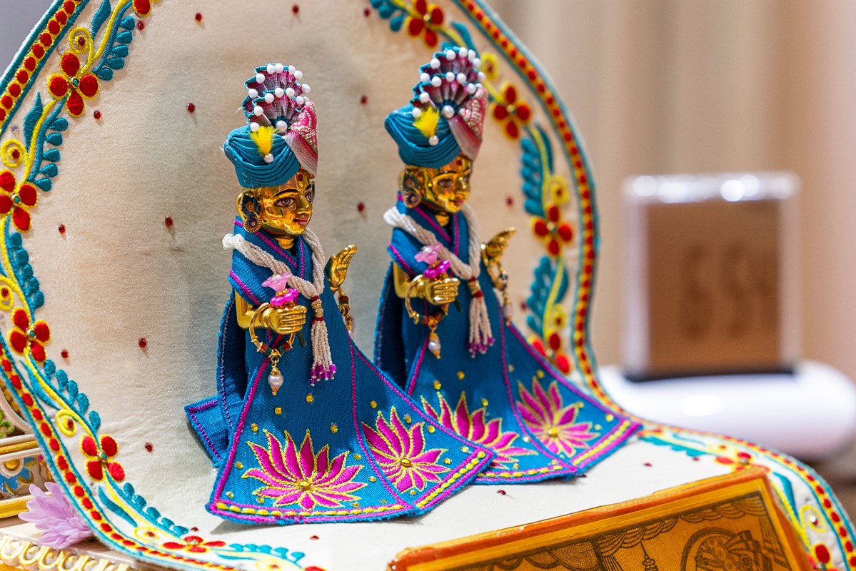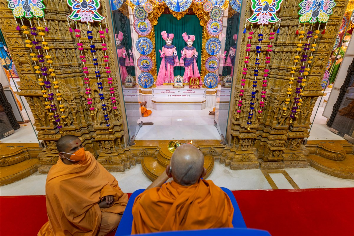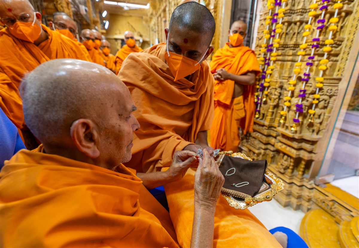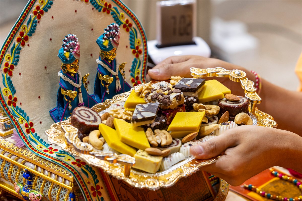 Swamishri offers thal to Shri Harikrishna Maharaj and Shri Gunatitanand Swami Maharaj