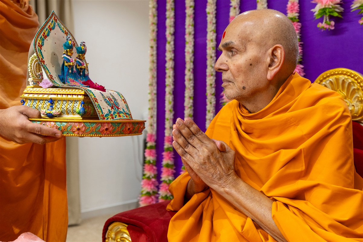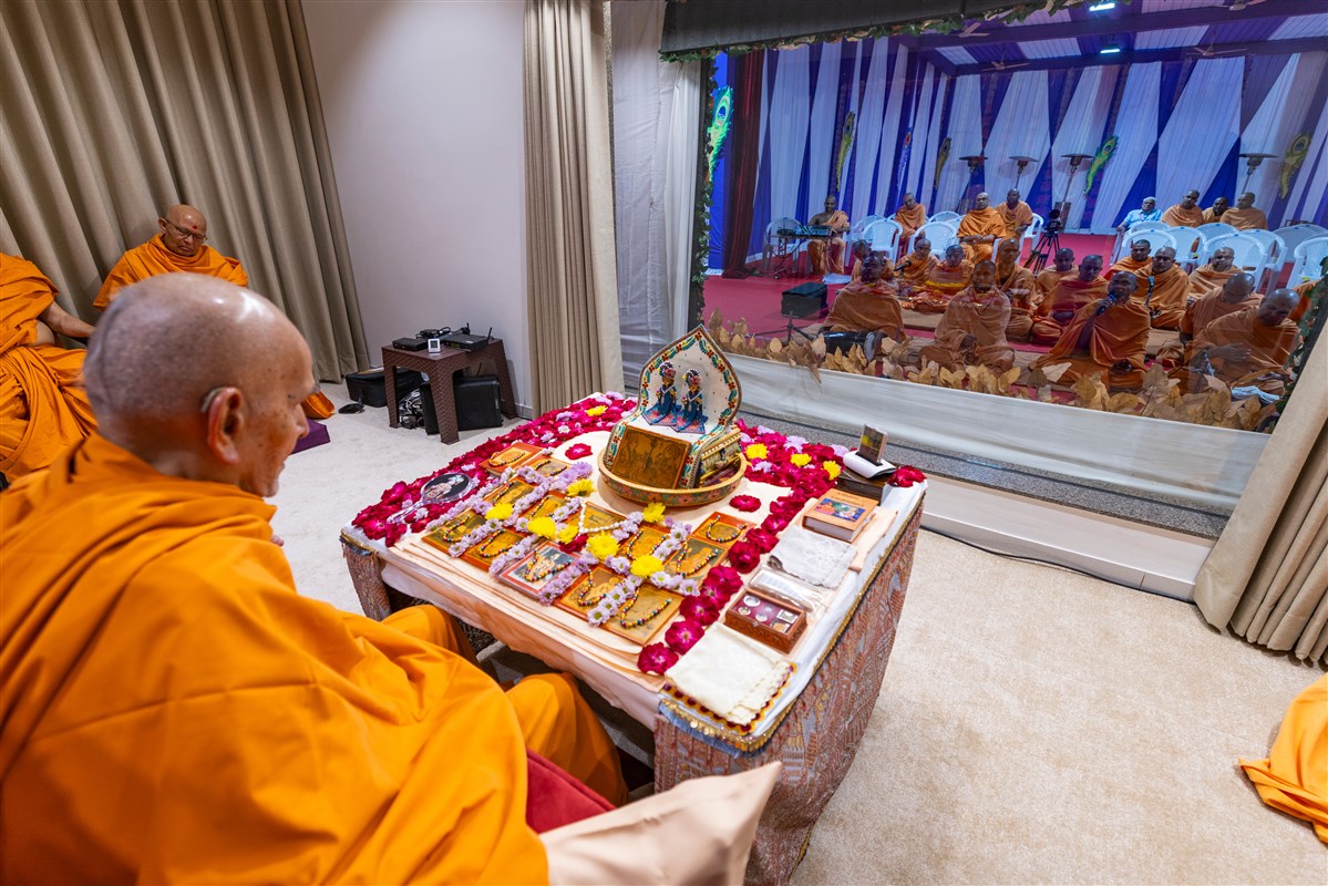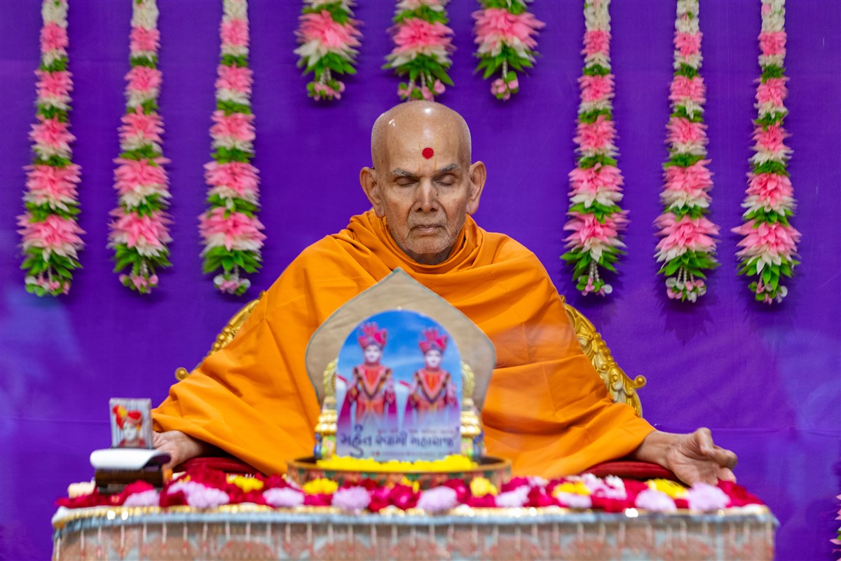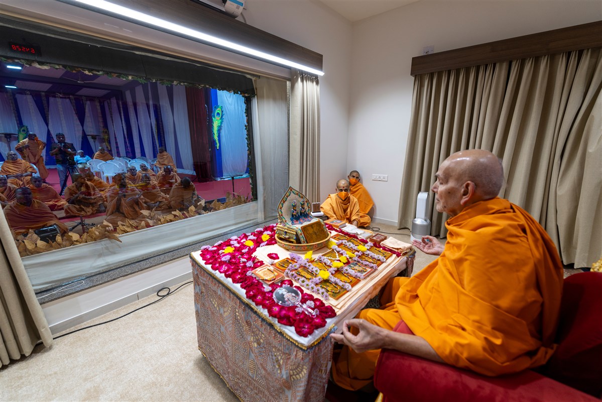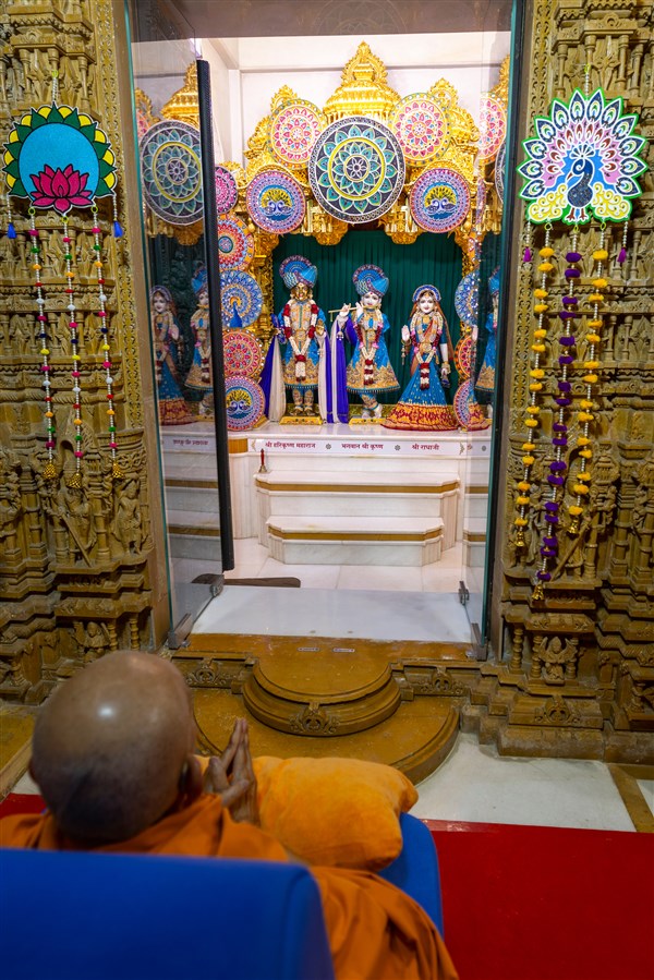 Swamishri engrossed in darshan of Shri Harikrishna Maharaj, Bhagwan Shri Krishna and Shri Radhaji