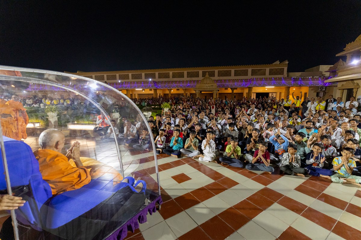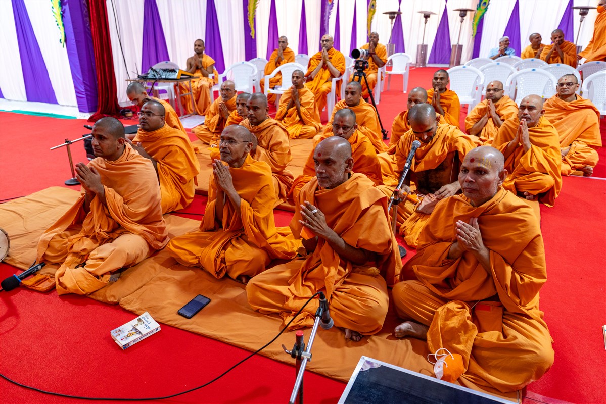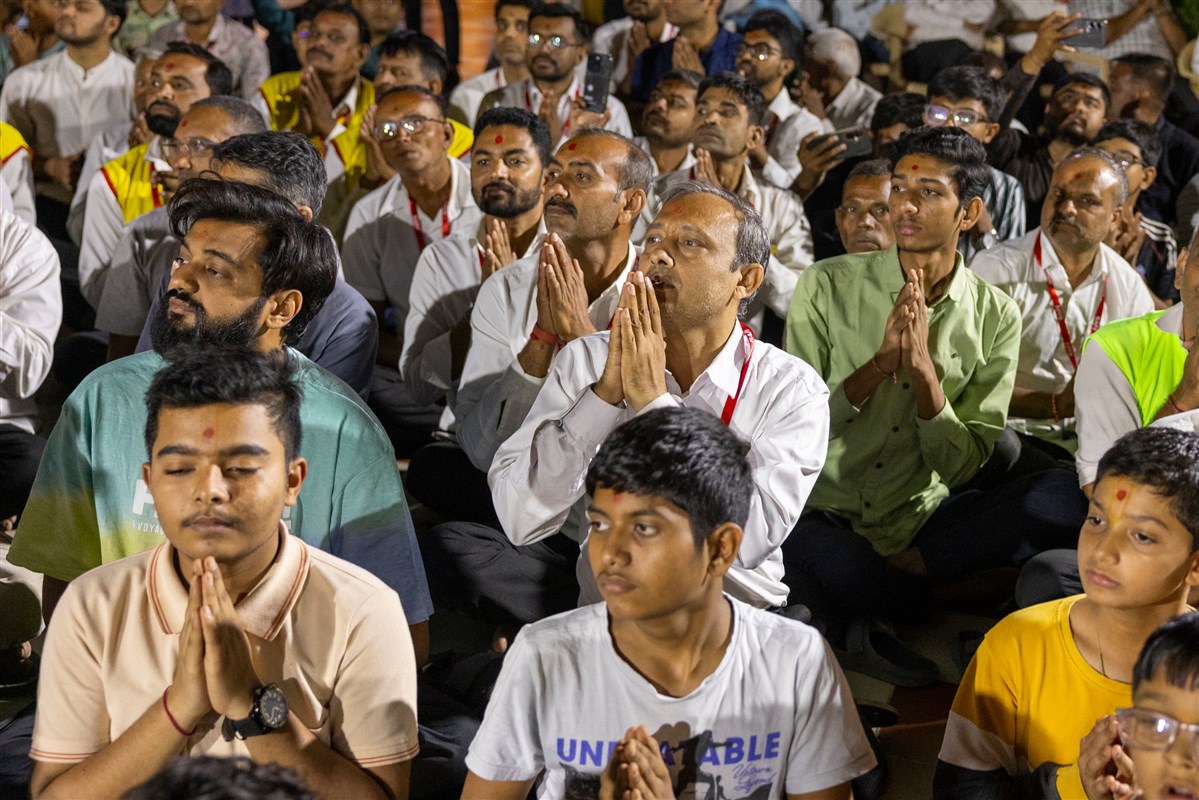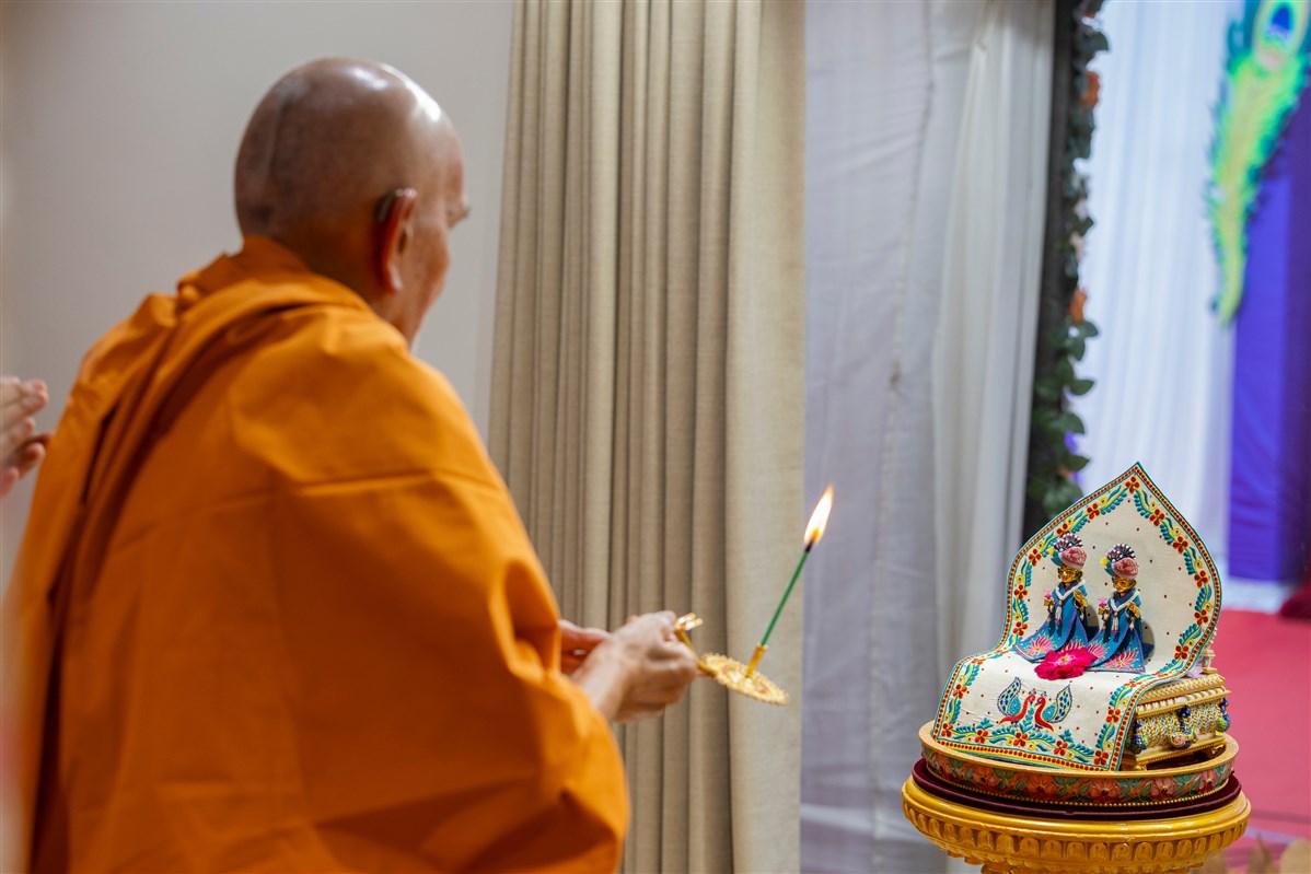 Swamishri engrossed in darshan of Shri Harikrishna Maharaj, Bhagwan Shri Krishna and Shri Radhaji