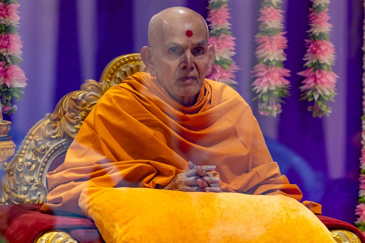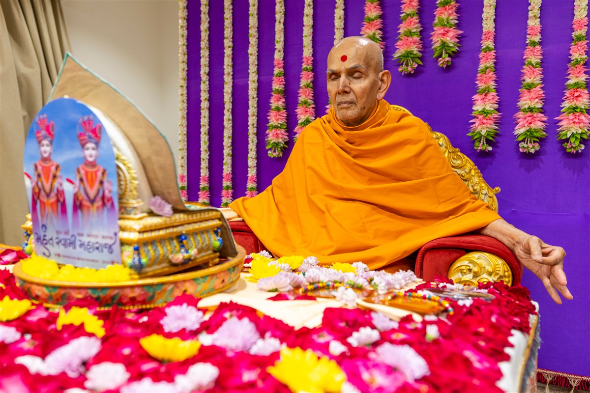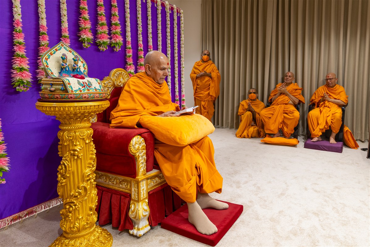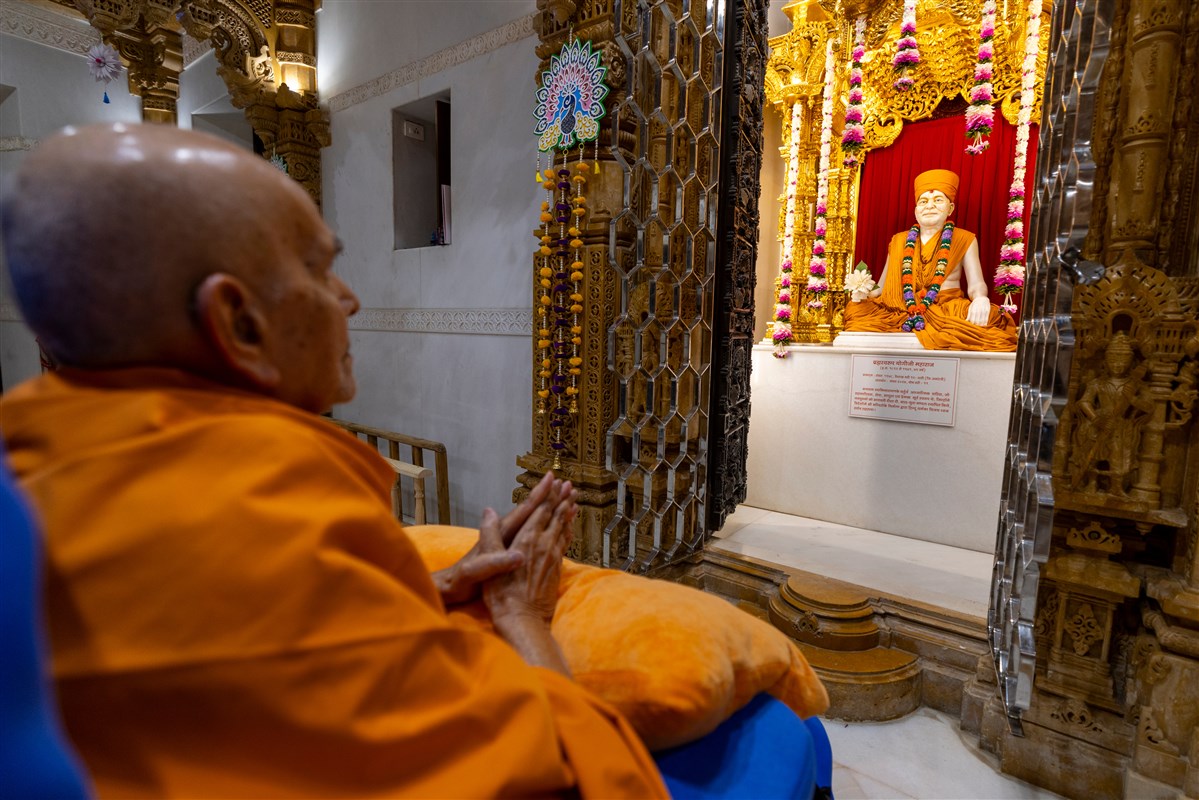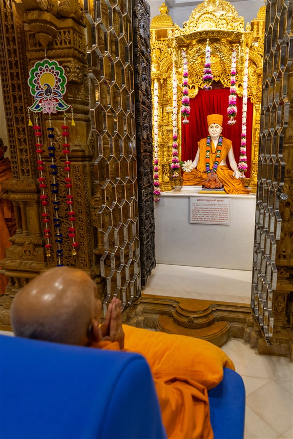 Swamishri engrossed in darshan of Shri Harikrishna Maharaj and Shri Gunatitanand Swami Maharaj
