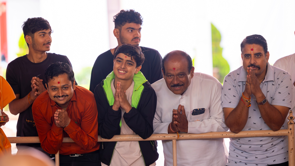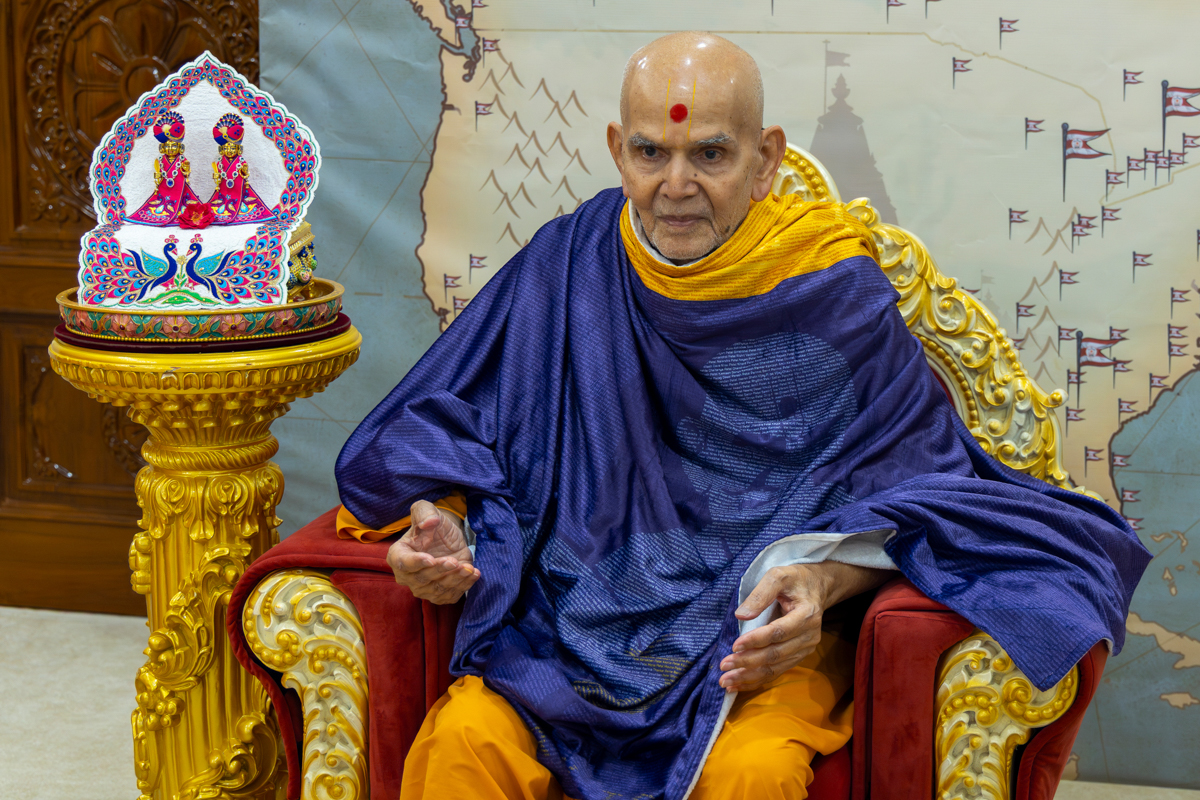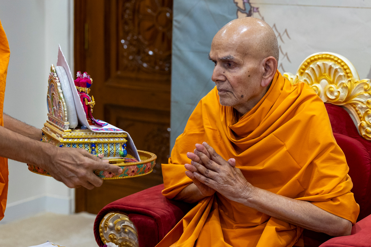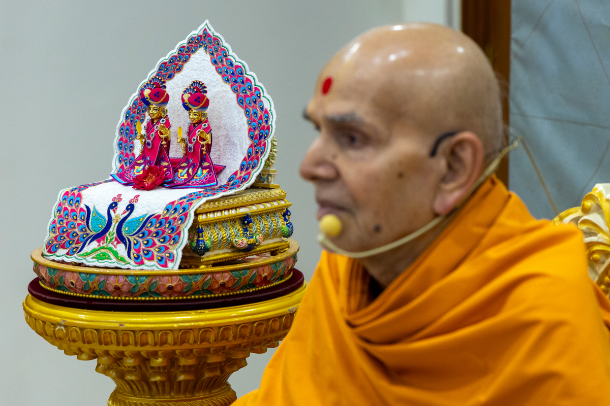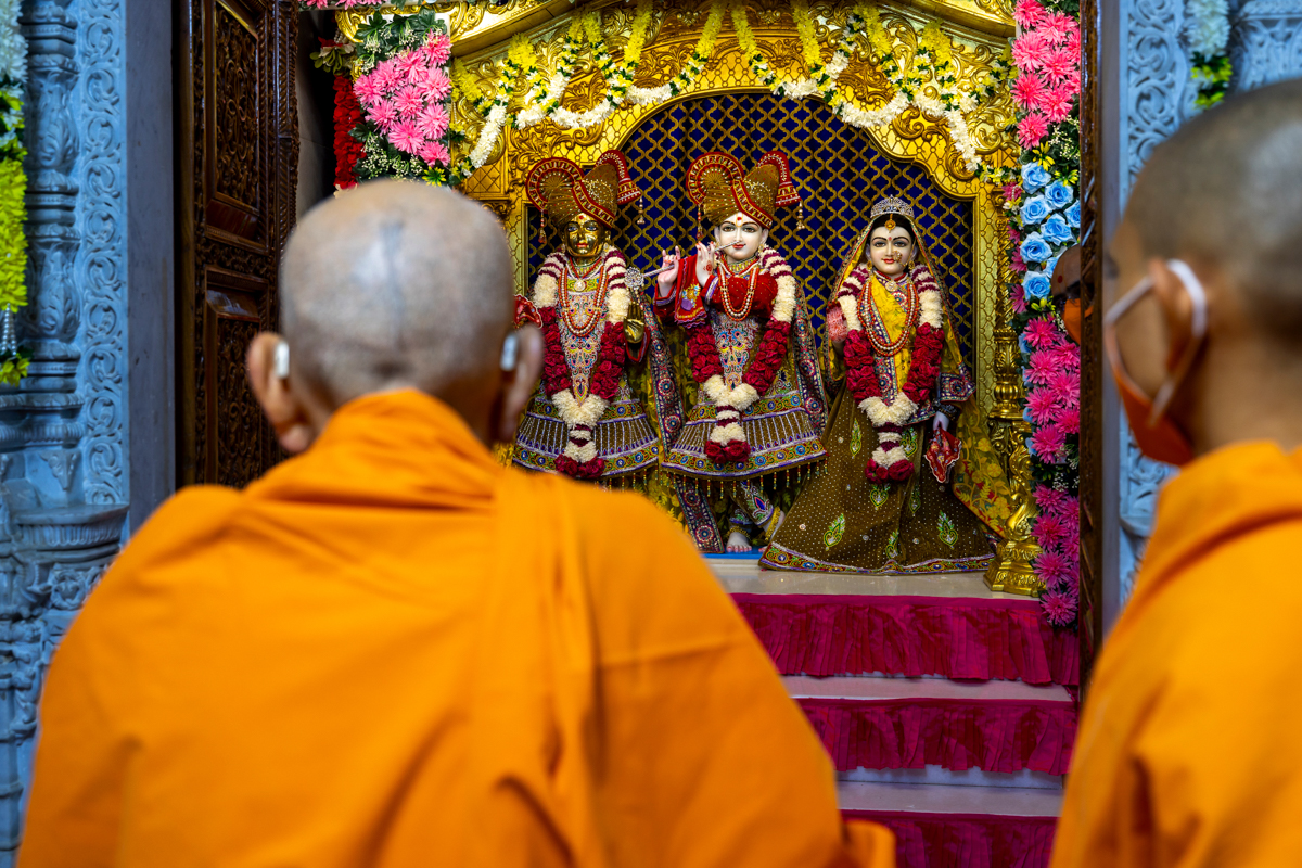 Swamishri engrossed in darshan of Shri Harikrishna Maharaj, Bhagwan Shri Govind Devji and Shri Radhaji