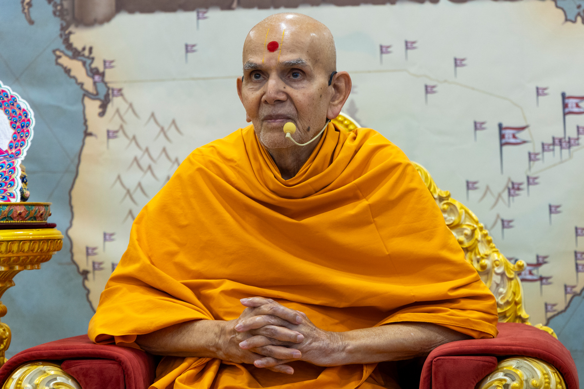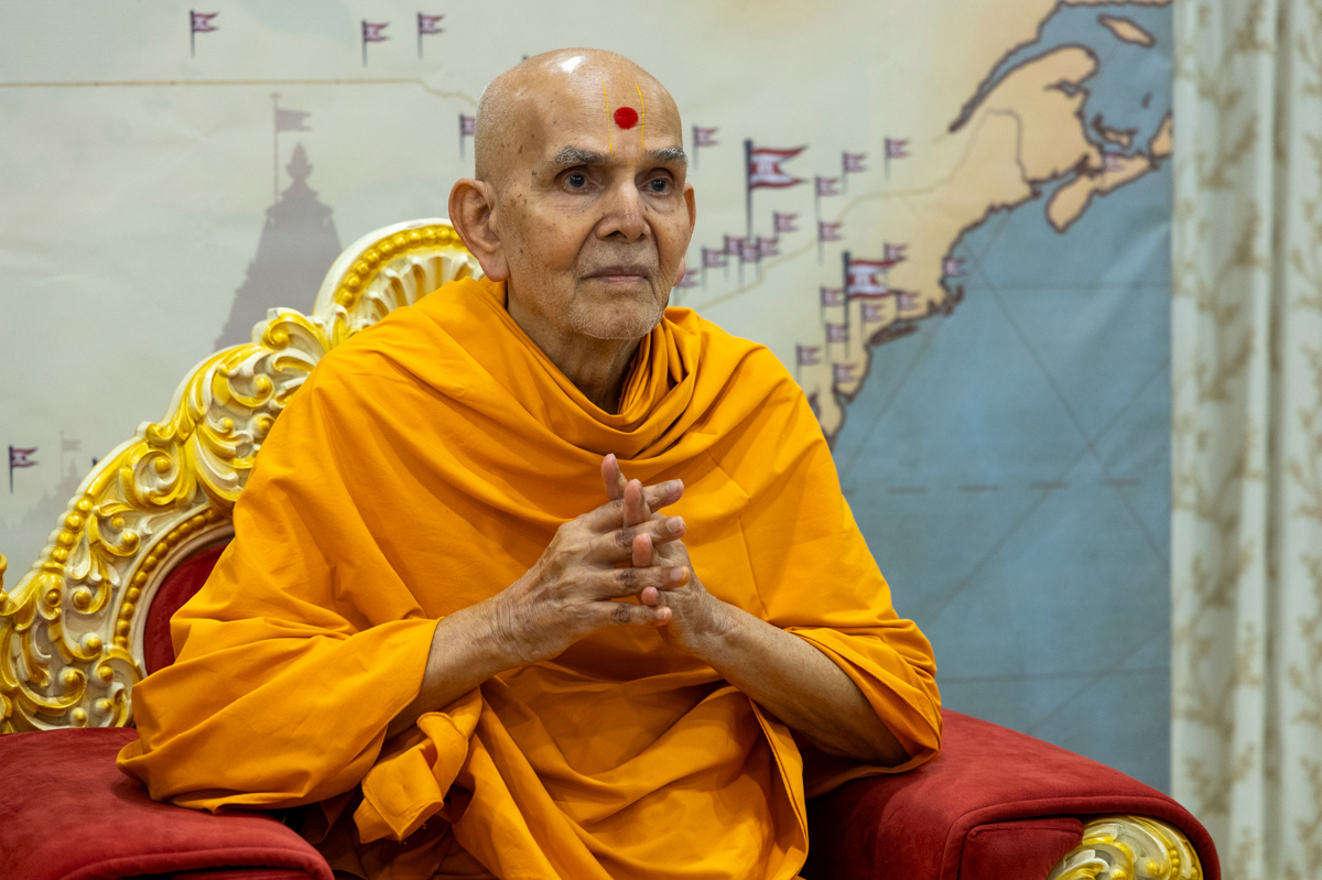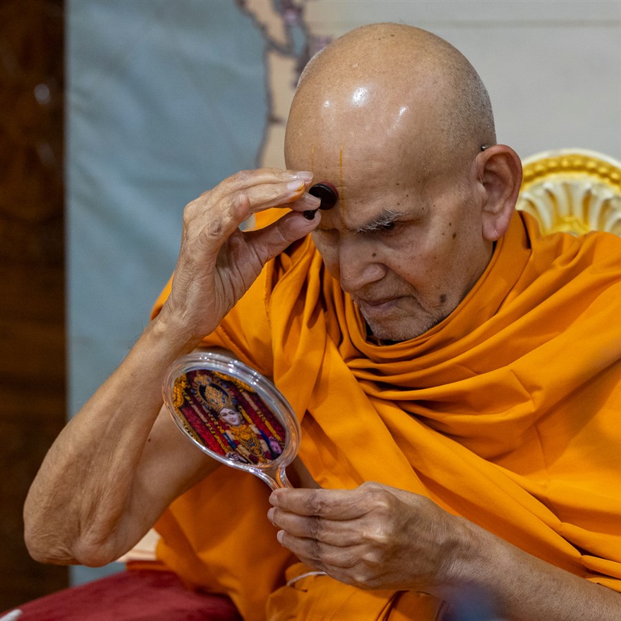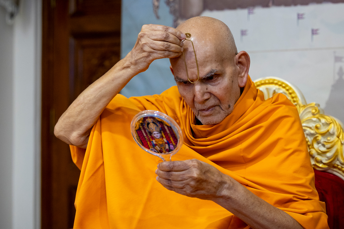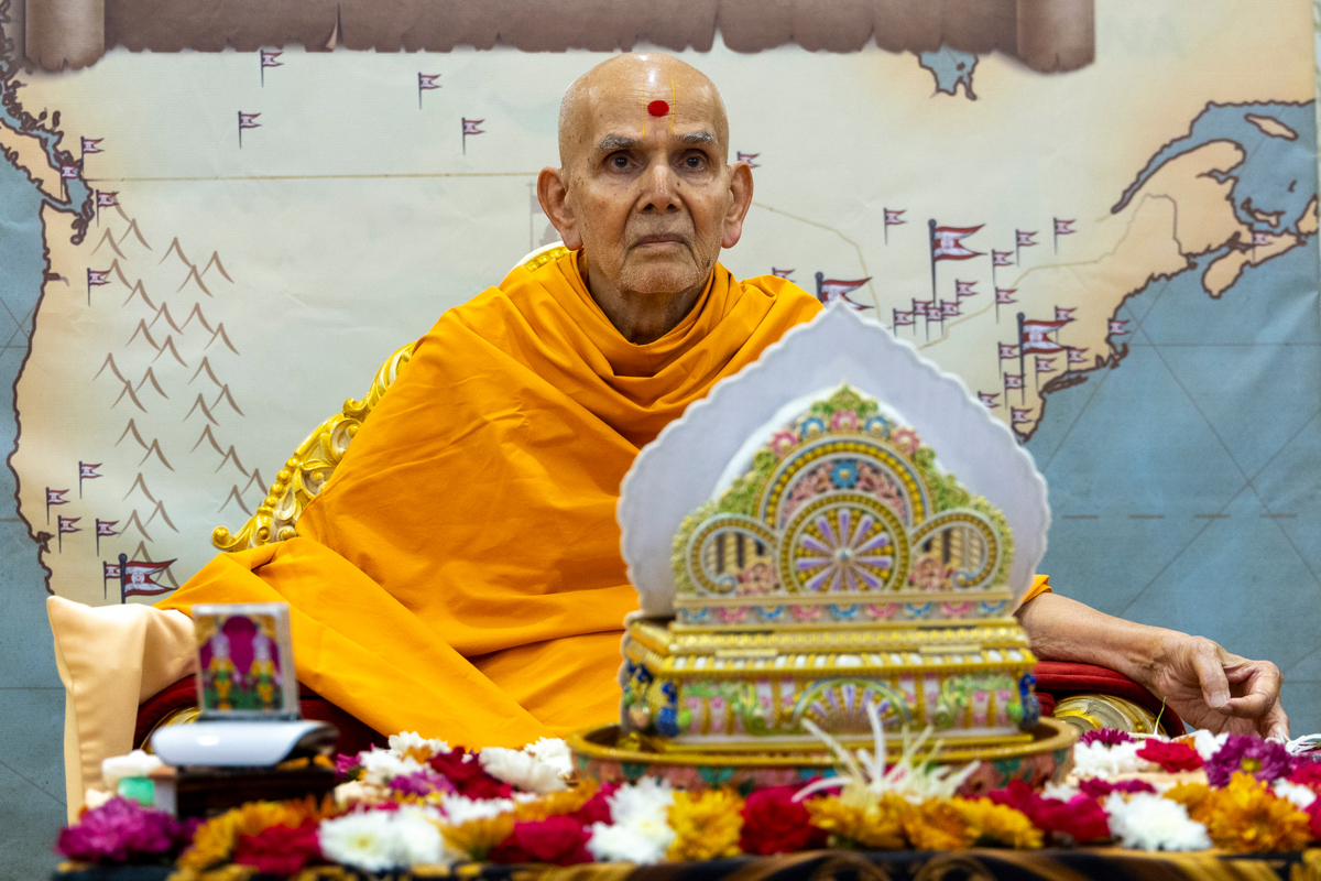 Swamishri engrossed in darshan of Shri Harikrishna Maharaj and Shri Gunatitanand Swami Maharaj