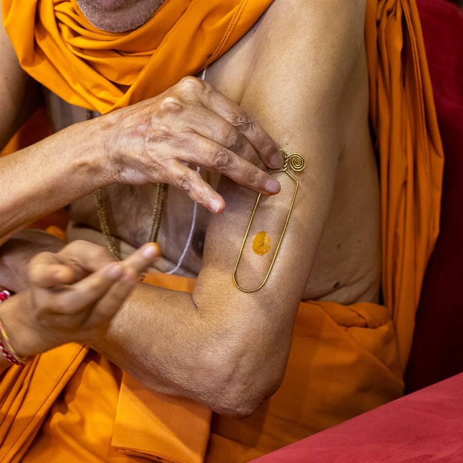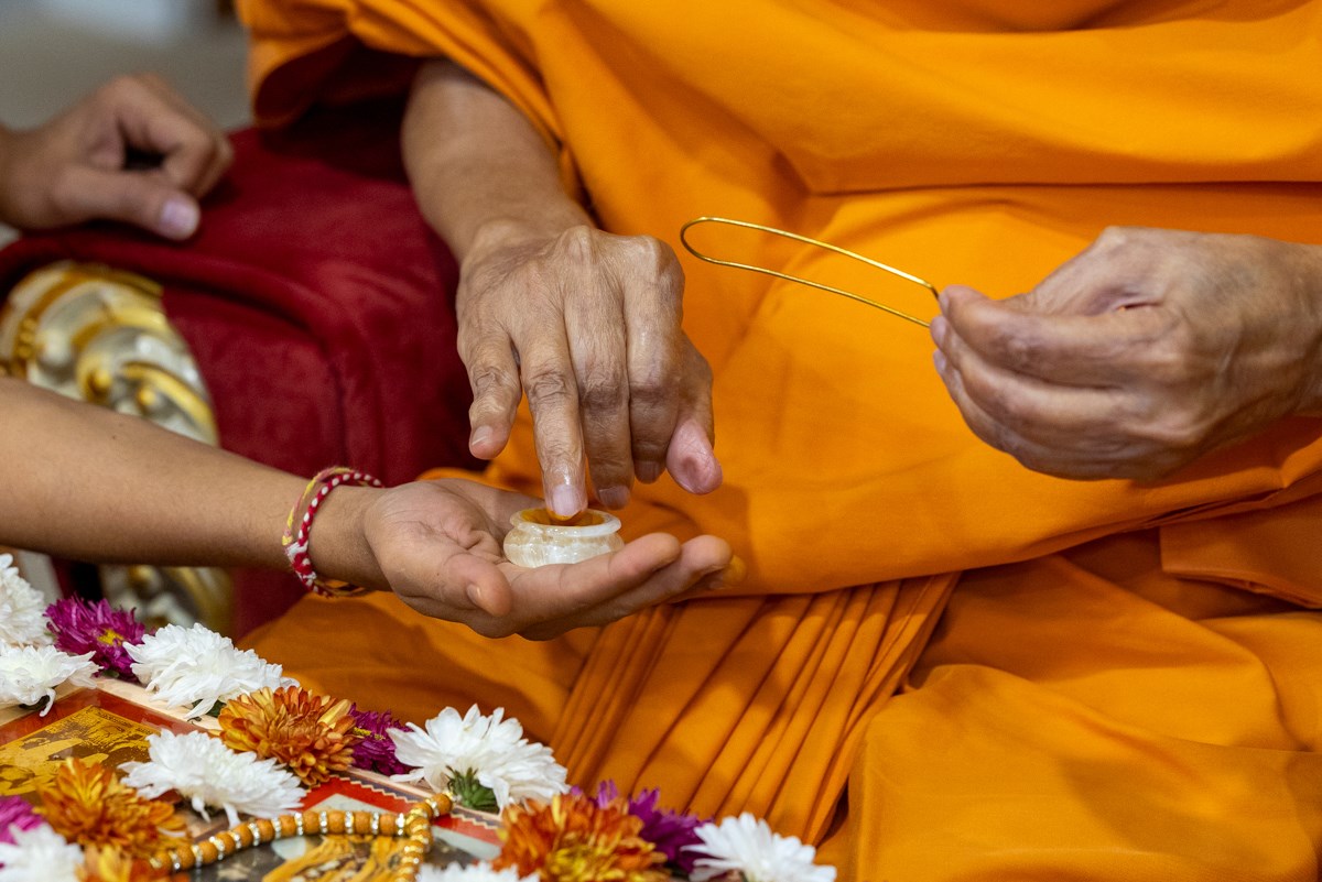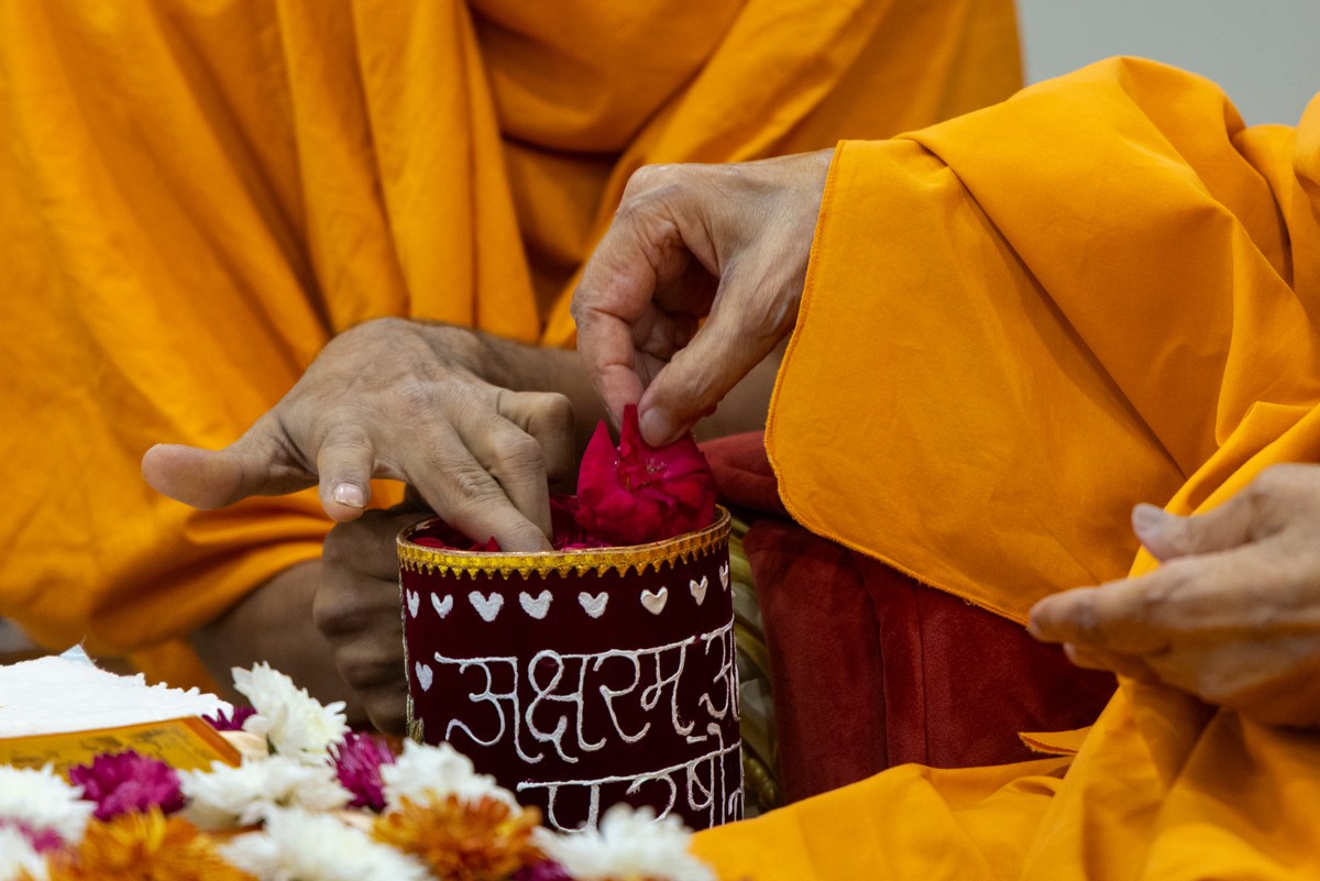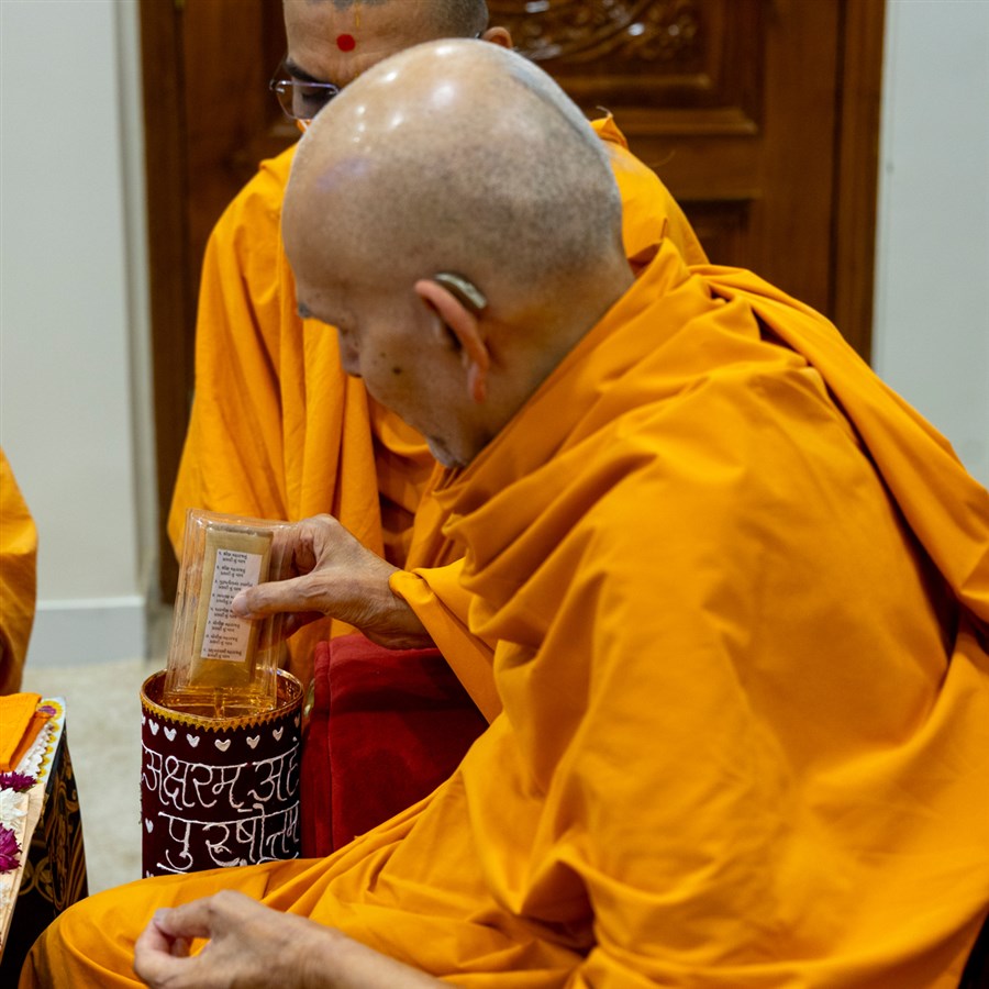 Swamishri sanctifies water with the holy relics of Bhagwan Swaminarayan and the Guru Parampara