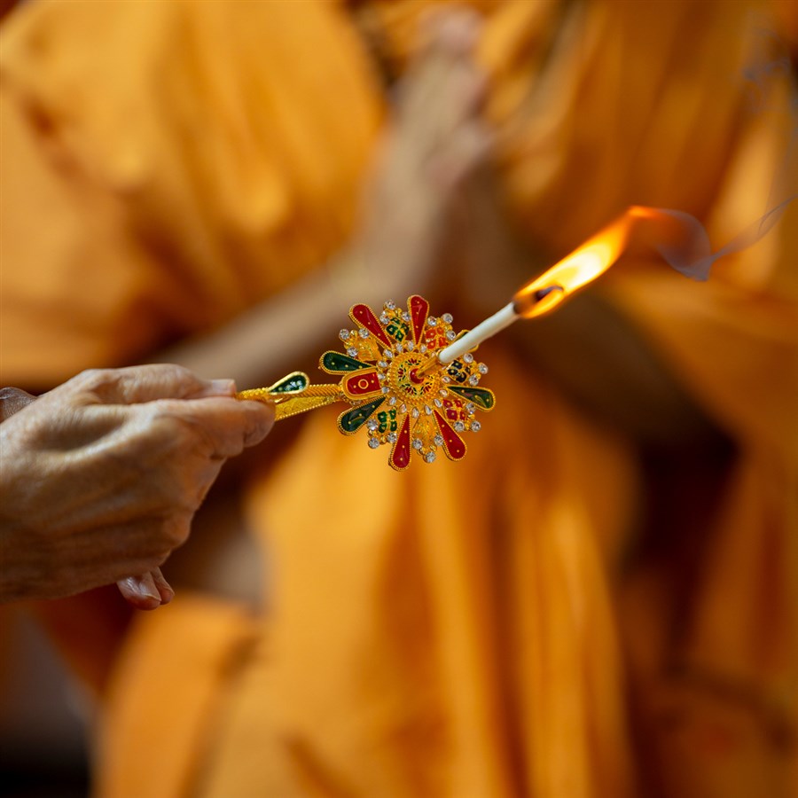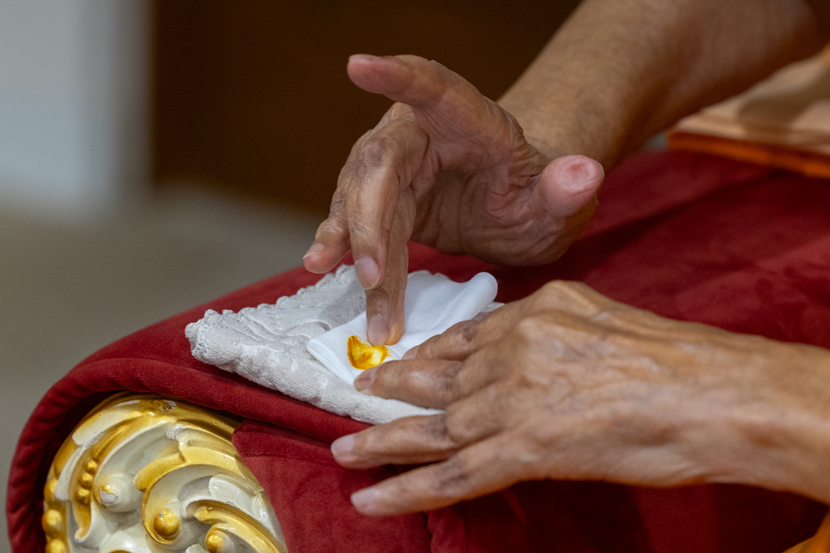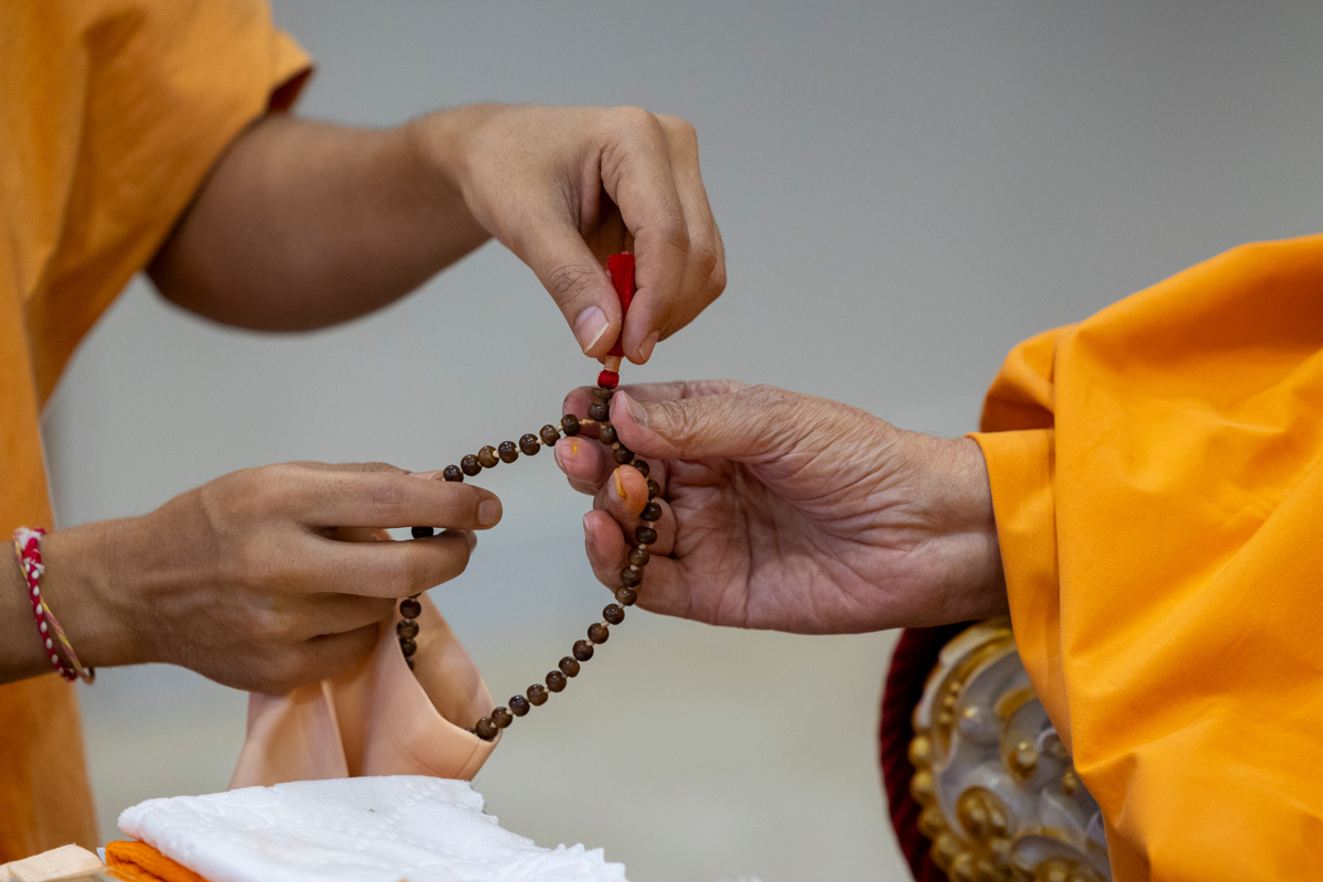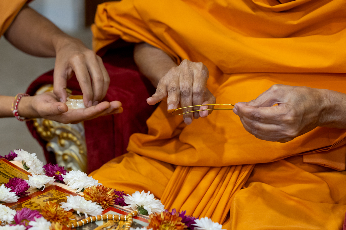 Swamishri sanctifies water with the holy relics of Bhagwan Swaminarayan and the Guru Parampara